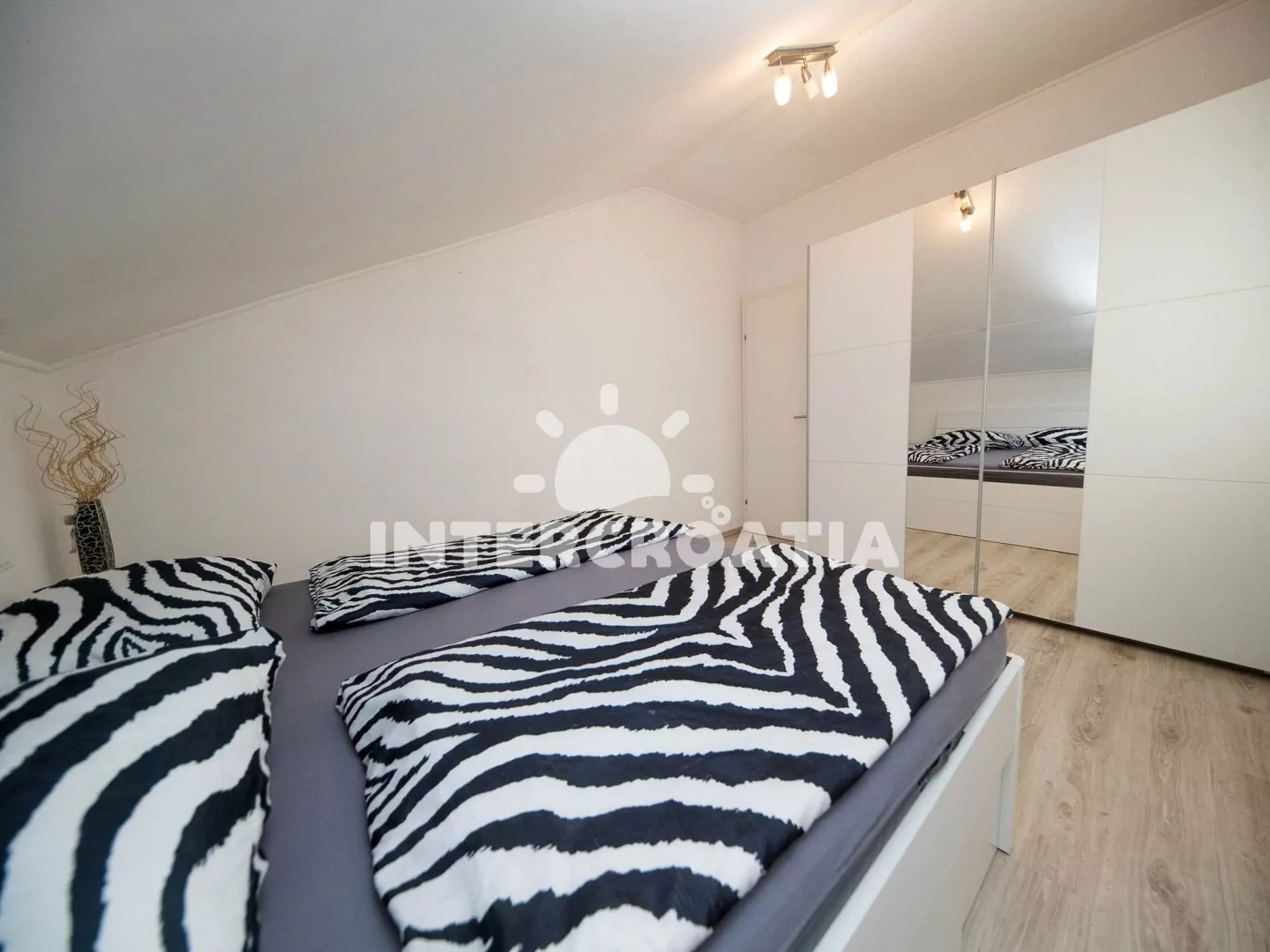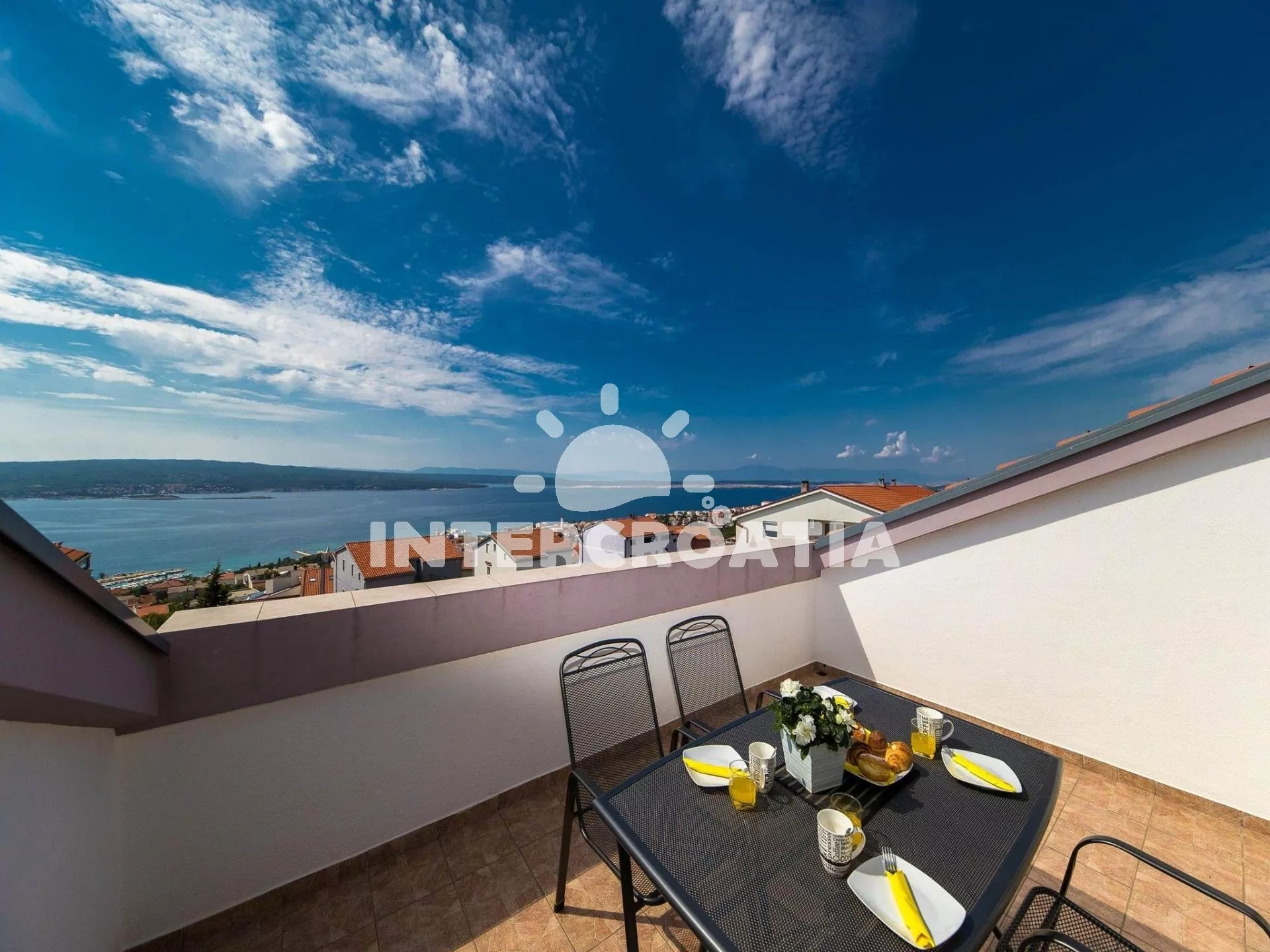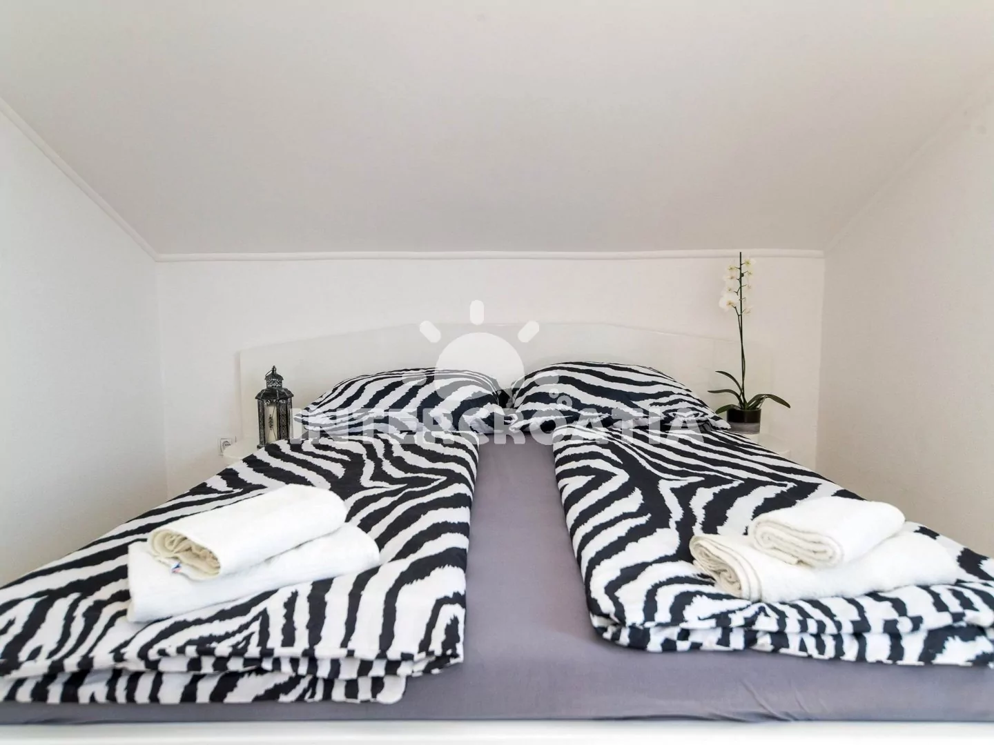 Podkrovní apartmán (90 m2) se střešní terasou a výhledem na moře je vhodný pro 4 osoby. Obývací pokoj je spojený s kuchyní. Kuchyňská linka je vybavena sklokeramickou varnou deskou, vestavěnou troubou, digestoří, rychlovarnou konvicí, mikrovlnnou troubou, kávovarem, toustovačem, nádobím a lednicí s mrazákem. Obývací pokoj se sedací soupravou s pohovkou, televizí se satelitním programem, radiem, klimatizací a vstupem na terasu. První i druhá ložnice je vybavena s dvoulůžkem. Koupelna se sprchovým koutem, umyvadlem, bidetem a wc. Dále samostatné wc s umyvadlem. Hostům je k dispozici parkování u objektu zdarma.