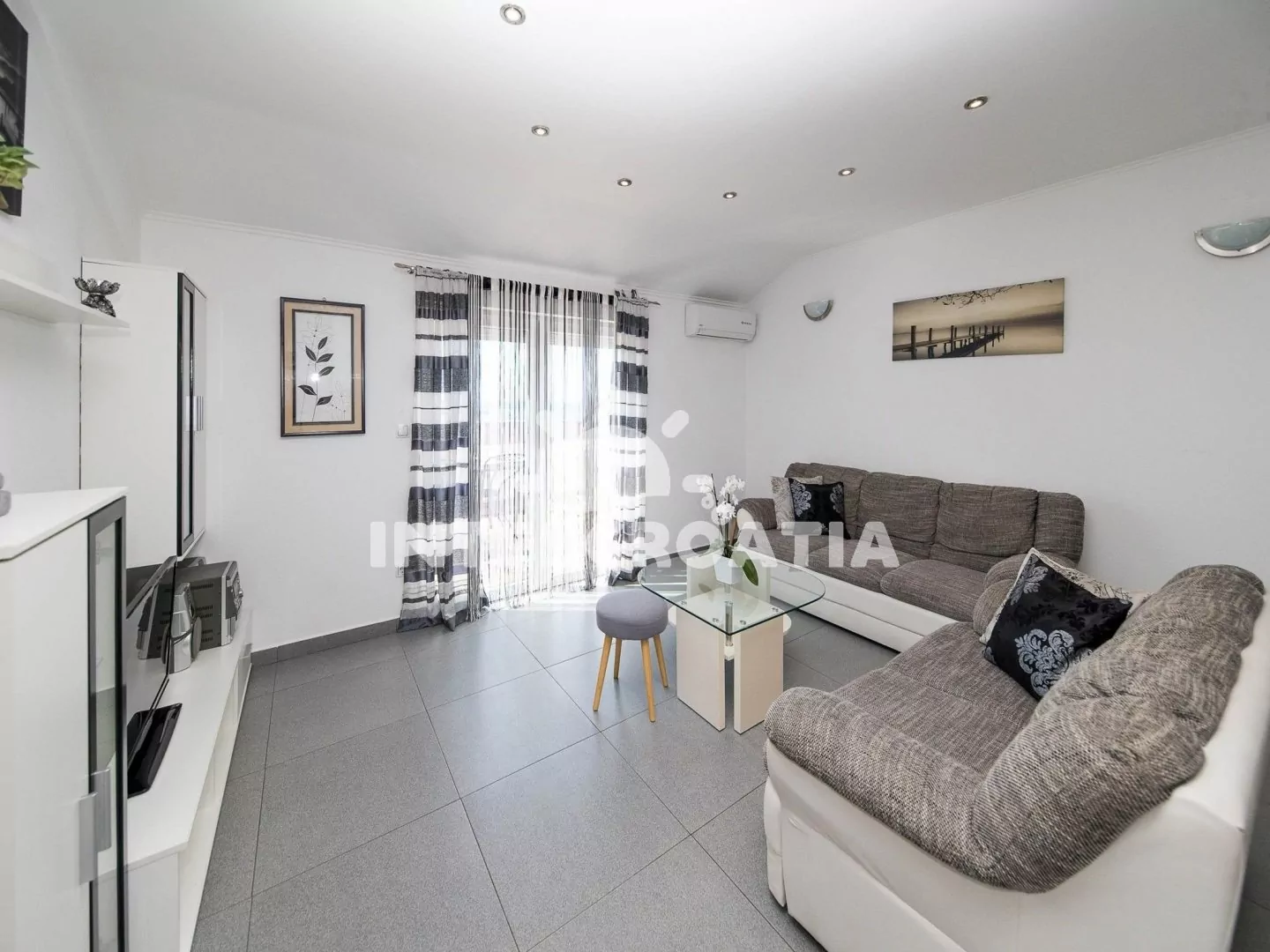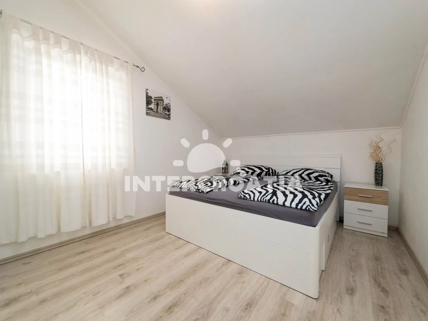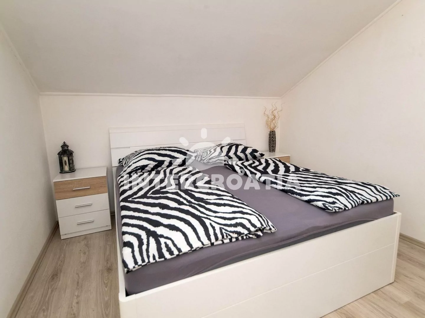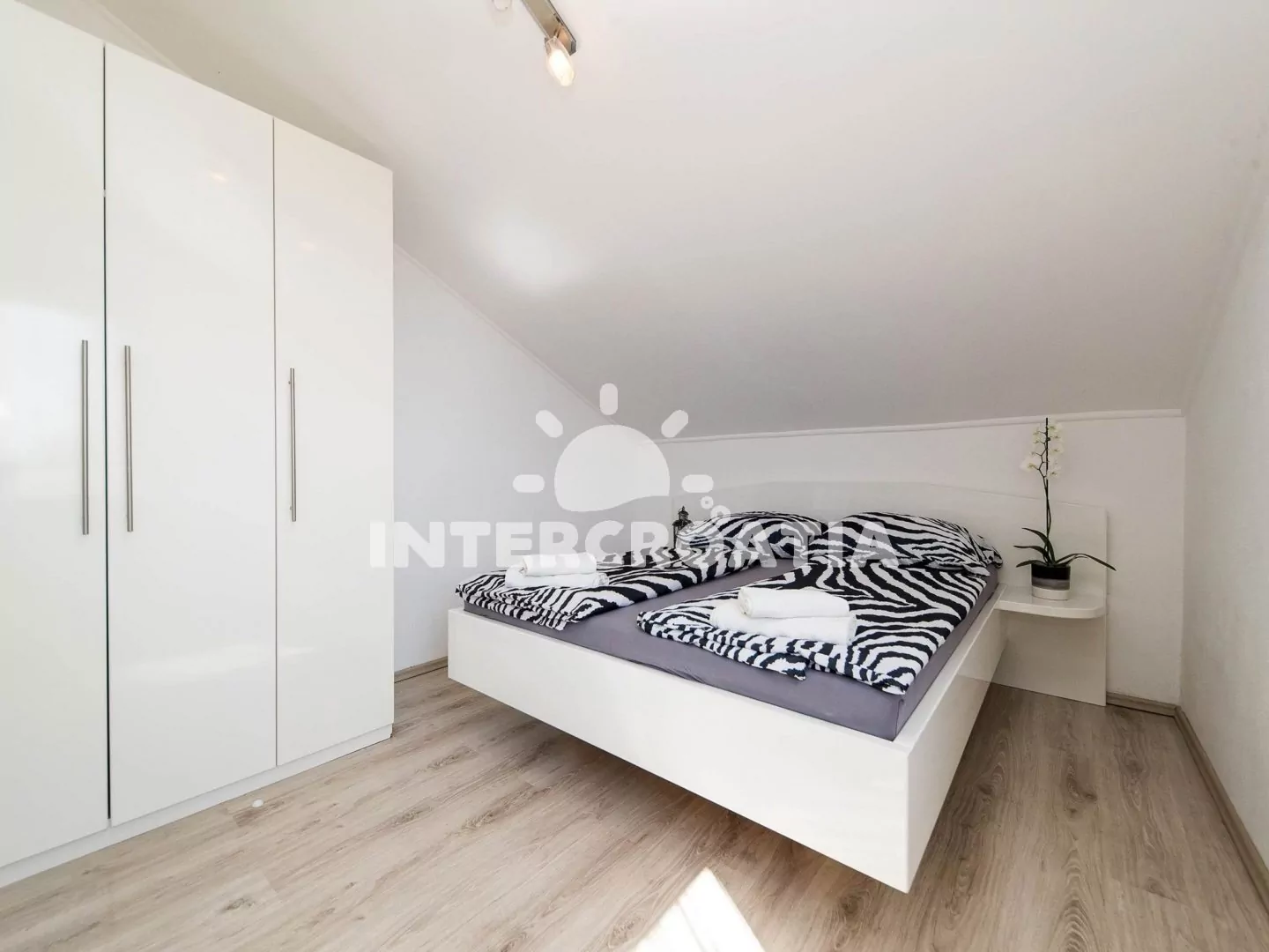 Podkrovní apartmán (90 m2) se střešní terasou a výhledem na moře je vhodný pro 4 osoby. Obývací pokoj je spojený s kuchyní. Kuchyňská linka je vybavena sklokeramickou varnou deskou, vestavěnou troubou, digestoří, rychlovarnou konvicí, mikrovlnnou troubou, kávovarem, toustovačem, nádobím a lednicí s mrazákem. Obývací pokoj se sedací soupravou s pohovkou, televizí se satelitním programem, radiem, klimatizací a vstupem na terasu. První i druhá ložnice je vybavena s dvoulůžkem. Koupelna se sprchovým koutem, umyvadlem, bidetem a wc. Dále samostatné wc s umyvadlem. Hostům je k dispozici parkování u objektu zdarma.
