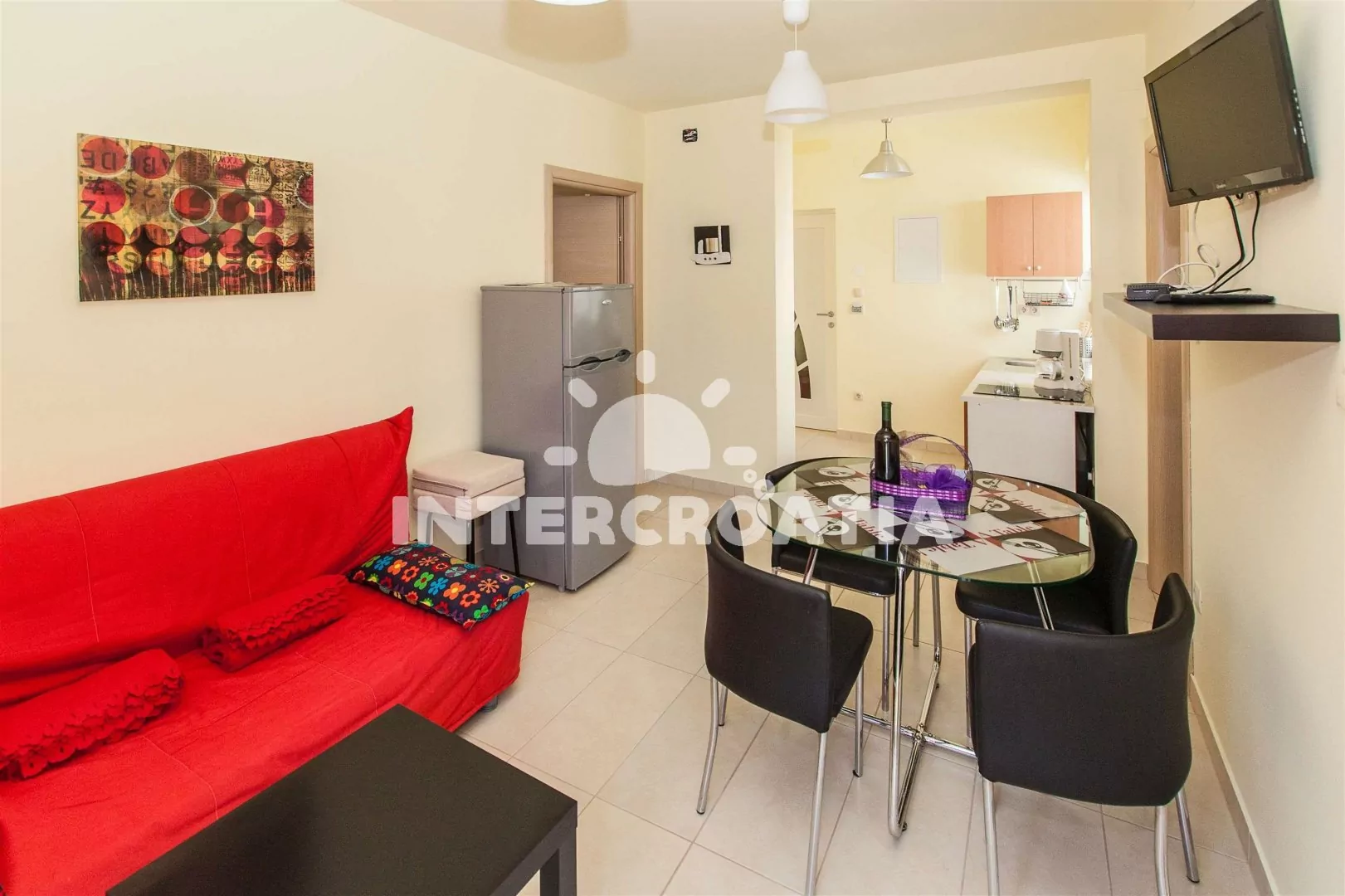 Apartmán (40 m2) s vlastním balkonem a výhledem do ulice, se nachází ve 3. patře domu a je vhodný pro až 4 osoby. Obývací pokoj je spojený s kuchyní. Kuchyňská linka je vybavena se sklokeramickou…