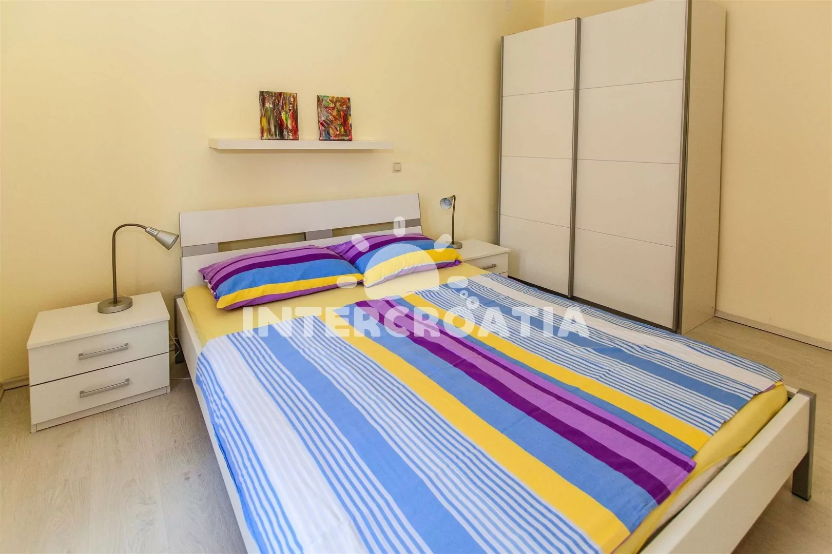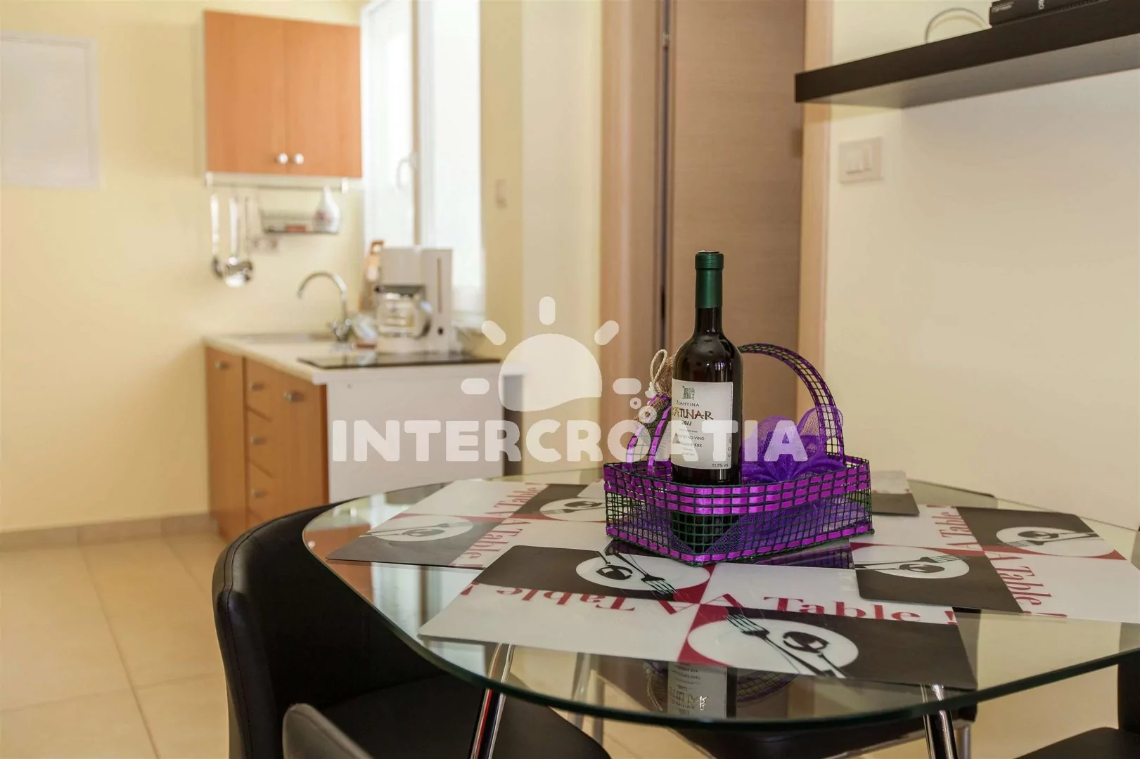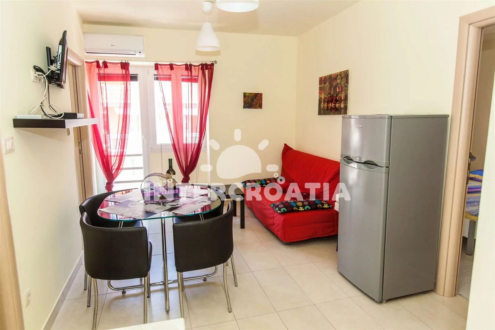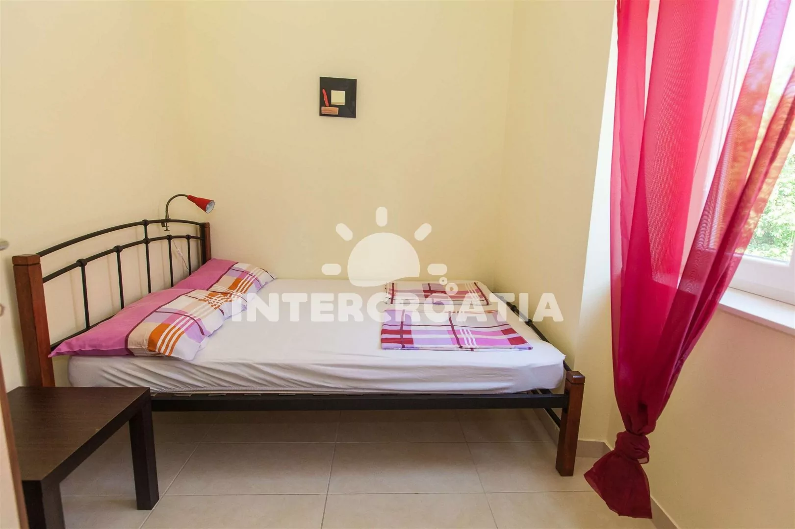 Apartmán (40 m2) s vlastním balkonem a výhledem do ulice, se nachází ve 3. patře domu a je vhodný pro až 4 osoby. Obývací pokoj je spojený s kuchyní. Kuchyňská linka je vybavena se sklokeramickou varnou deskou, rychlovarnou konvicí, kávovarem, nádobím a lednicí s mrazákem. Obývací pokoj s jídelním stolem pro 4 osoby, pohovkou, televizí se satelitním programem, klimatizací a vstupem na balkon. První i druhá ložnice je vybavena dvoulůžkem. Koupelna se sprchovým koutem, umyvadlem, pračkou, bidetem a wc. Vzhledem k umístění objektu, přímo v centru města je možné parkování, na zpoplatněném parkovišti 200 m od objektu (cca 7 €/den).