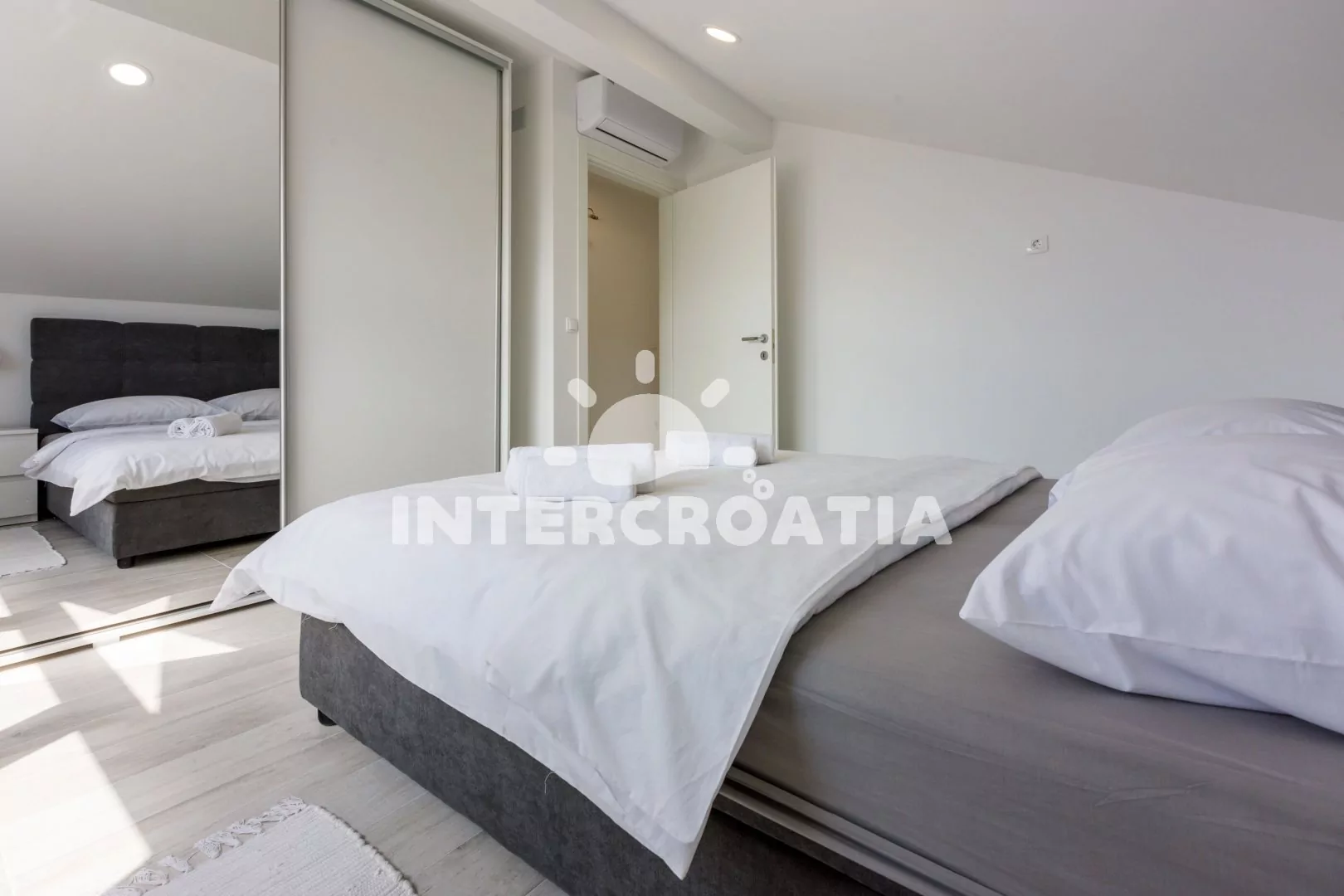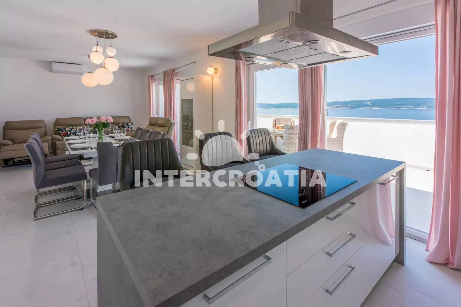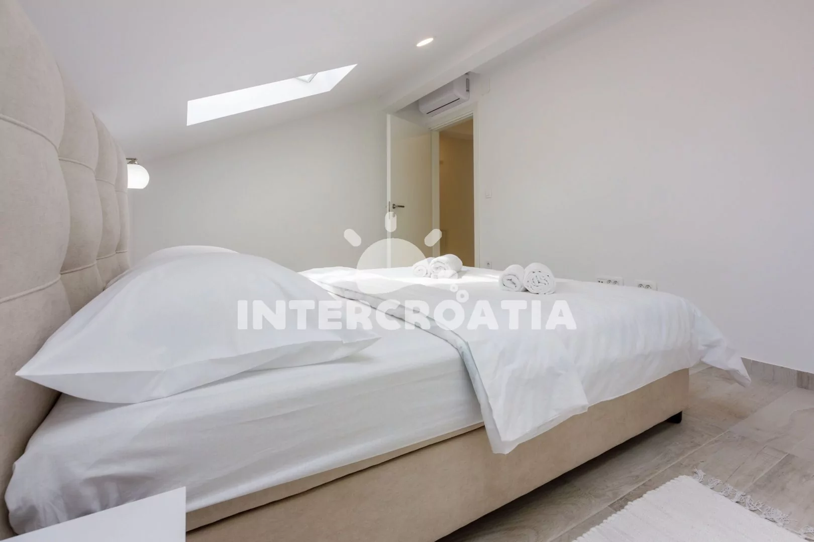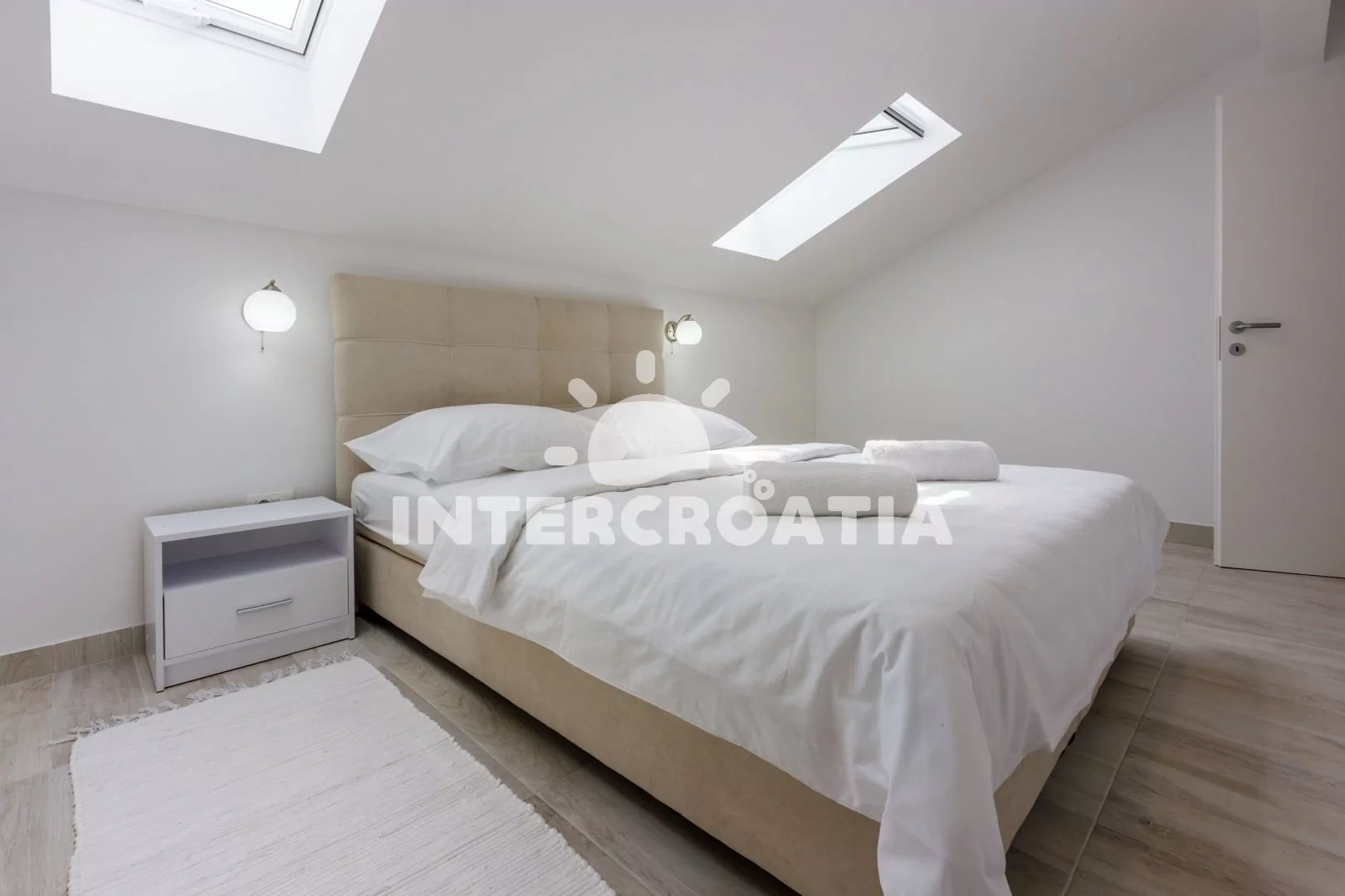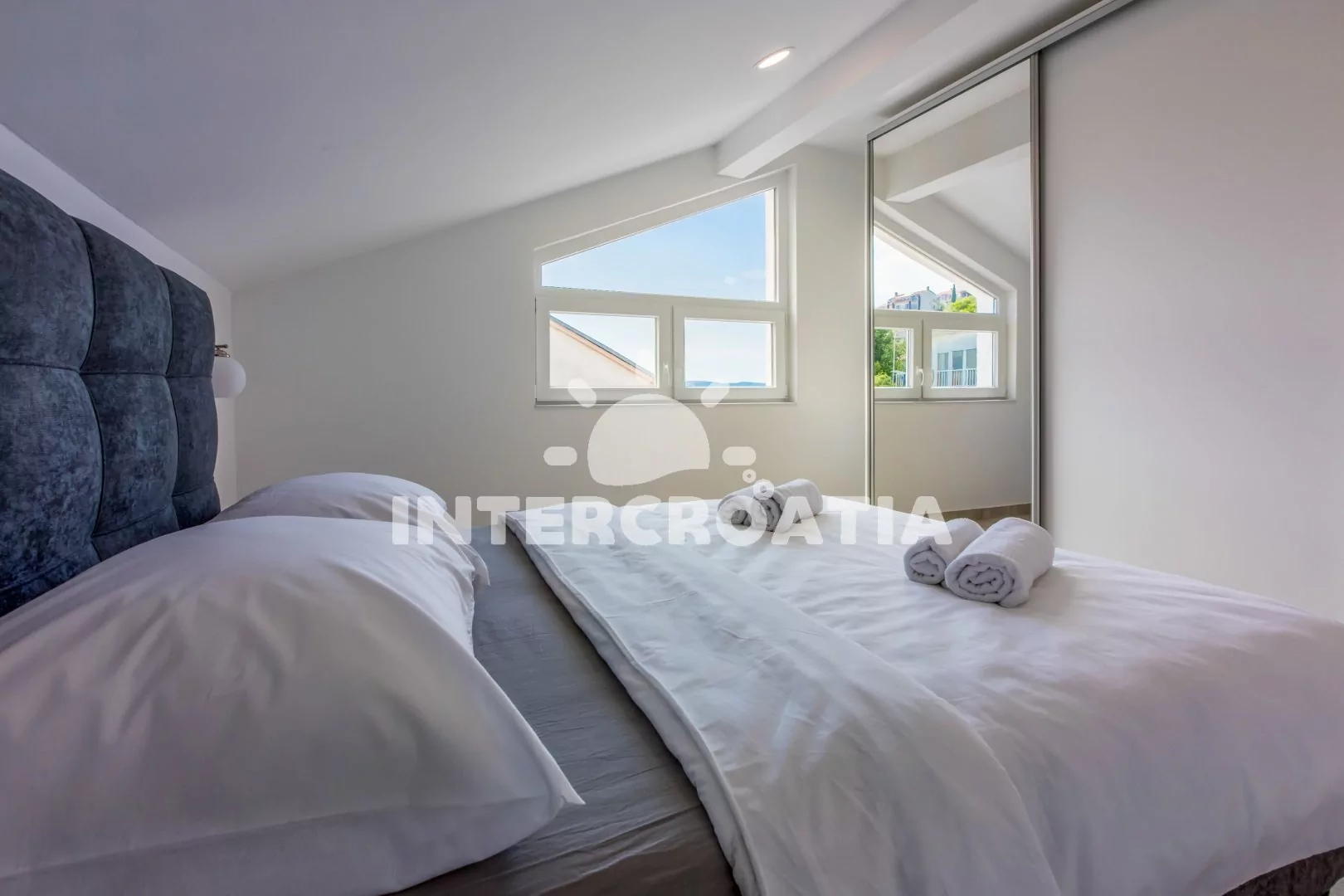 Luxusní a prostorný apartmán (125 m2) v podkroví domu, s terasou a výhledem na moře je vhodný pro 8 osob. Obývací pokoj je spojený s kuchyní. Kuchyňská linka je vybavena sklokeramickou varnou deskou,…