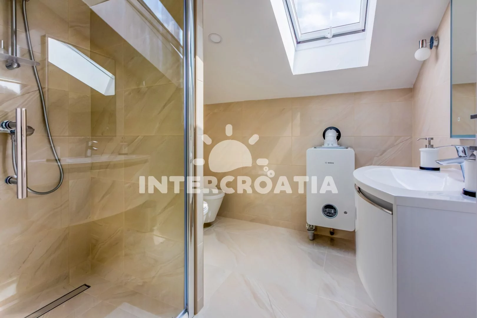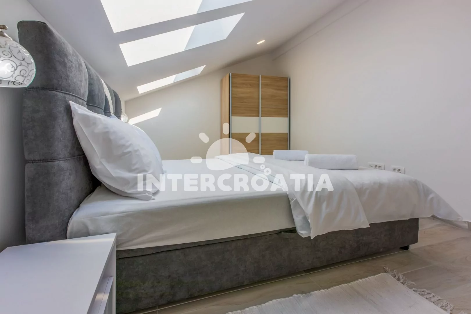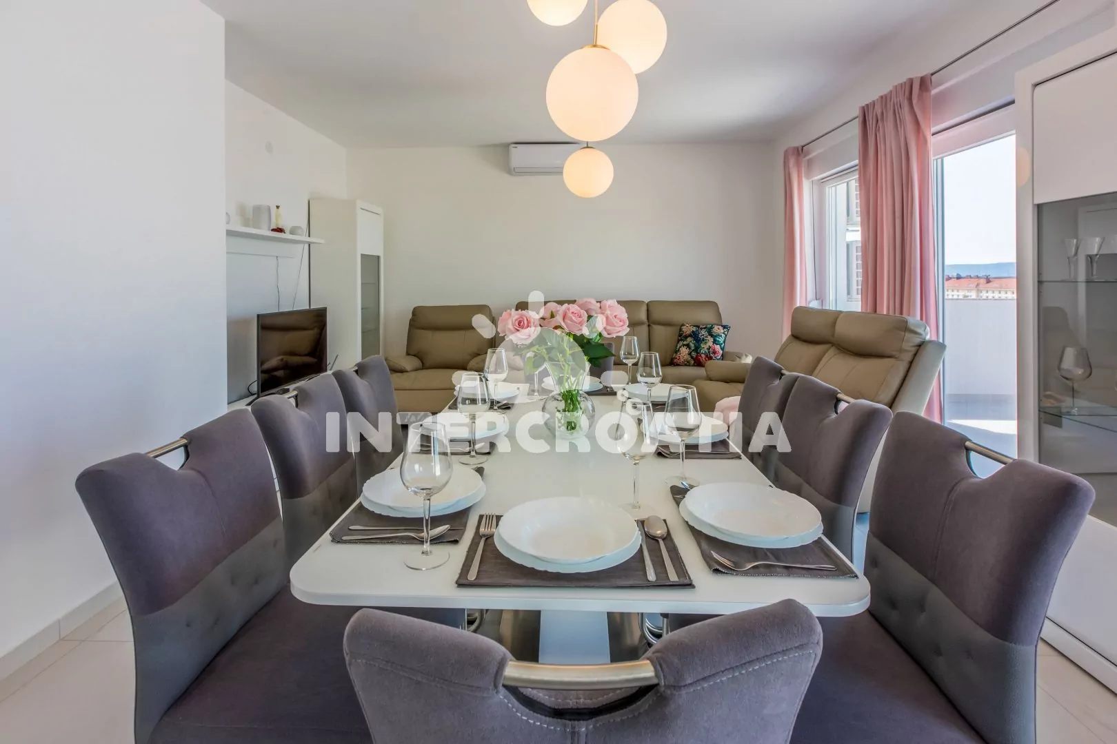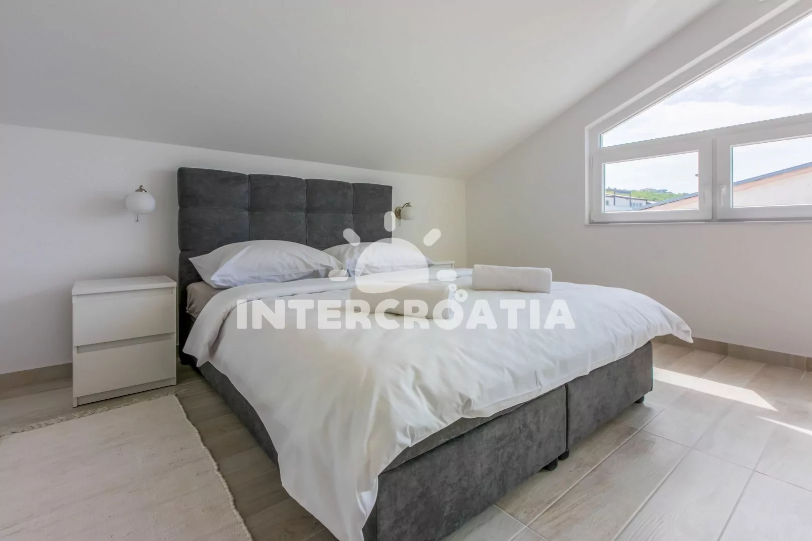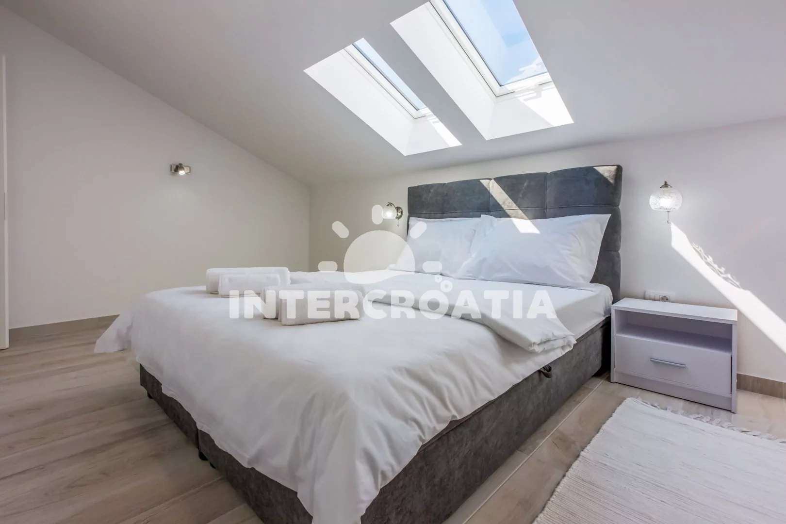 Luxusní a prostorný apartmán (125 m2) v podkroví domu, s terasou a výhledem na moře je vhodný pro 8 osob. Obývací pokoj je spojený s kuchyní. Kuchyňská linka je vybavena sklokeramickou varnou deskou,…