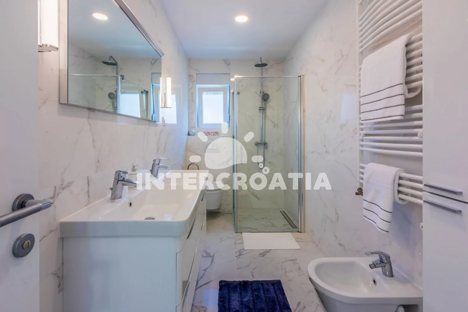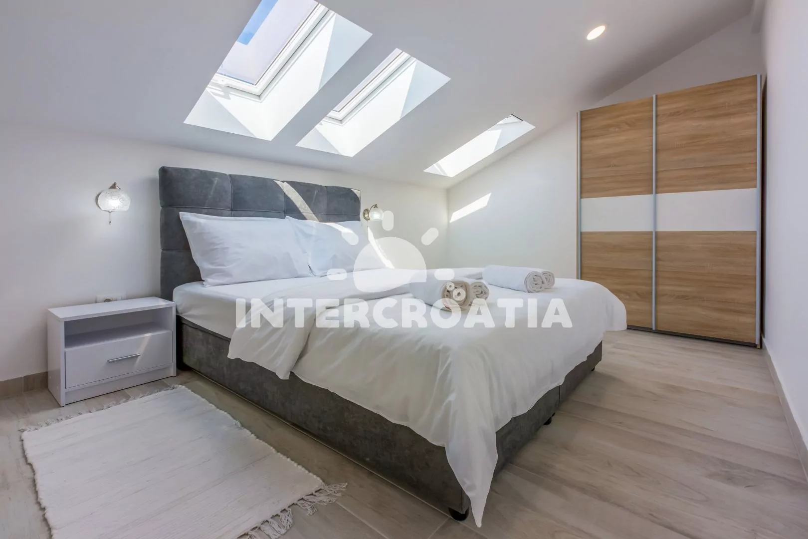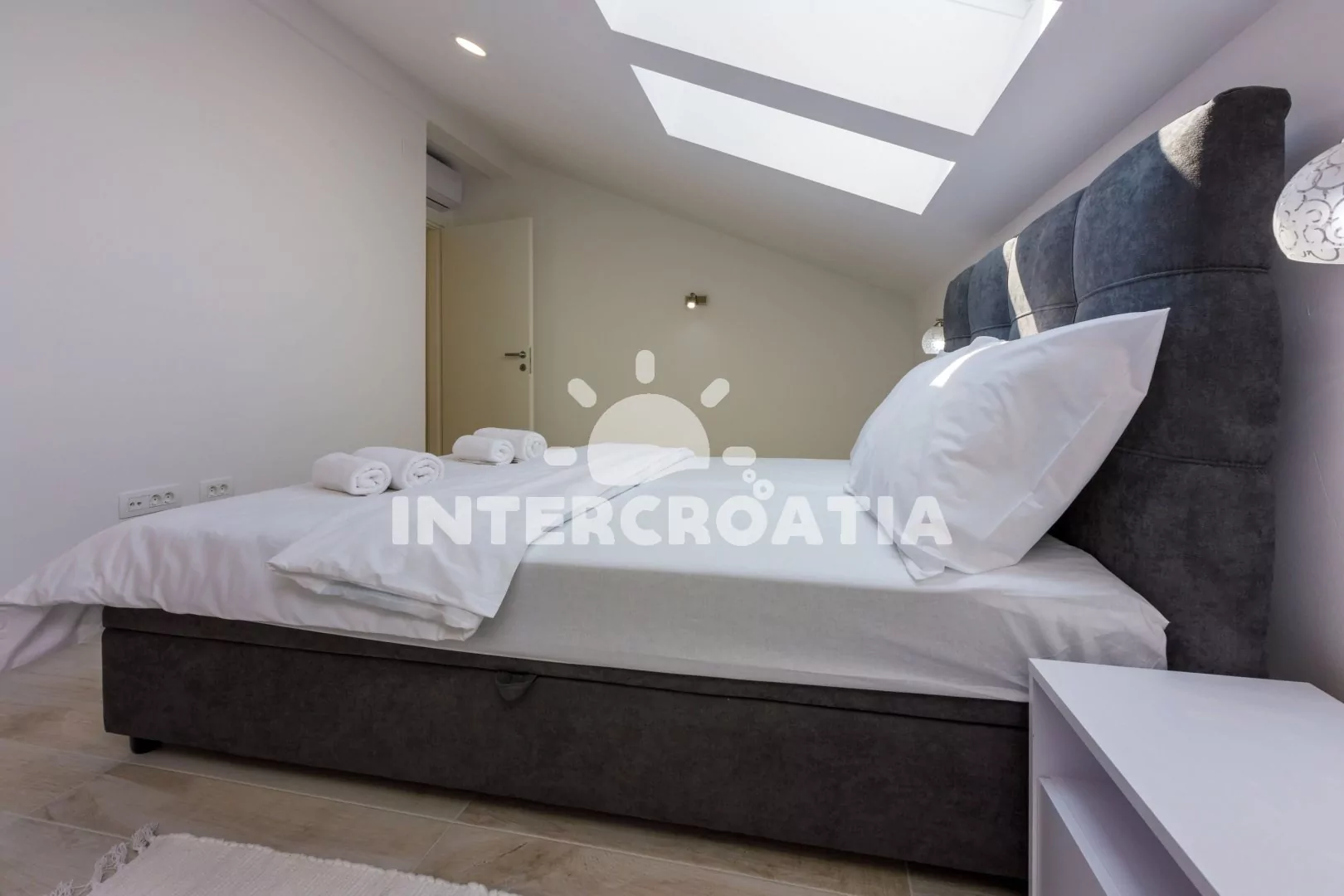 Luxusní a prostorný apartmán (125 m2) v podkroví domu, s terasou a výhledem na moře je vhodný pro 8 osob. Obývací pokoj je spojený s kuchyní. Kuchyňská linka je vybavena sklokeramickou varnou deskou, digestoří, vestavěnou troubou, myčkou na nádobí, mikrovlnnou troubou, rychlovarnou konvicí, kávovarem, toustovačem, nádobím a lednicí s mrazákem. Obývací pokoj s jídelním stolem pro 8 osob, sedací soupravou s pohovkou, televizí se satelitním programem, klimatizací a vstupem na terasu. Čtyři samostatné ložnice, vybavené dvoulůžkem a klimatizací. Dvě koupelny se sprchovým koutem, umyvadlem, bidetem a wc. Hostům je k dispozici parkování u objektu zdarma.