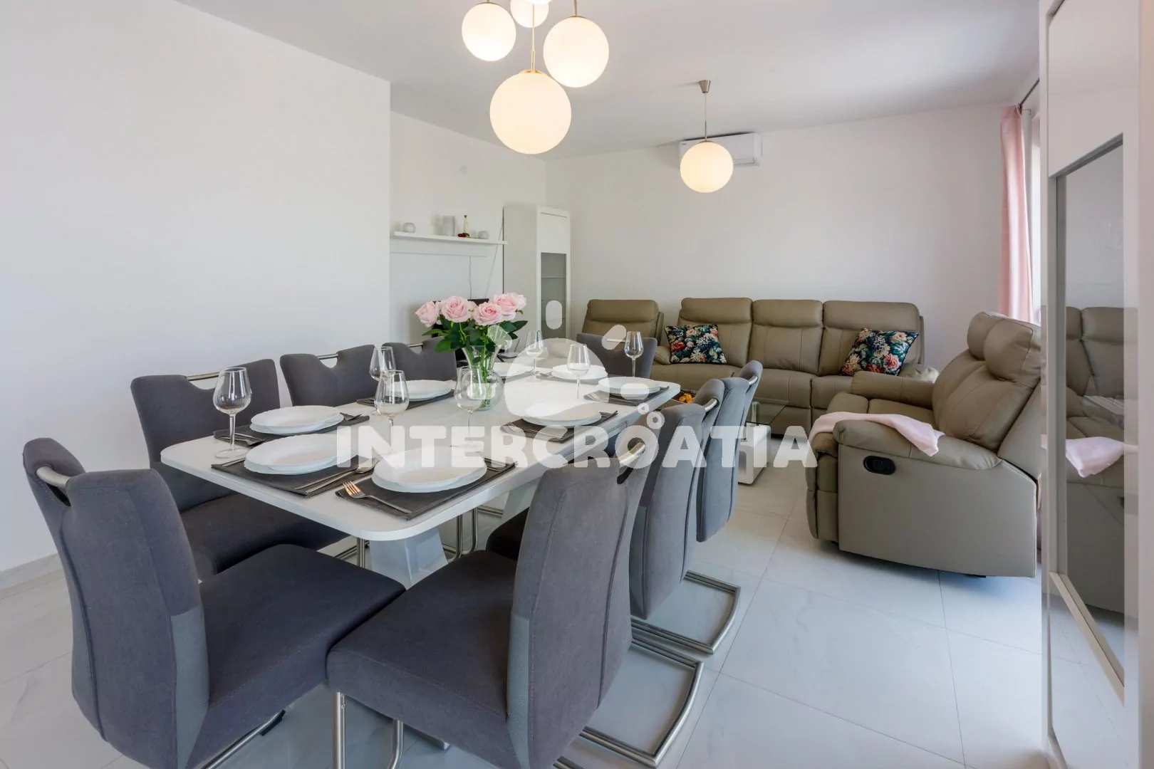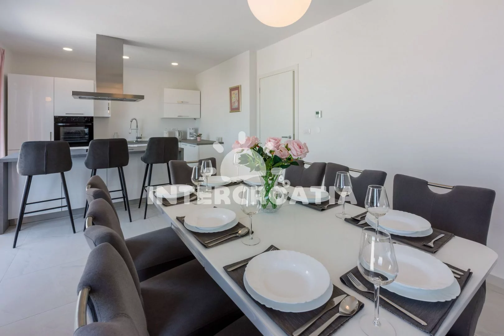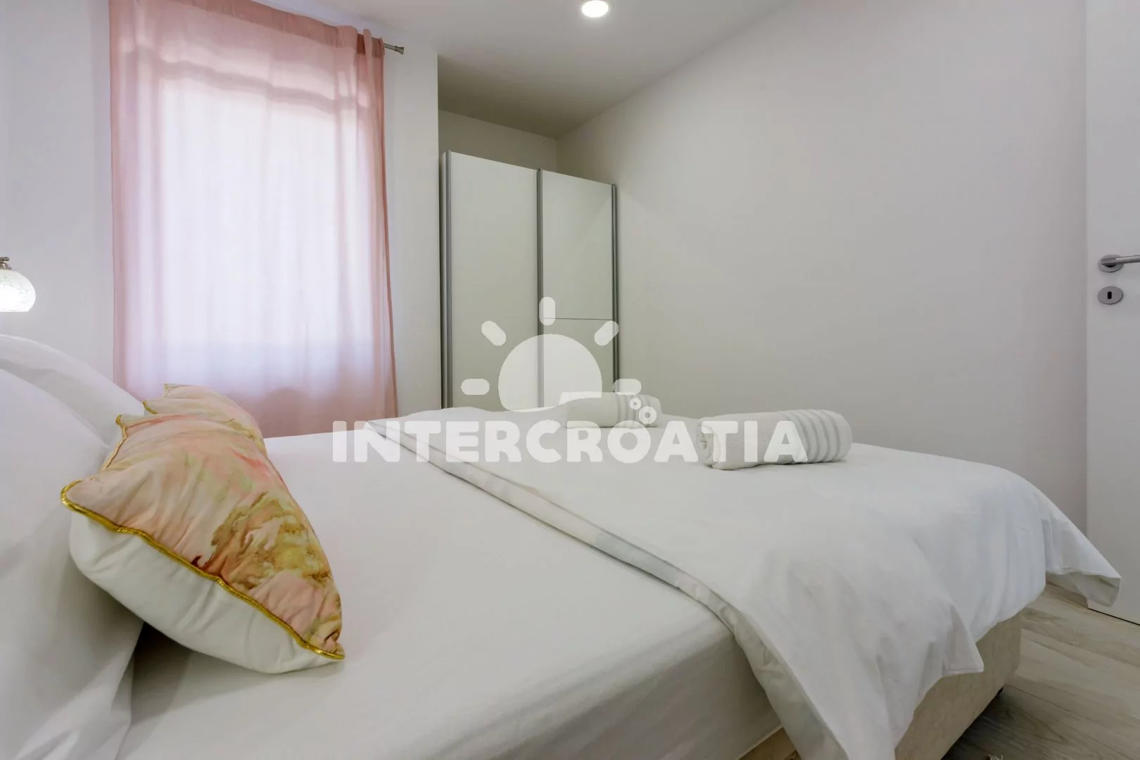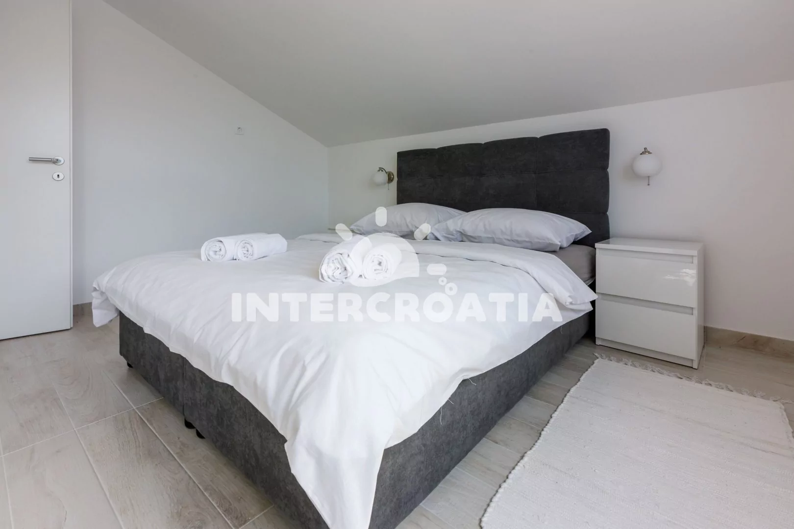 Luxusní a prostorný apartmán (125 m2) v podkroví domu, s terasou a výhledem na moře je vhodný pro 8 osob. Obývací pokoj je spojený s kuchyní. Kuchyňská linka je vybavena sklokeramickou varnou deskou, digestoří, vestavěnou troubou, myčkou na nádobí, mikrovlnnou troubou, rychlovarnou konvicí, kávovarem, toustovačem, nádobím a lednicí s mrazákem. Obývací pokoj s jídelním stolem pro 8 osob, sedací soupravou s pohovkou, televizí se satelitním programem, klimatizací a vstupem na terasu. Čtyři samostatné ložnice, vybavené dvoulůžkem a klimatizací. Dvě koupelny se sprchovým koutem, umyvadlem, bidetem a wc. Hostům je k dispozici parkování u objektu zdarma.