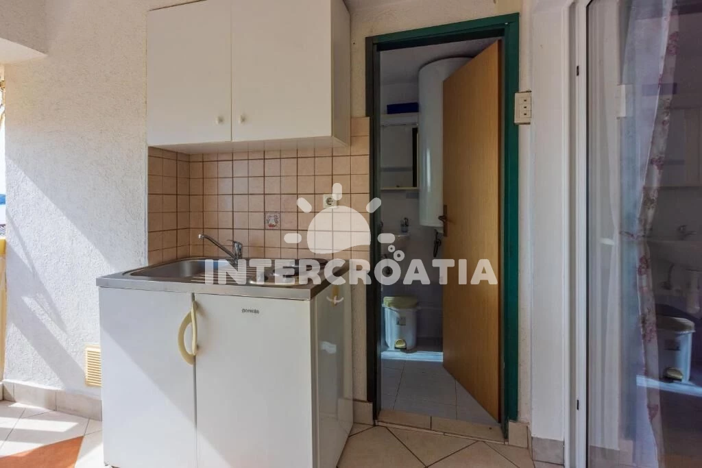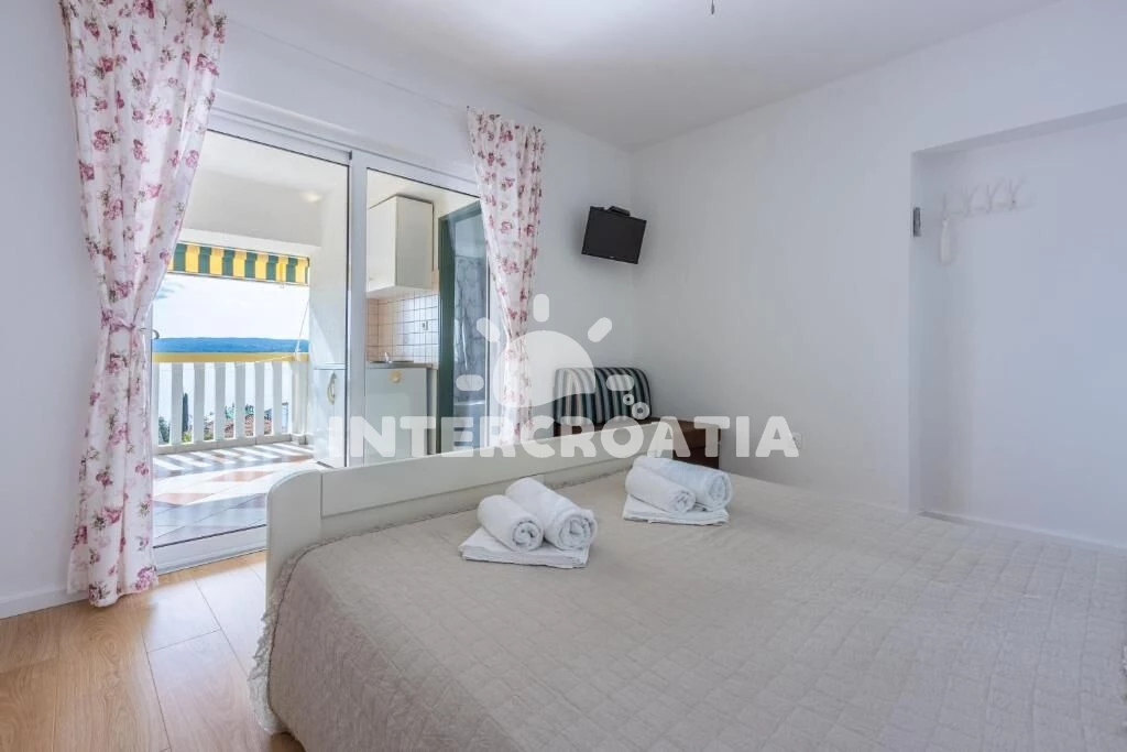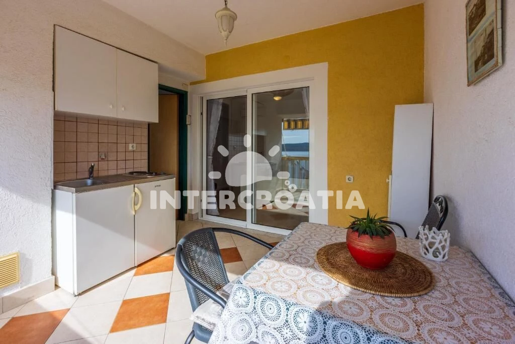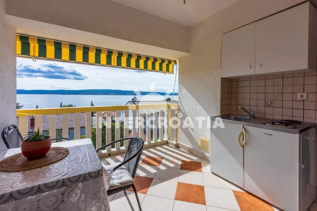 Apartmán (26 m2) typu studio, s terasou a výhledem na moře, se nachází v 2. patře vily a je vhodný pro 2 osoby. Venkovní kuchyňská linka s dvouplotýnkovým vařičem, rychlovarnou konvicí, kávovarem,…