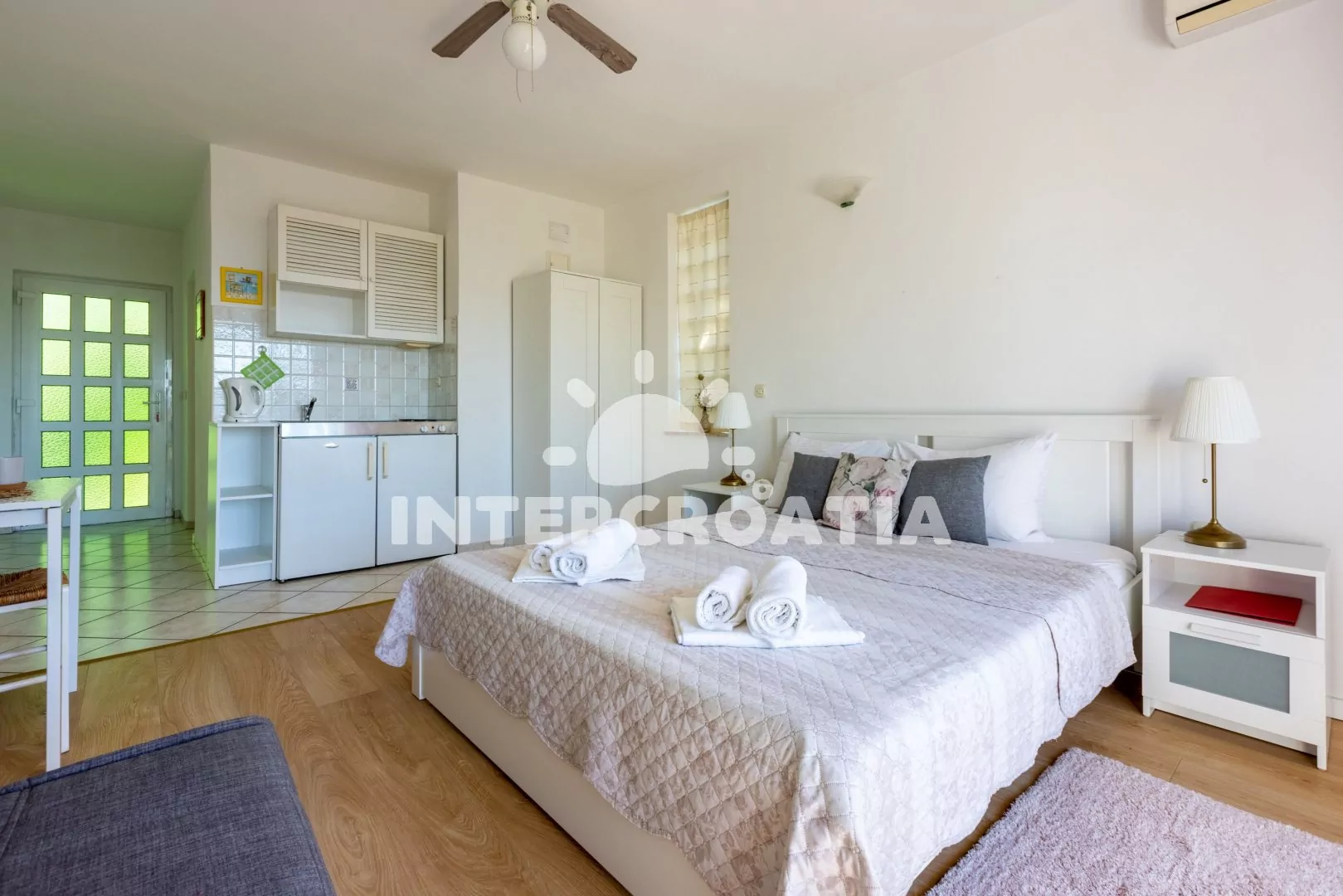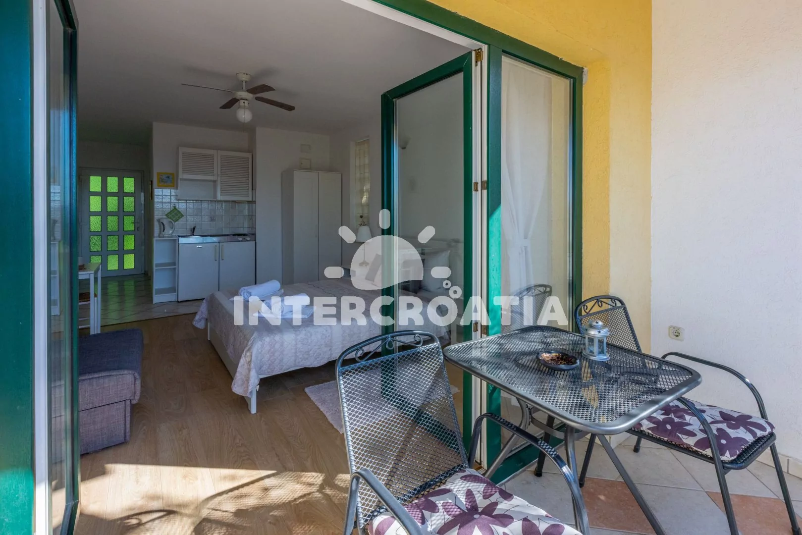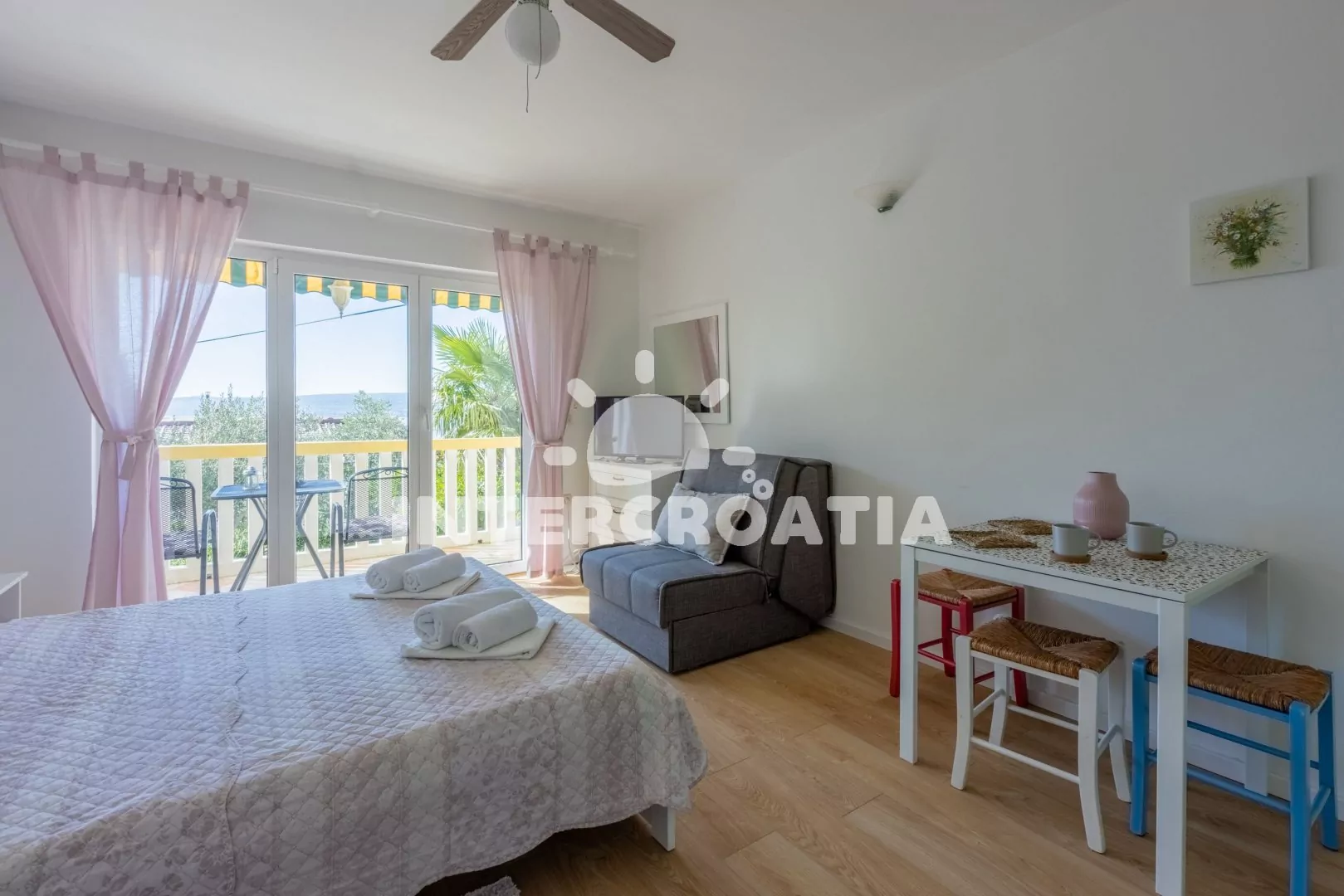 Apartmán (26 m2) typu studio, s balkonem a částečným výhledem na moře, se nachází v 1. patře vily a je vhodný pro 2 osoby. Obývací místnost je spojena s kuchyní. Kuchyňská linka je vybavena dvouplotýnkovým vařičem, rychlovarnou konvicí, kávovarem, toustovačem, nádobím a lednicí s mrazákem. Obývací místnost s jídelním stolem, televizí se satelitním programem, dvoulůžkem, klimatizací a vstupem na balkon. Koupelna se sprchovým koutem, umyvadlem a wc. Hostům je k dispozici parkování u objektu zdarma.