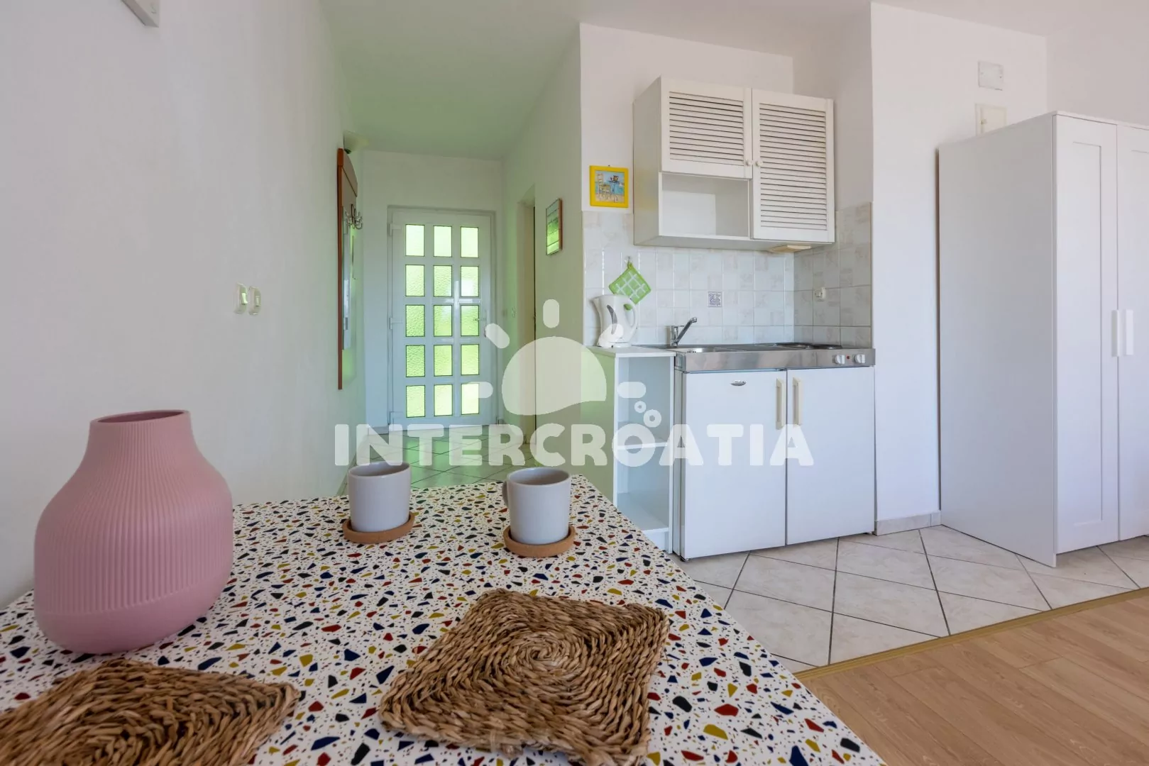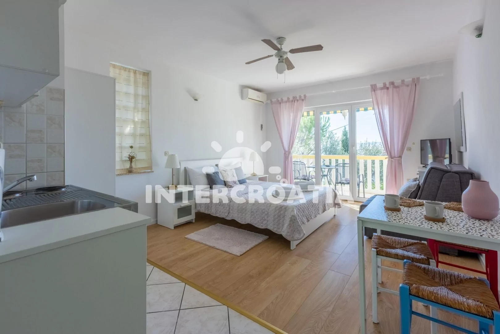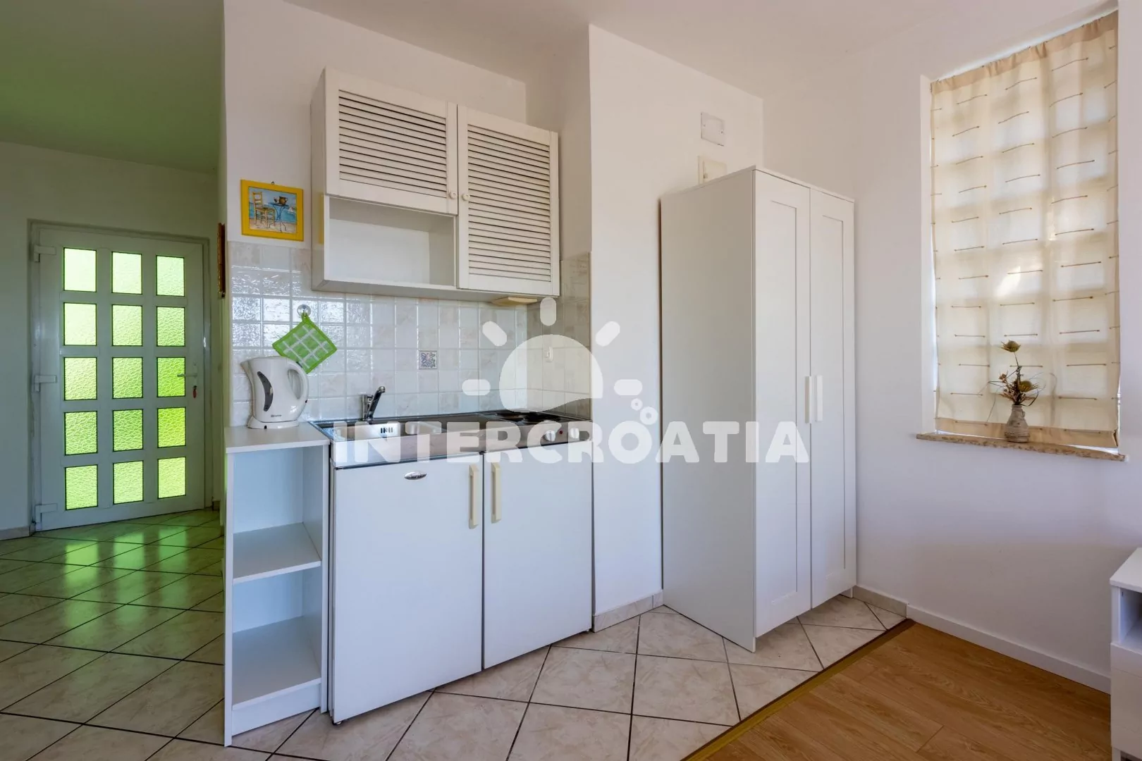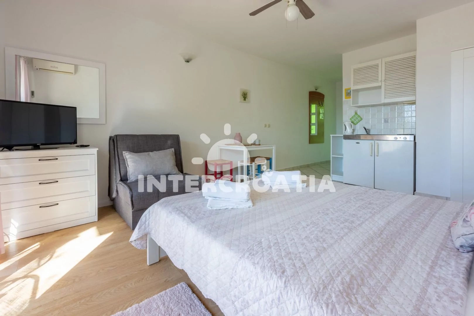 Apartmán (26 m2) typu studio, s balkonem a částečným výhledem na moře, se nachází v 1. patře vily a je vhodný pro 2 osoby. Obývací místnost je spojena s kuchyní. Kuchyňská linka je vybavena dvouplotýnkovým vařičem, rychlovarnou konvicí, kávovarem, toustovačem, nádobím a lednicí s mrazákem. Obývací místnost s jídelním stolem, televizí se satelitním programem, dvoulůžkem, klimatizací a vstupem na balkon. Koupelna se sprchovým koutem, umyvadlem a wc. Hostům je k dispozici parkování u objektu zdarma.
