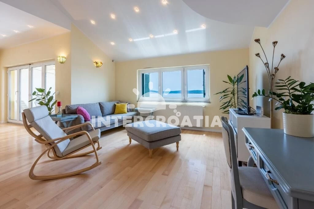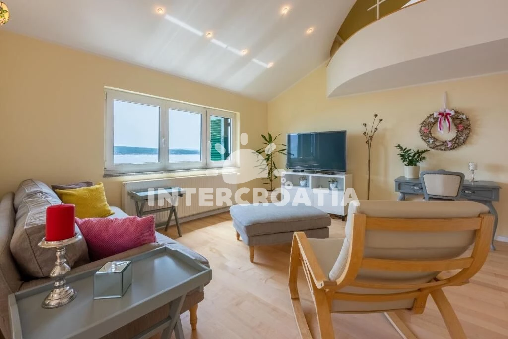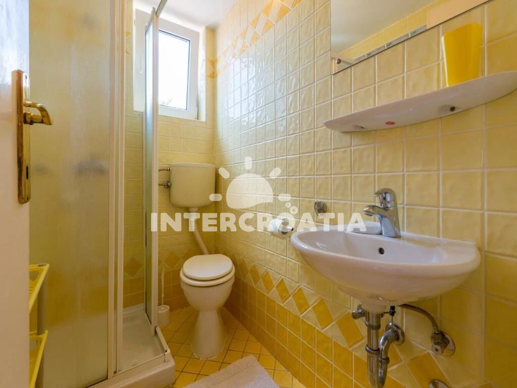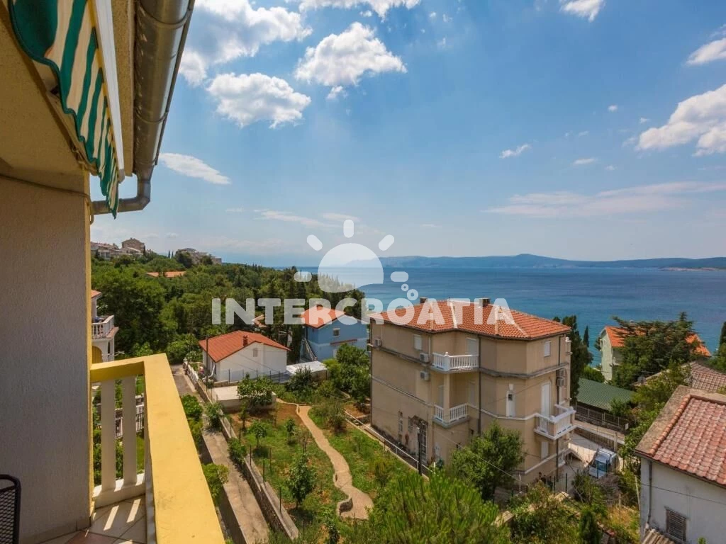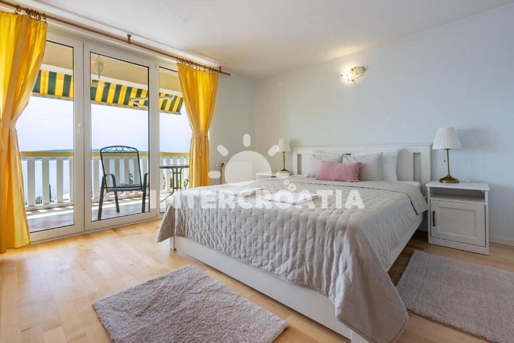 Dvoupatrový apartmán (110 m2) s balkonem a výhledem na moře je vhodný pro 4 osoby. Obývací pokoj je spojený s kuchyní. Kuchyňská linka je vybavena varnou deskou, digestoří, vestavěnou troubou, myčkou na nádobí, mikrovlnnou troubou, rychlovarnou konvicí, kávovarem, toustovačem, nádobím a lednicí s mrazákem. Obývací pokoj s jídelním stolem, sedací soupravou, televizí se satelitním programem, klimatizací a vstupem na balkon. Ložnice s jedním dvoulůžkem a vstupem na balkon. V druhém patře otevřená místnost s dvoulůžkem. První koupelna se sprchovým koutem, umyvadlem, pračkou a wc. Druhá koupelna se sprchovým koutem, umyvadlem a wc. Hostům je k dispozici parkování u objektu zdarma.