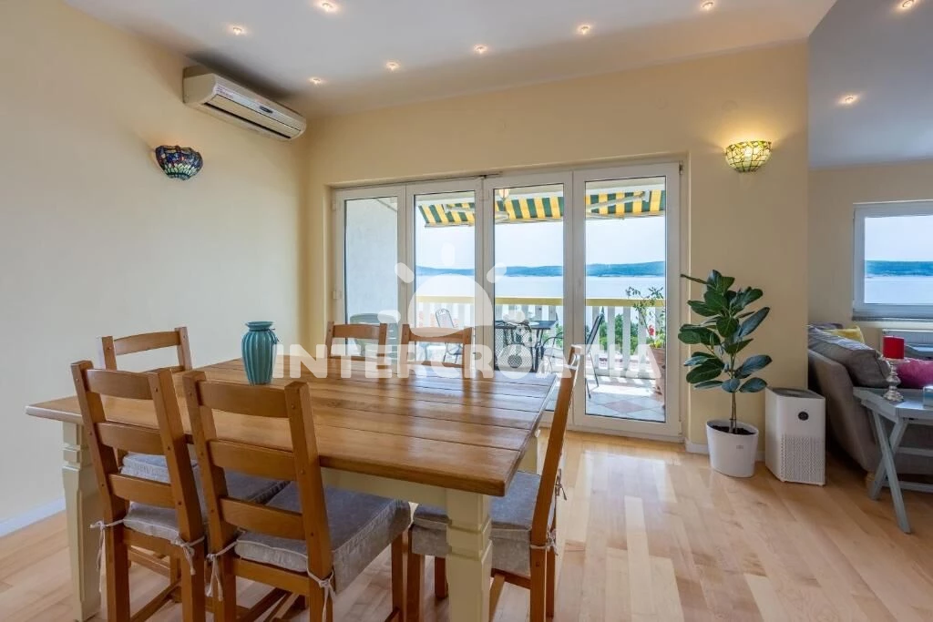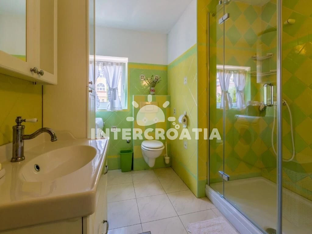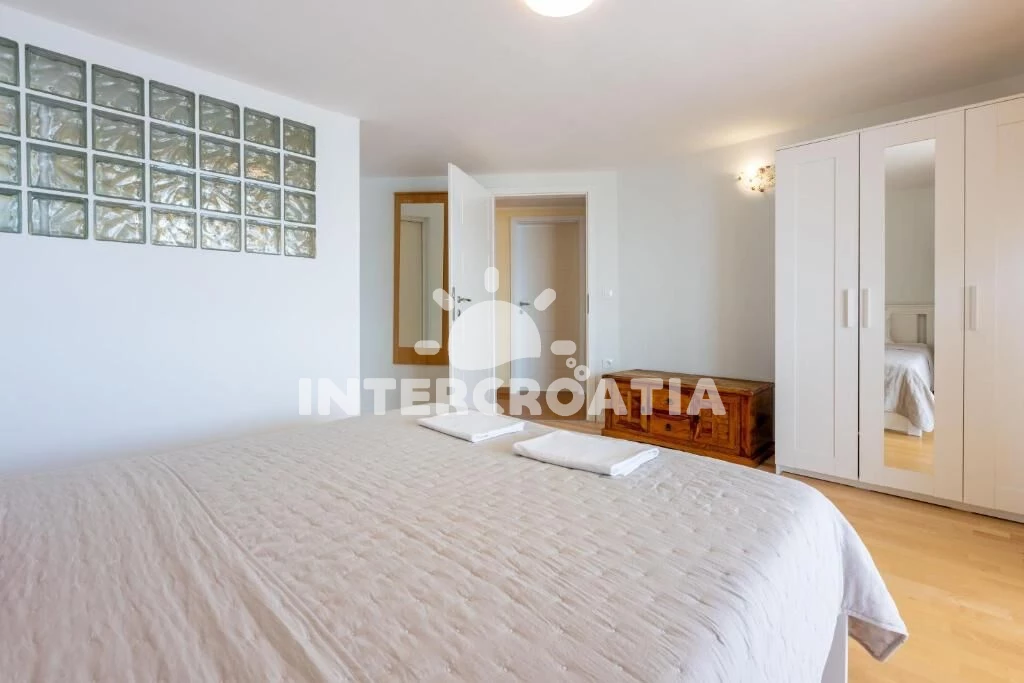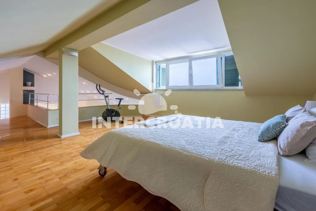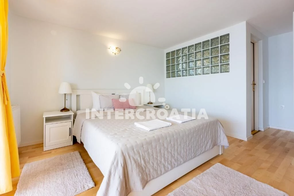 Dvoupatrový apartmán (110 m2) s balkonem a výhledem na moře je vhodný pro 4 osoby. Obývací pokoj je spojený s kuchyní. Kuchyňská linka je vybavena varnou deskou, digestoří, vestavěnou troubou, myčkou na nádobí, mikrovlnnou troubou, rychlovarnou konvicí, kávovarem, toustovačem, nádobím a lednicí s mrazákem. Obývací pokoj s jídelním stolem, sedací soupravou, televizí se satelitním programem, klimatizací a vstupem na balkon. Ložnice s jedním dvoulůžkem a vstupem na balkon. V druhém patře otevřená místnost s dvoulůžkem. První koupelna se sprchovým koutem, umyvadlem, pračkou a wc. Druhá koupelna se sprchovým koutem, umyvadlem a wc. Hostům je k dispozici parkování u objektu zdarma.