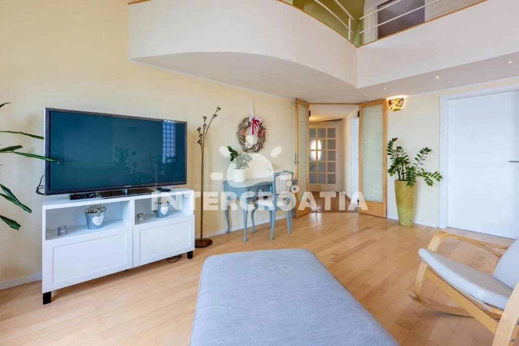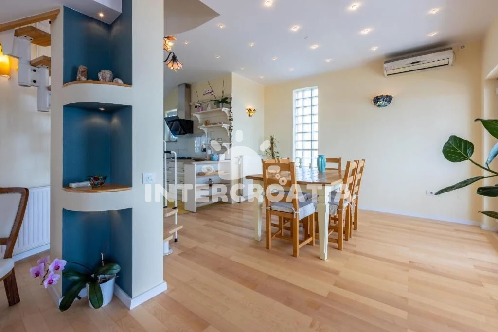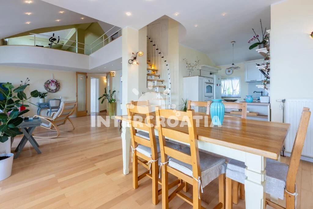 Dvoupatrový apartmán (110 m2) s balkonem a výhledem na moře je vhodný pro 4 osoby. Obývací pokoj je spojený s kuchyní. Kuchyňská linka je vybavena varnou deskou, digestoří, vestavěnou troubou, myčkou…