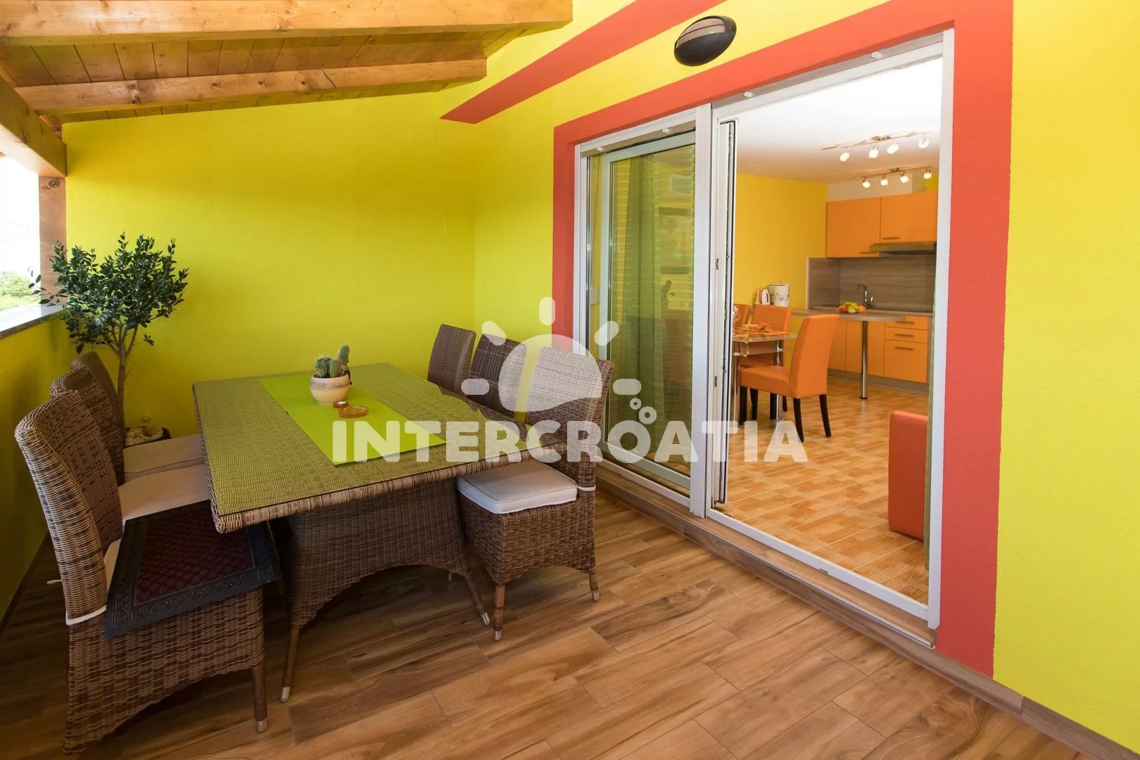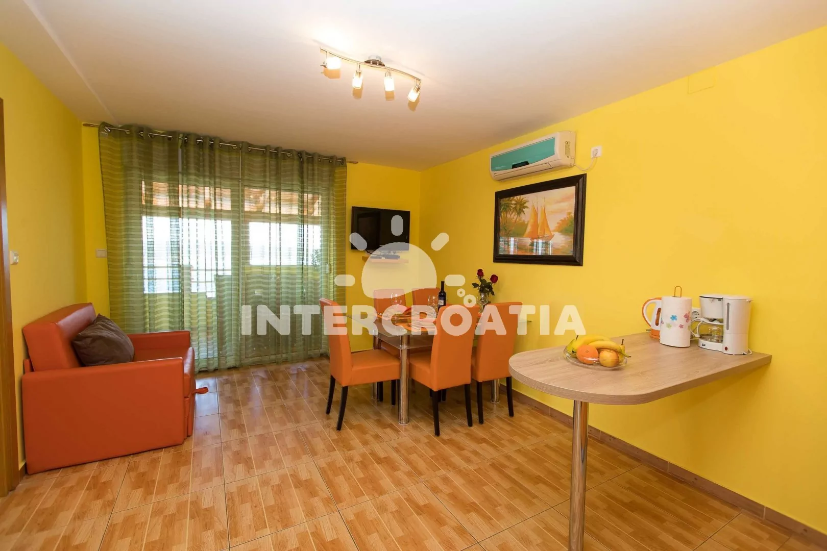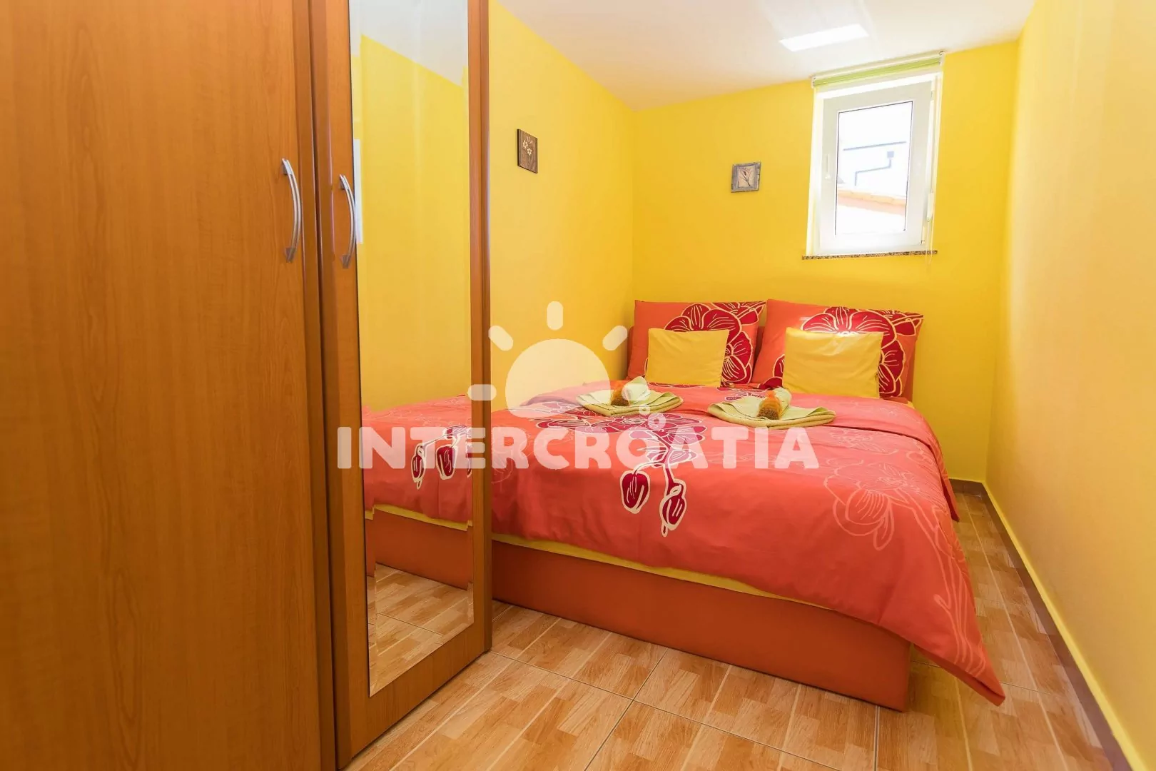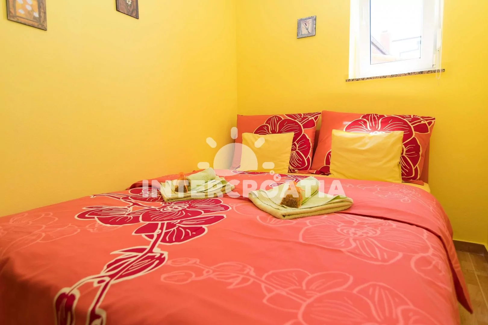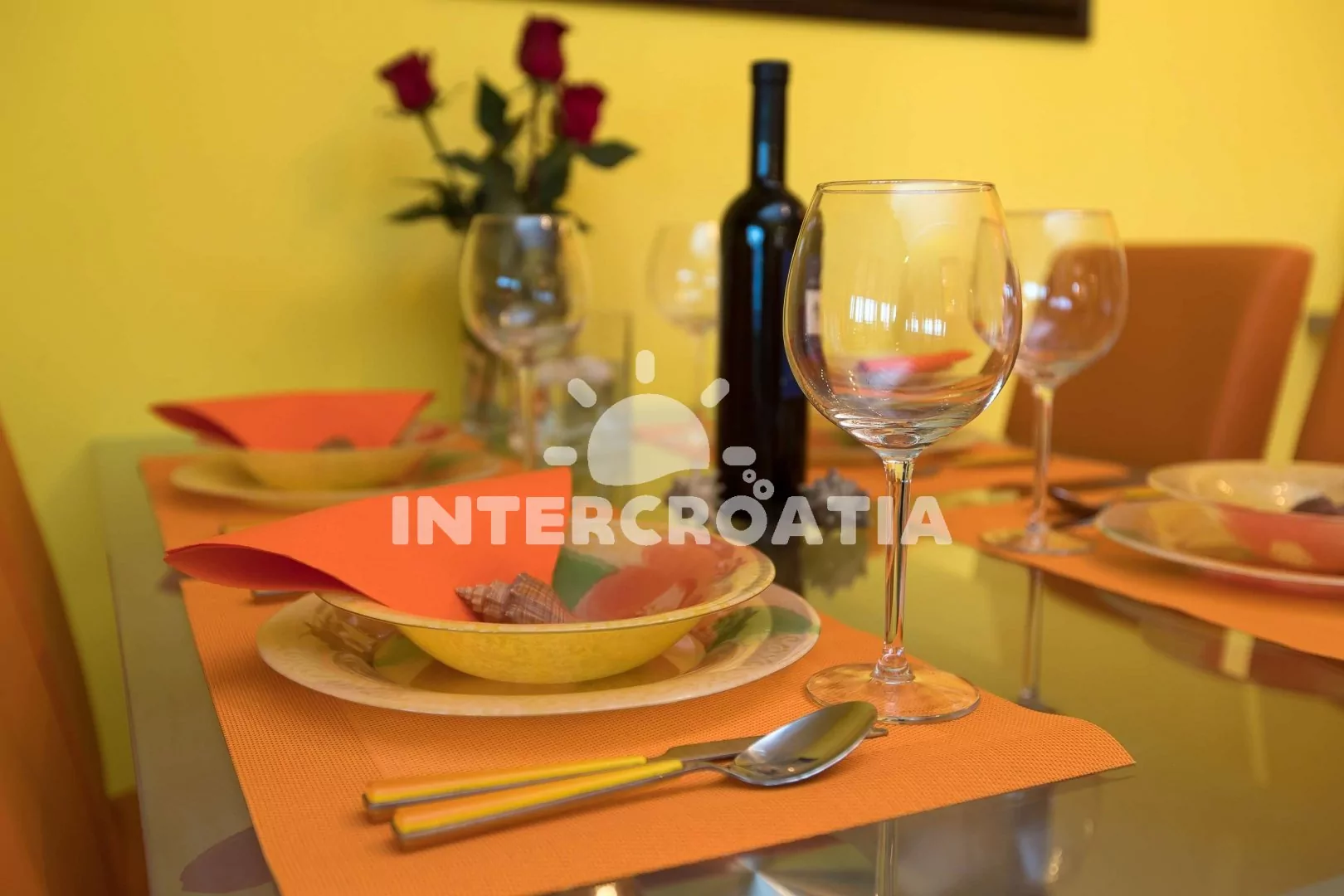 Apartmán (57 m2) s terasou a panoramatickým výhledem na moře, se nachází v 1. patře vily a je vhodný pro 4 osoby. Obývací pokoj je spojený s kuchyní. Kuchyňská linka je vybavena sklokeramickou varnou deskou, digestoří, vestavěnou myčkou na nádobí, rychlovarnou konvicí, mikrovlnnou troubou, kávovarem, toustovačem, nádobím a lednicí s mrazákem. Obývací pokoj s jídelním stolem pro 5 osob, pohovkou, televizí se satelitním programem, radiem, klimatizací a vstupem na terasu. První ložnice s dvoulůžkem, sejfem a vstupem na terasu. Druhá ložnice s dvoulůžkem. Koupelna se sprchovým koutem, umyvadlem, fénem a wc. Hostům je k dispozici parkování u objektu zdarma.