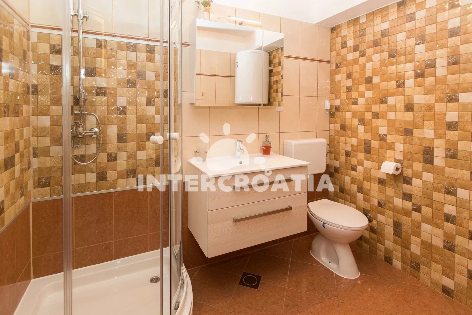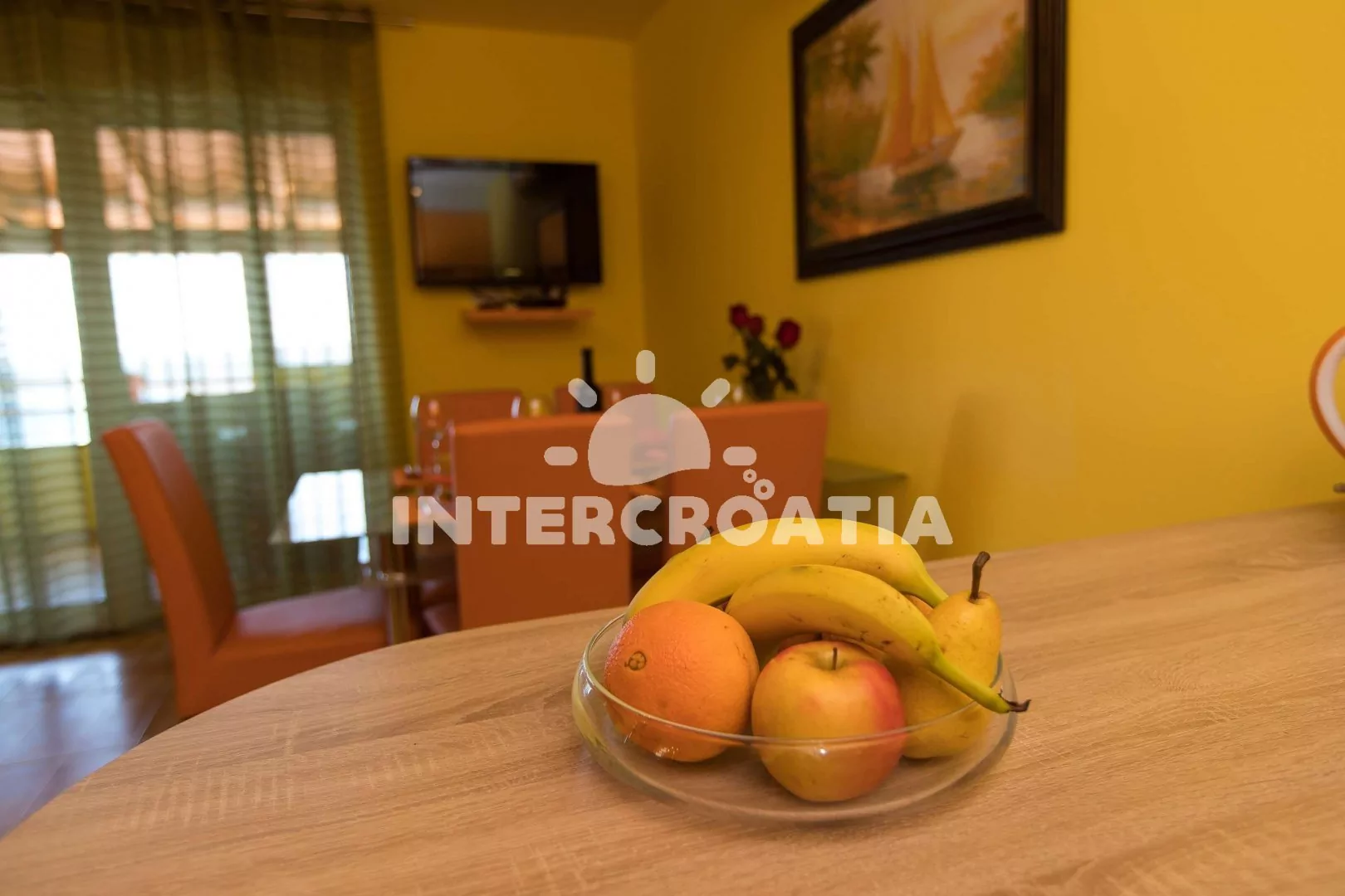Apartmán (57 m2) s terasou a panoramatickým výhledem na moře, se nachází v 1. patře vily a je vhodný pro 4 osoby. Obývací pokoj je spojený s kuchyní. Kuchyňská linka je vybavena sklokeramickou…