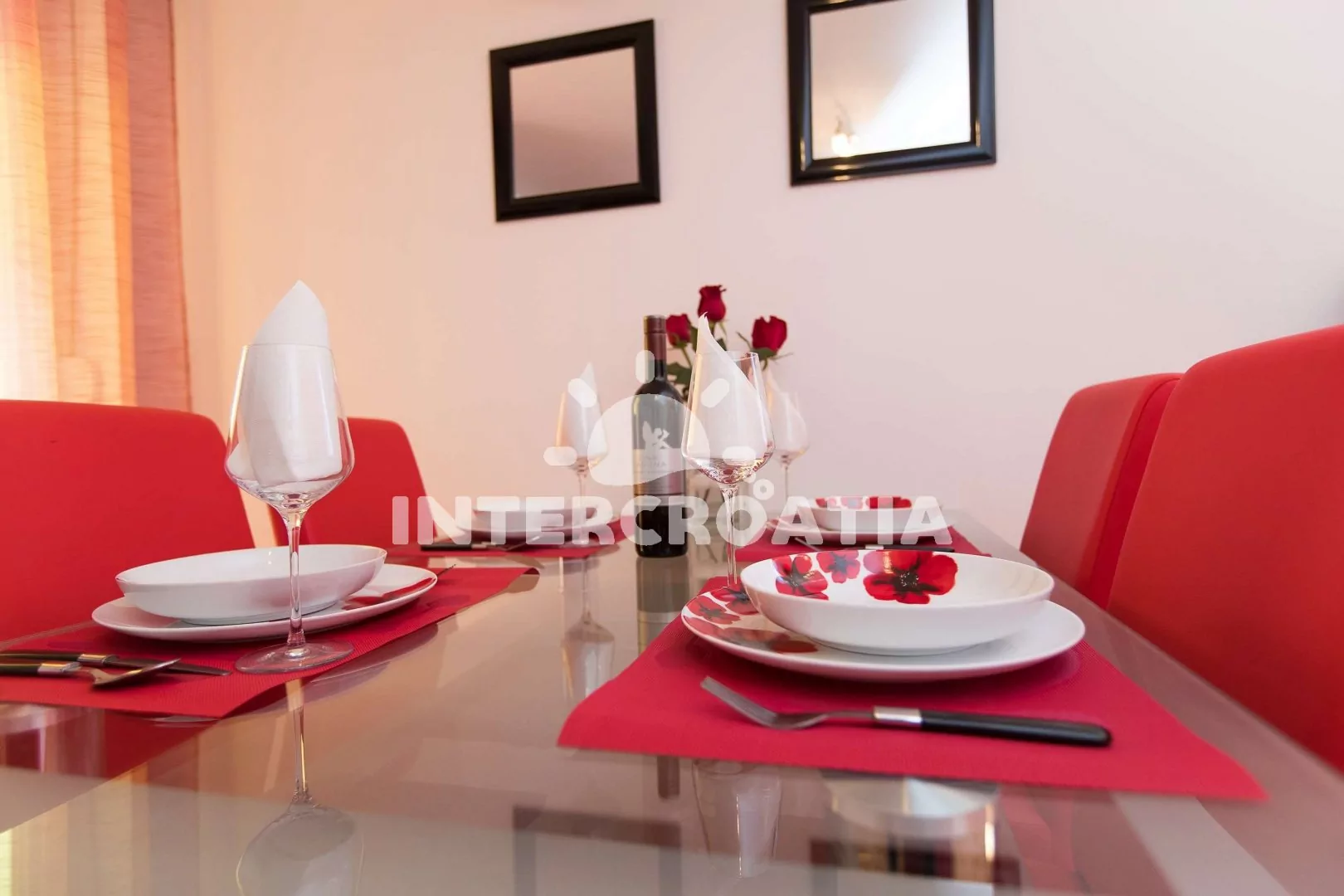 Apartmán (57 m2) s terasou a venkovním posezením se nachází v 1. patře vily a je vhodný pro 4 až 5 osob. Obývací pokoj je spojený s kuchyní. Kuchyňská linka je vybavena sklokeramickou varnou deskou, digestoří, mikrovlnnou troubou, myčkou na nádobí, rychlovarnou konvicí, kávovarem, toustovačem, nádobím a lednicí s mrazákem. Obývací pokoj s jídelním stolem pro 4 osoby, pohovkou (rozložitelná na extra lůžko pro 1 osobu, televizí se satelitním programem, radiem, klimatizací a vstupem na terasu. První ložnice s dvoulůžkem, sejfem a vstupem na terasu. Druhá ložnice s dvoulůžkem. Koupelna se sprchovým koutem, umyvadlem, fénem a wc. Hostům je k dispozici parkování u objektu zdarma.