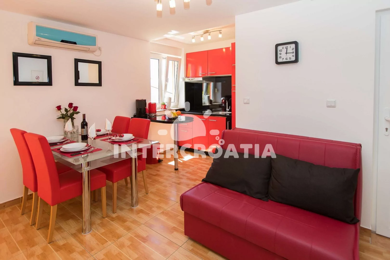 Apartmán (57 m2) s terasou a venkovním posezením se nachází v 1. patře vily a je vhodný pro 4 až 5 osob. Obývací pokoj je spojený s kuchyní. Kuchyňská linka je vybavena sklokeramickou varnou deskou,…
