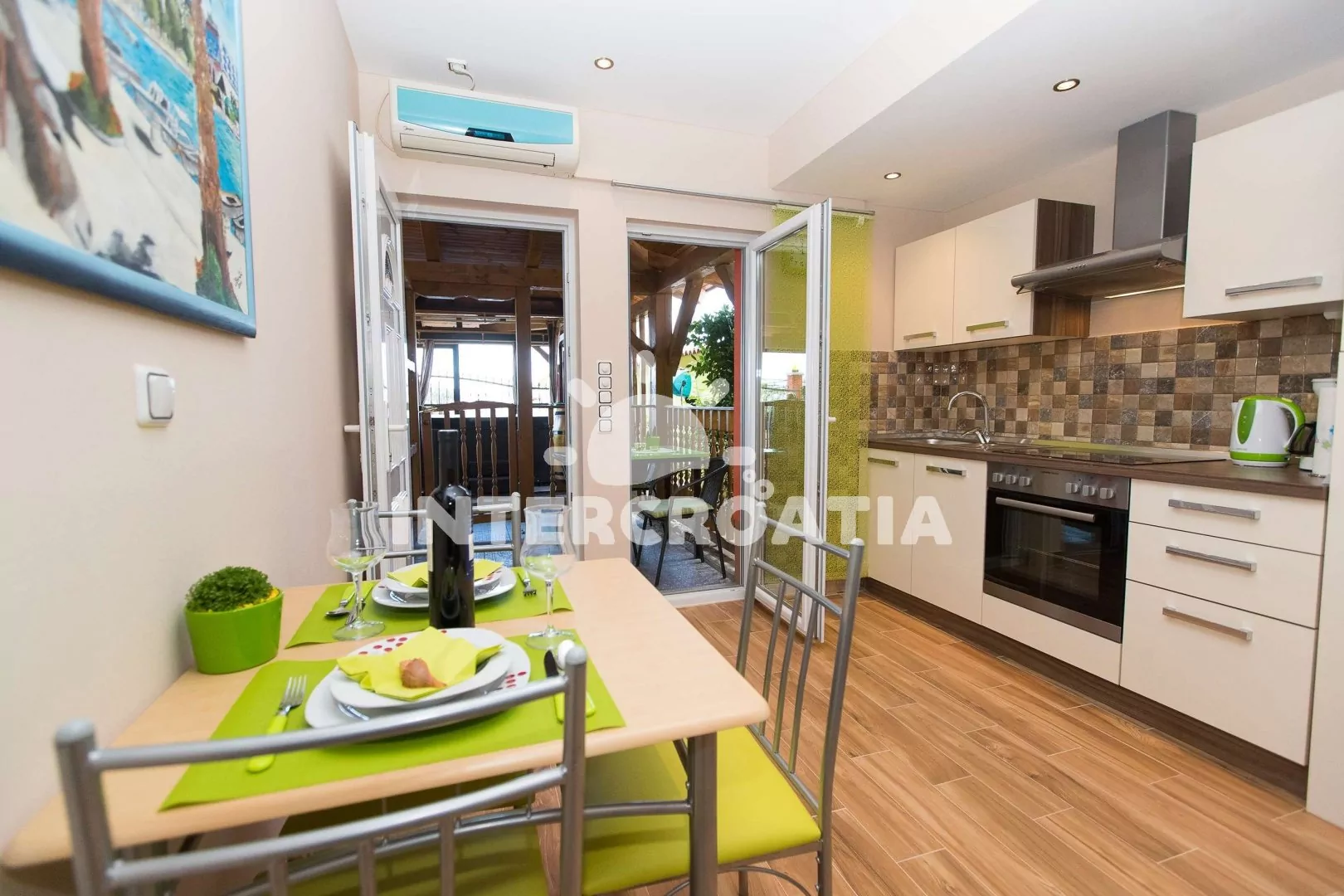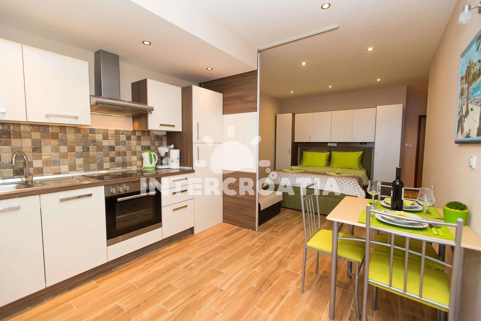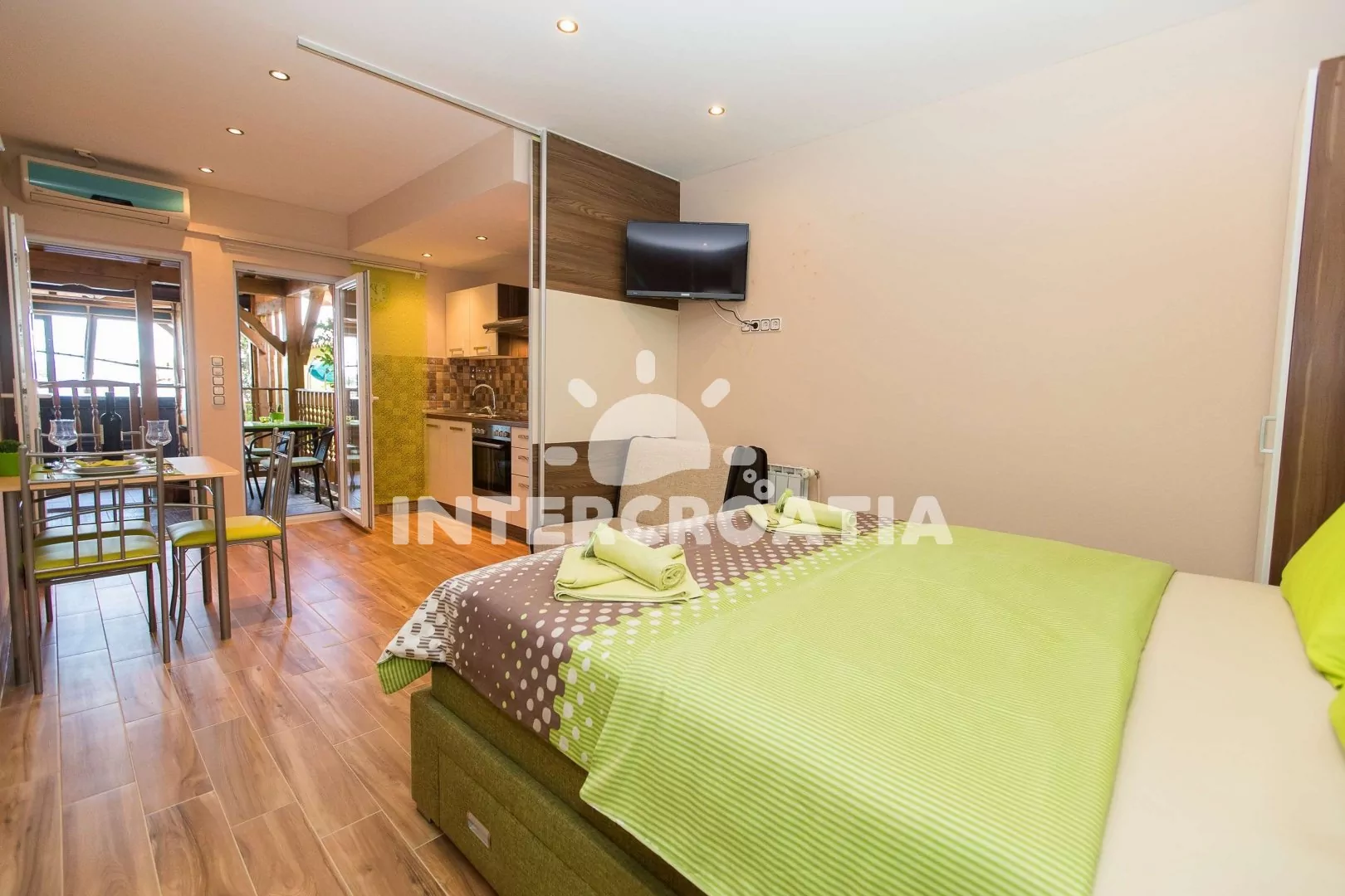 Apartmán (30 m2) typu studio, s terasou a venkovním posezením se nachází v 1. patře vily a je vhodný pro 2 osoby. Obývací místnost je spojena s kuchyní. Kuchyňská linka je vybavena sklokeramickou varnou deskou, digestoří, vestavěnou troubou, mikrovlnnou troubou, rychlovarnou konvicí, kávovarem, toustovačem, nádobím a lednicí s mrazákem. Obývací místnost s jídelním stolem pro 3 osoby, pohovkou, televizí se satelitním programem, radiem, klimatizací, dvoulůžkem a vstupem na terasu. Koupelna se sprchovým koutem, umyvadlem, fénem a wc. Hostům je k dispozici parkování u objektu zdarma.