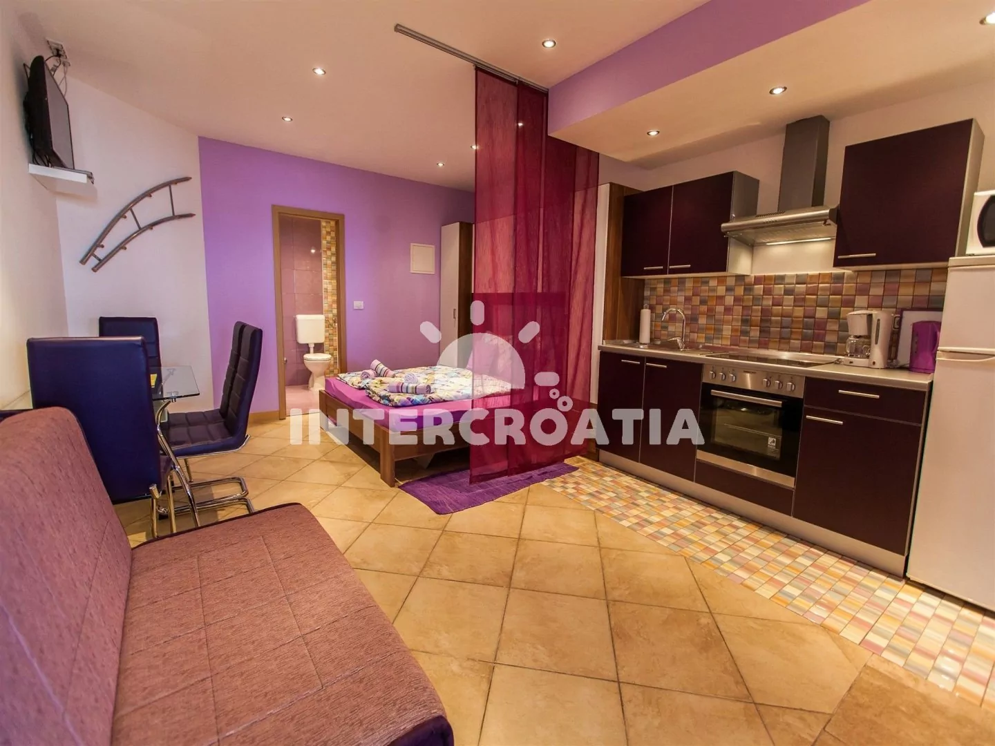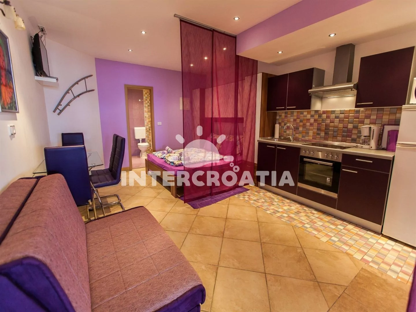 Apartmán (30 m2) typu studio, s terasou a venkovním posezením, se nachází v přízemí vily a je vhodný pro 2 až 3 osoby. Obývací místnost je spojena s kuchyní. Kuchyňská linka je vybavena sklokeramickou varnou deskou, digestoří, vestavěnou troubou, mikrovlnnou troubou, rychlovarnou konvicí, kávovarem, toustovačem, nádobím a lednicí s mrazákem. Obývací místnost s jídelním stolem pro 3 osoby, pohovkou (rozložitelná na extra lůžko pro 1 osobu, televizí se satelitním programem, klimatizací, dvoulůžkem a vstupem na terasu. Koupelna se sprchovým koutem, umyvadlem, fénem a wc. Hostům je k dispozici parkování u objektu zdarma.