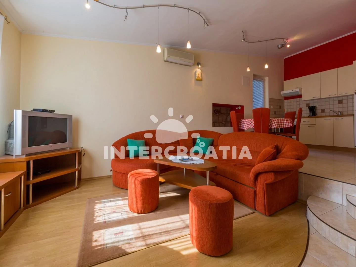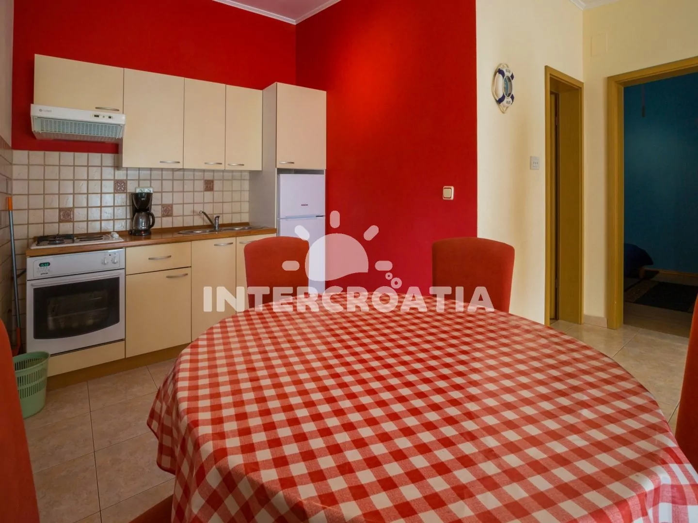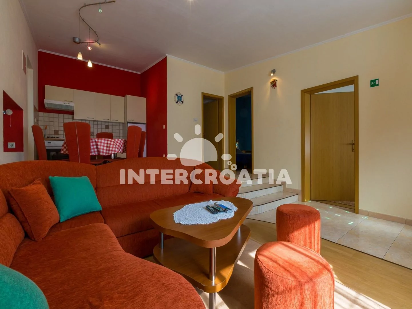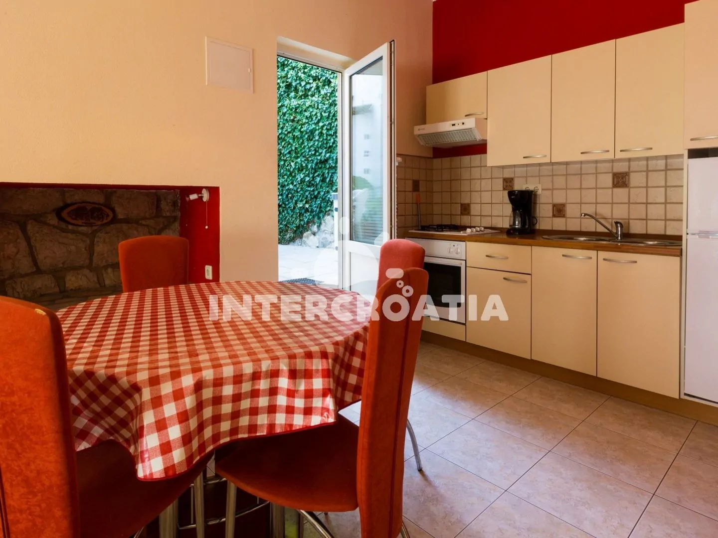 Apartmán (55 m2) s terasou a posezením se nachází v přízemí domu a je vhodný pro 4 až 5 osob. Obývací pokoj je spojený s kuchyní. Kuchyňská linka je vybavena varnou deskou, digestoří, troubou,…