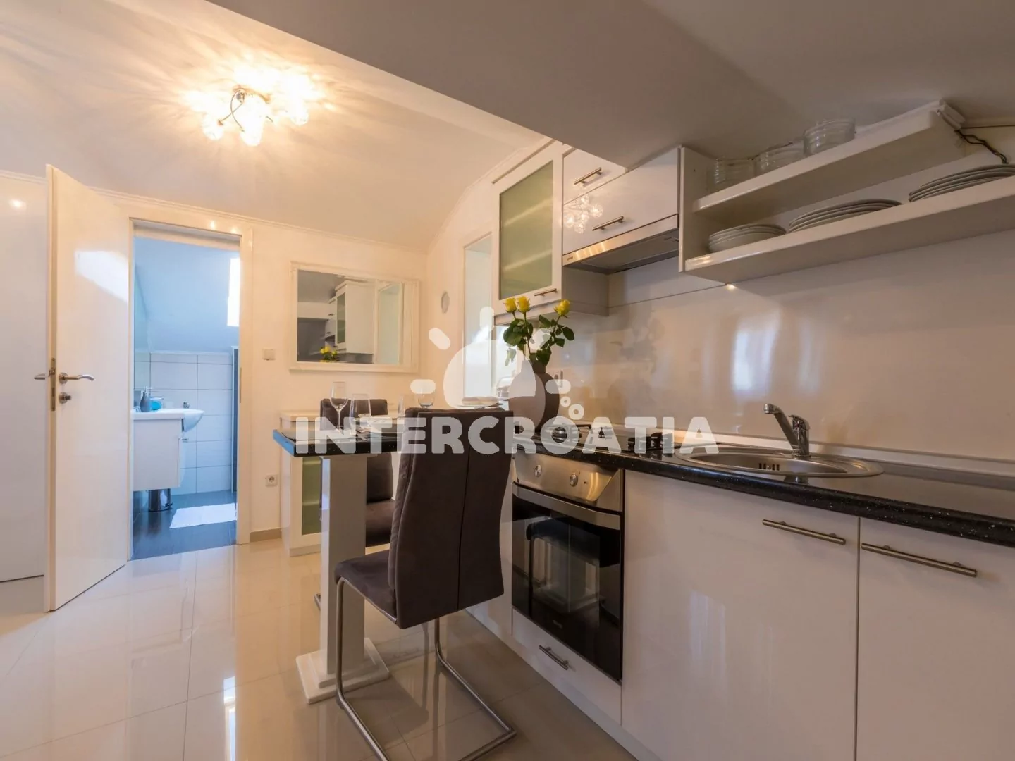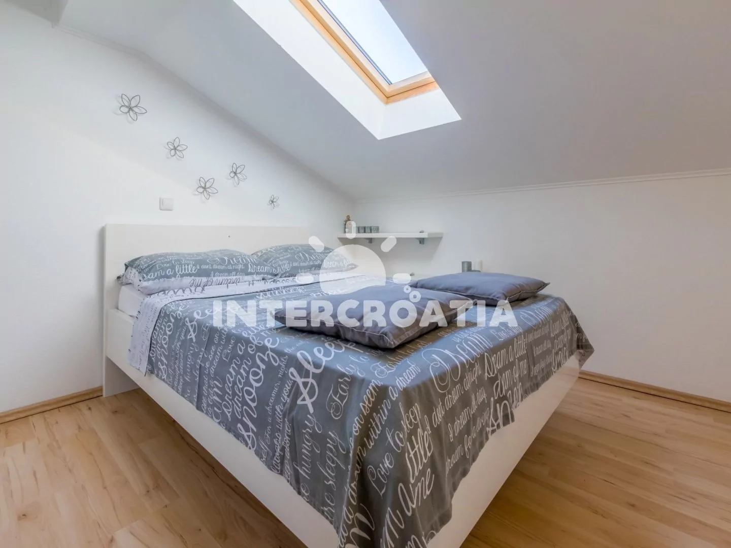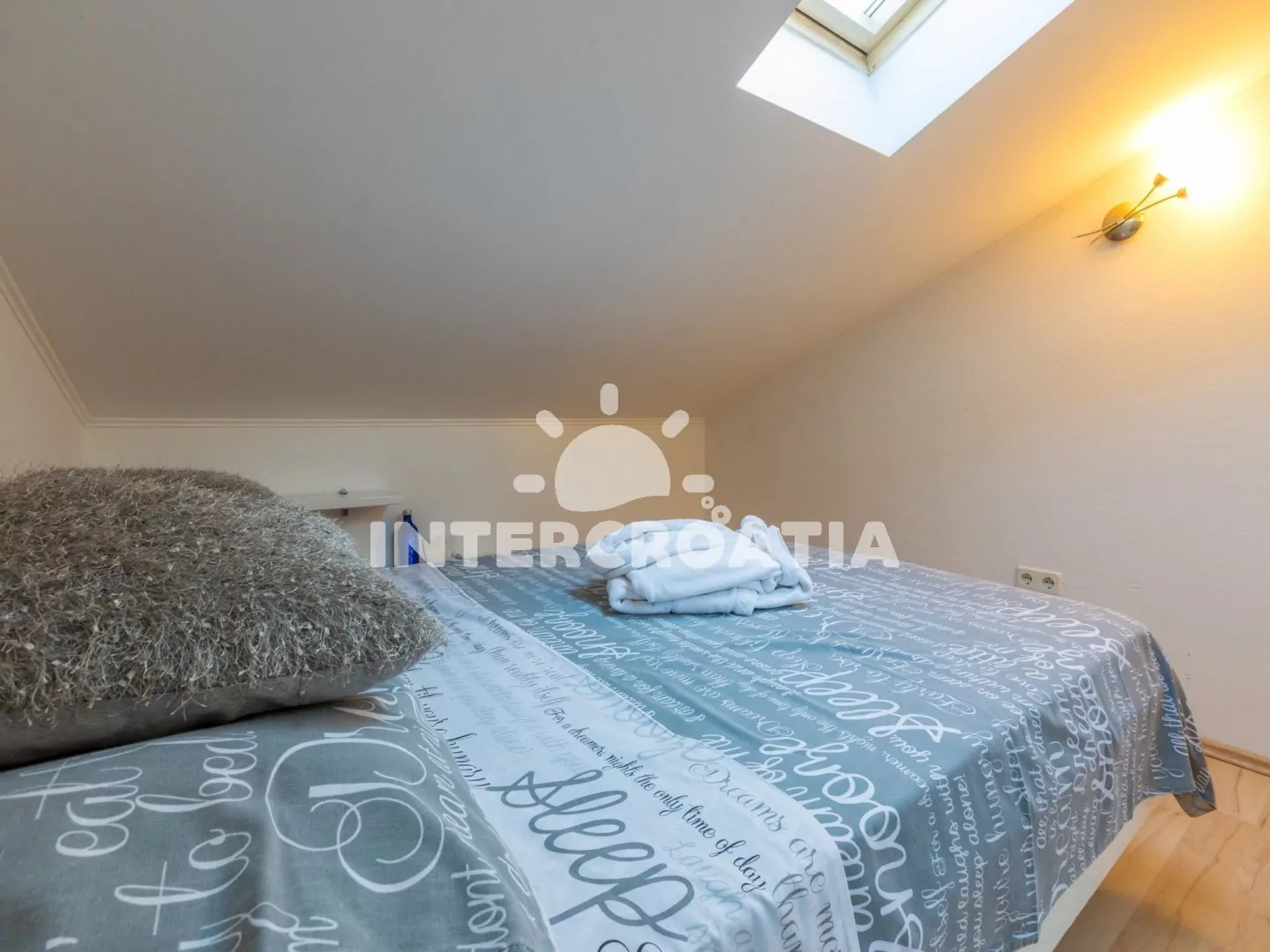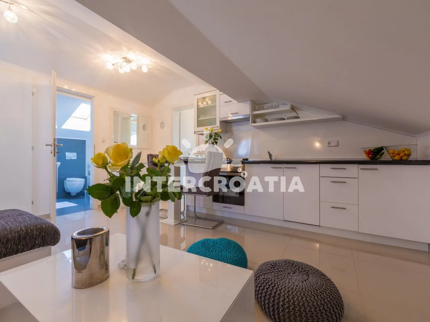 Podkrovní apartmán (50 m2) s výhledem na moře a je vhodný pro 4 až 5 osob. Obývací pokoj je spojený s kuchyní. Kuchyňská linka je vybavena varnou deskou, digestoří, vestavěnou troubou, rychlovarnou…