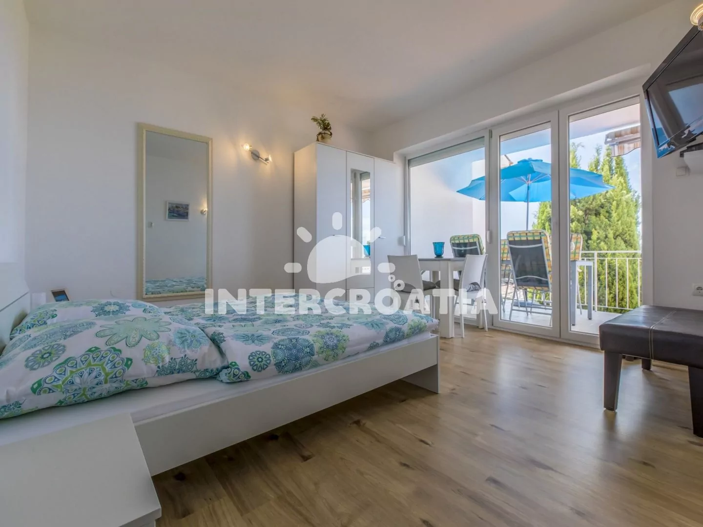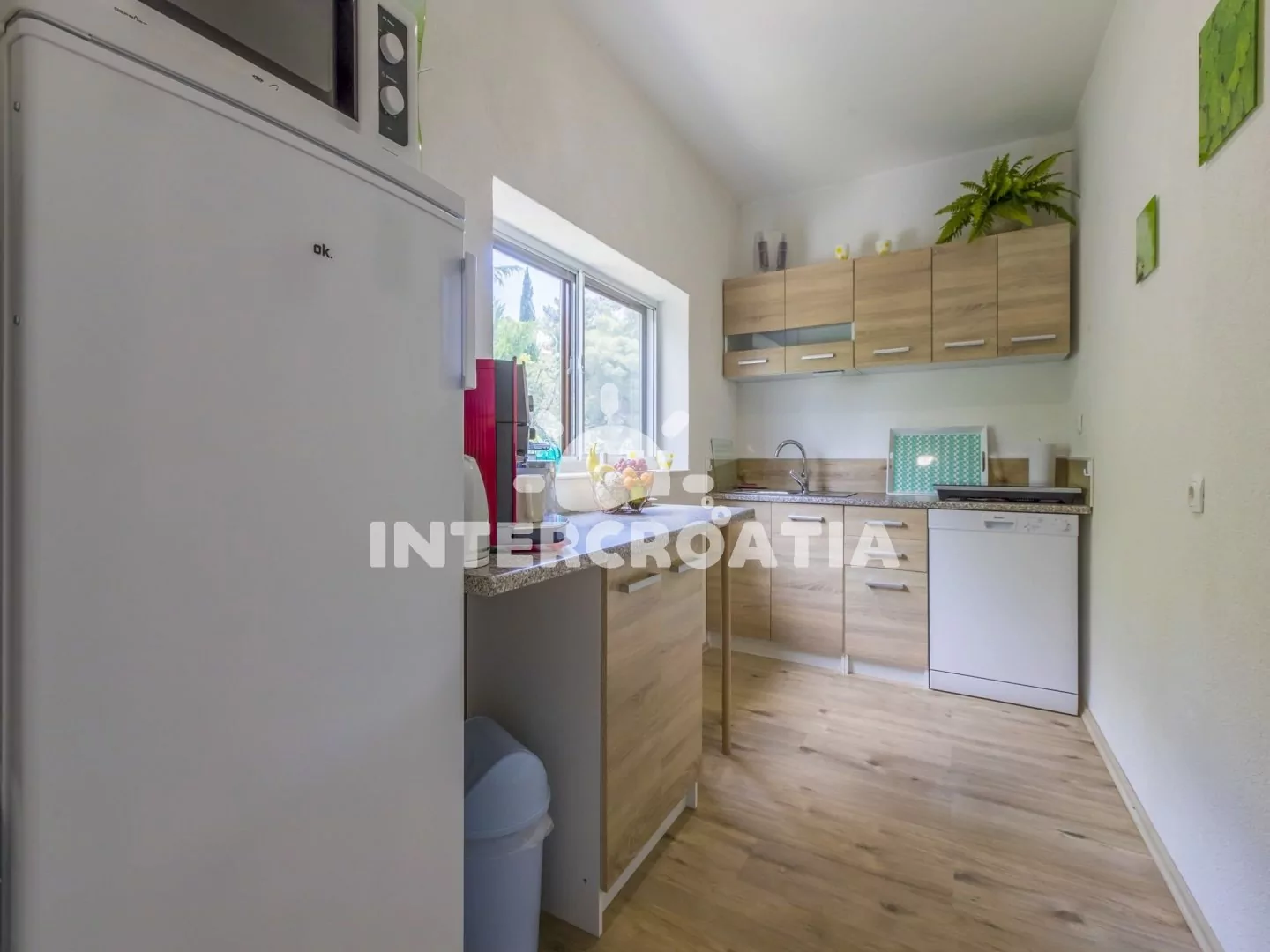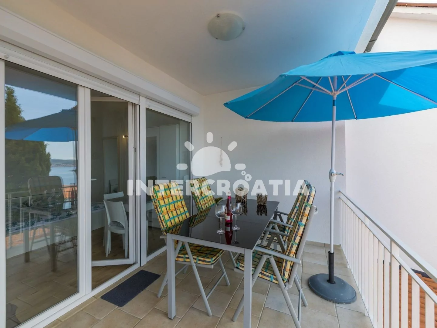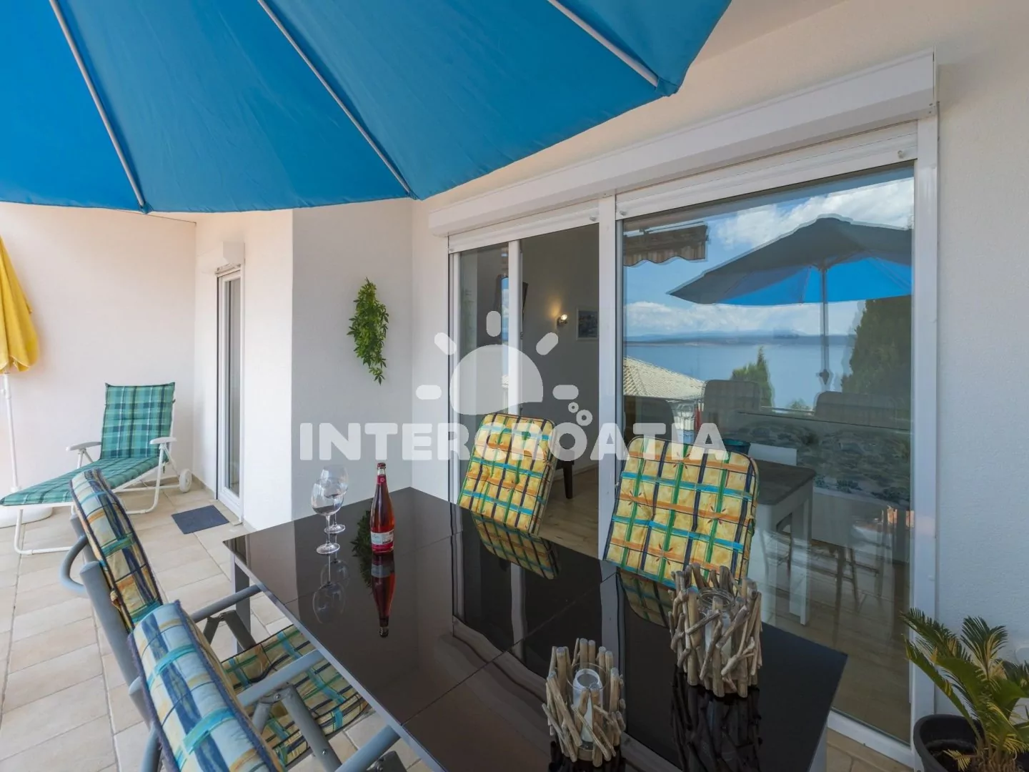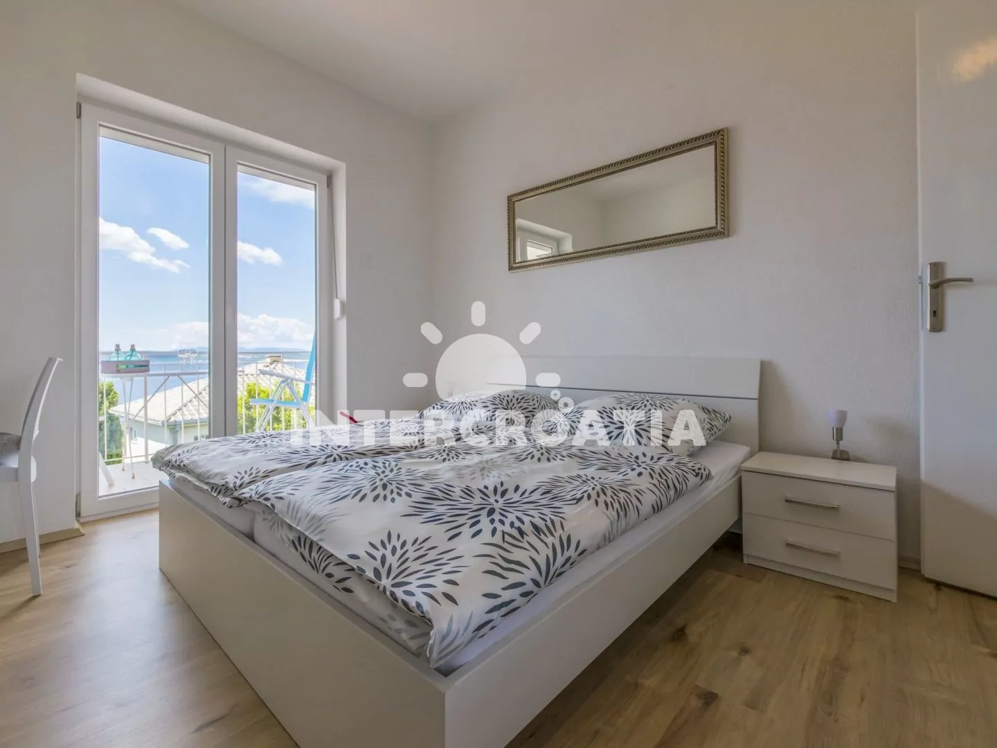 Apartmán (80 m2) s terasou a výhledem na moře, se nachází v přízemí domu a je vhodný pro 4 až 6 osob. Kuchyňská linka je vybavena varnou deskou, myčkou na nádobí, rychlovarnou konvicí, kávovarem, toustovačem, nádobím a lednicí s mrazákem. Obývací pokoj s pohovkou (rozložitelná na extra lůžko pro 2 osoby) a vstupem na terasu. První i druhá ložnice je vybavena vždy s jedním dvoulůžkem, televizí se satelitním programem a vstupem na terasu. Koupelna se sprchovým koutem, umyvadlem, fénem a wc. Dále samostatné wc. Hostům je k dispozici parkování u objektu zdarma.