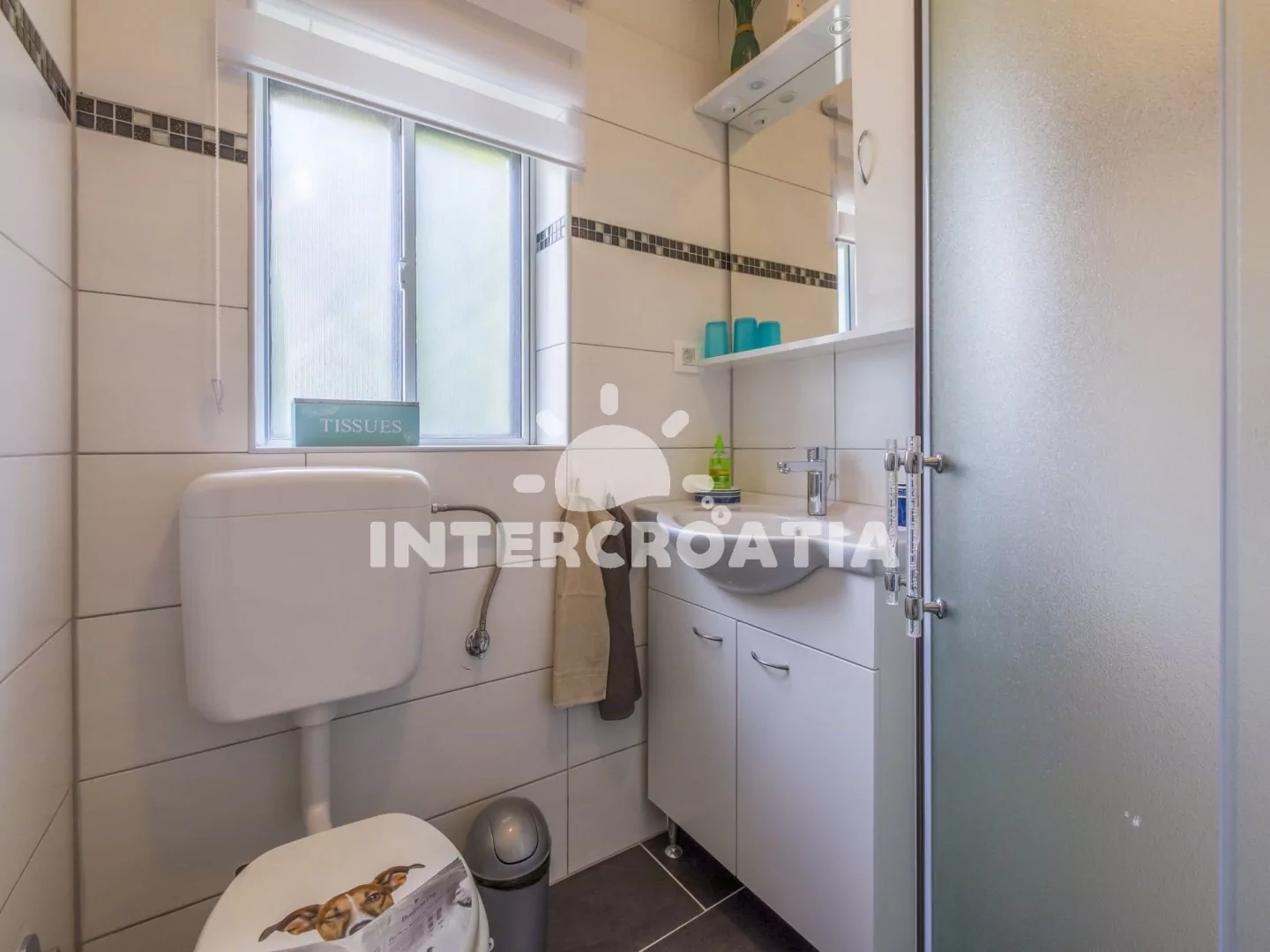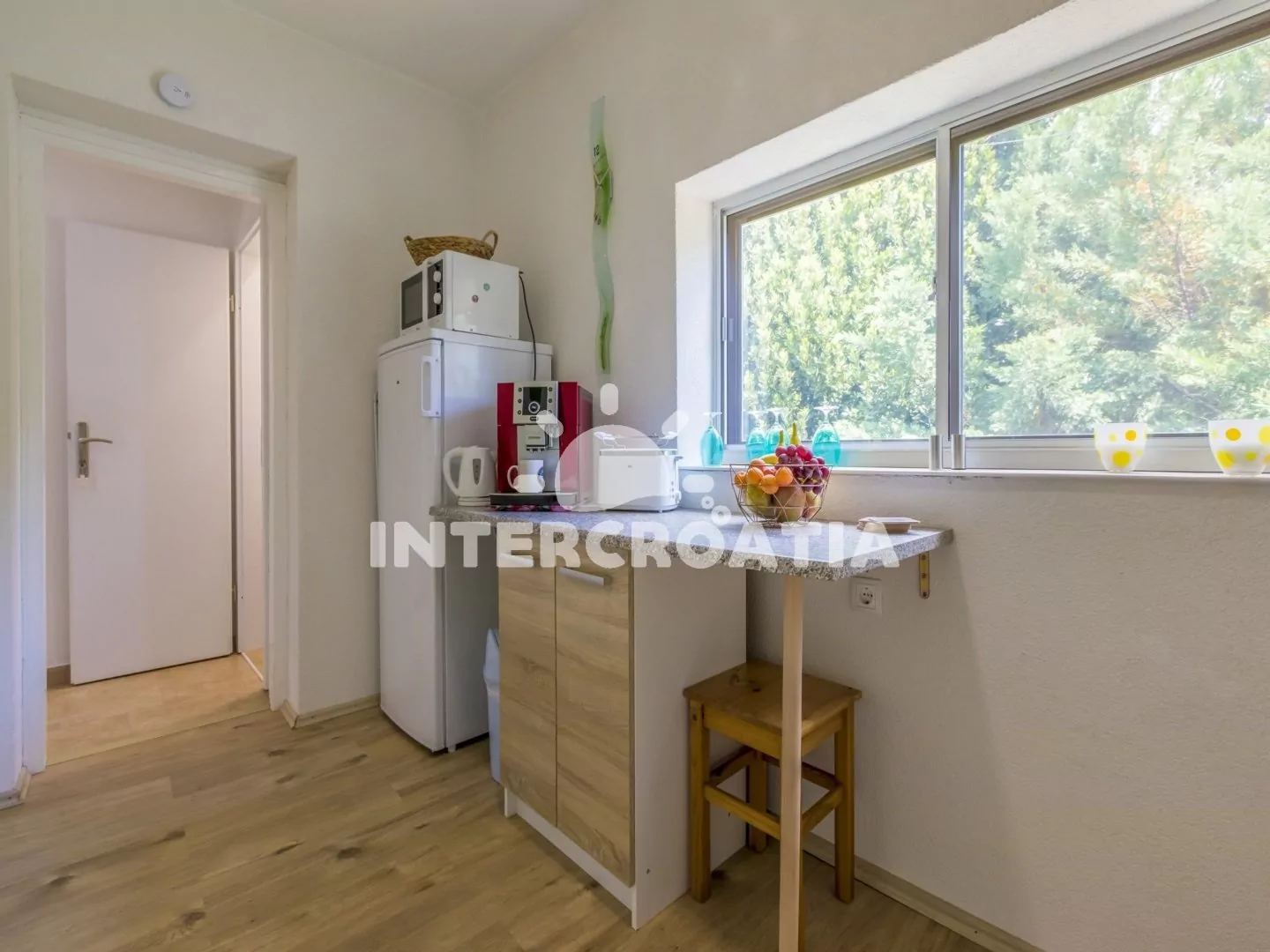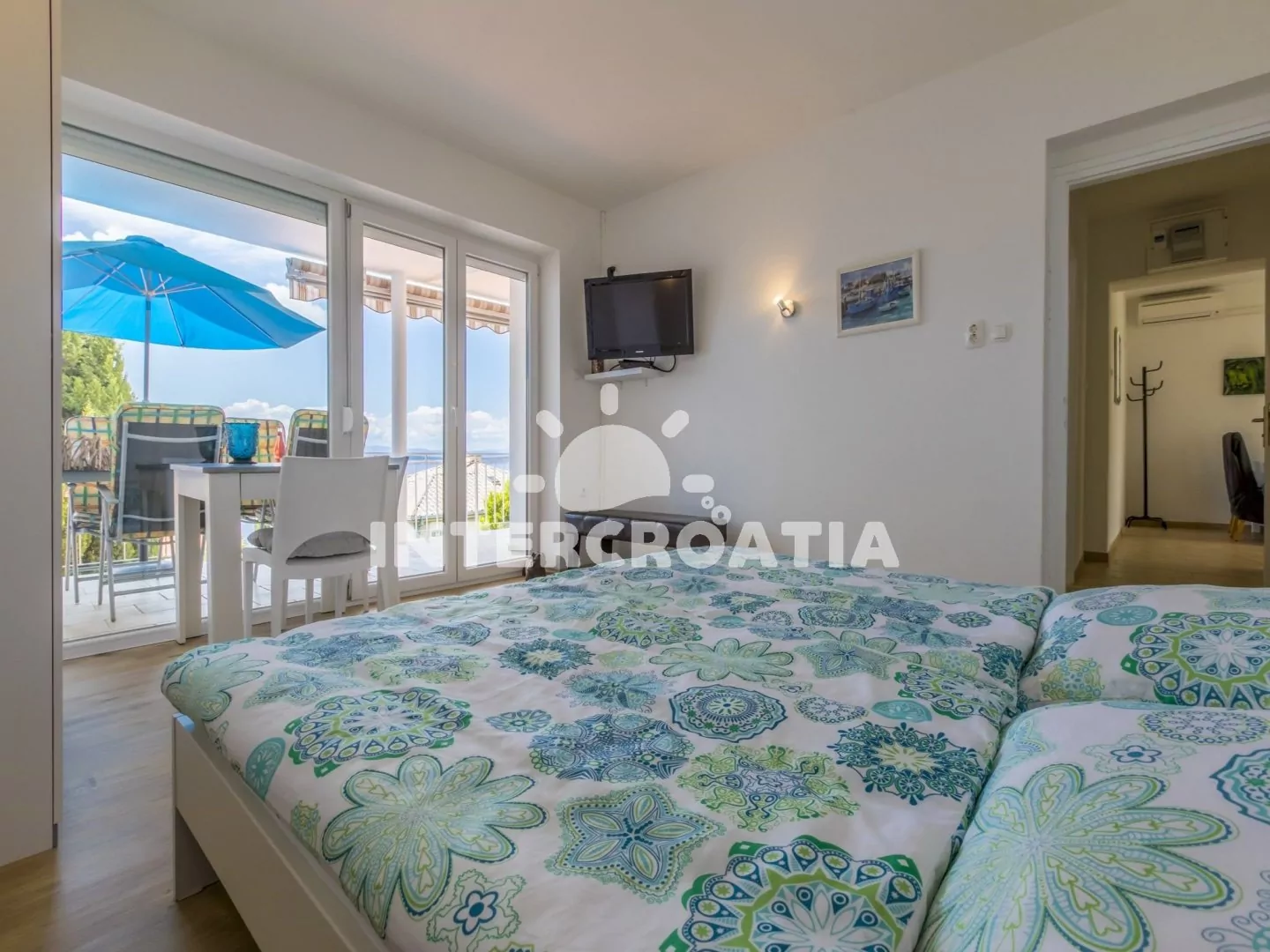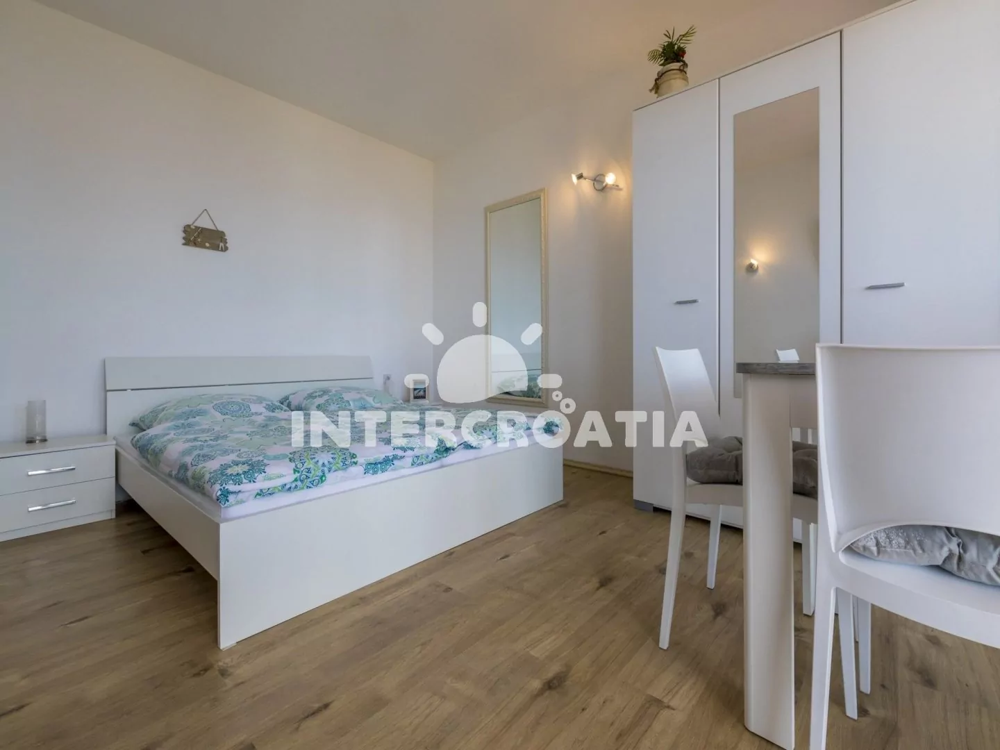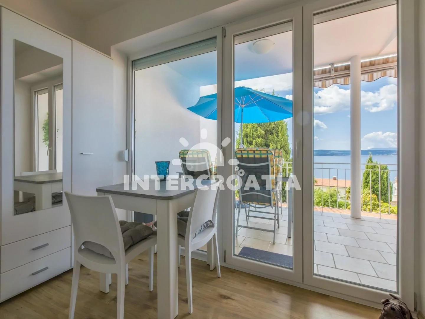 Apartmán (80 m2) s terasou a výhledem na moře, se nachází v přízemí domu a je vhodný pro 4 až 6 osob. Kuchyňská linka je vybavena varnou deskou, myčkou na nádobí, rychlovarnou konvicí, kávovarem, toustovačem, nádobím a lednicí s mrazákem. Obývací pokoj s pohovkou (rozložitelná na extra lůžko pro 2 osoby) a vstupem na terasu. První i druhá ložnice je vybavena vždy s jedním dvoulůžkem, televizí se satelitním programem a vstupem na terasu. Koupelna se sprchovým koutem, umyvadlem, fénem a wc. Dále samostatné wc. Hostům je k dispozici parkování u objektu zdarma.
