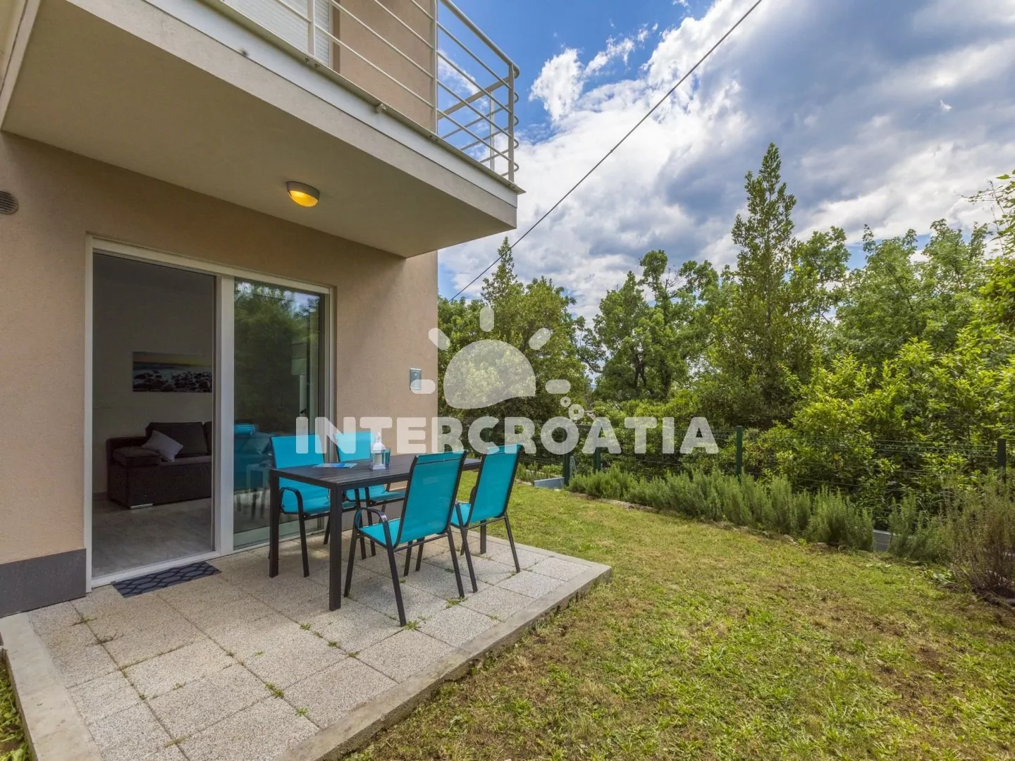 Apartmán (40 m2) s terasou a venkovním posezením se nachází v přízemí objektu a je vhodný pro 2 až 4 osoby. Obývací pokoj je spojený s kuchyní. Kuchyňská linka je vybavena sklokeramickou varnou deskou, digestoří, vestavěnou troubou, myčkou na nádobí, mikrovlnnou troubou, rychlovarnou konvicí, kávovarem, toustovačem, nádobím a lednicí s mrazákem. Obývací pokoj s jídelním stolem pro 4 osoby, pohovkou (rozložitelná na extra lůžko pro 2 osoby), televizí se satelitním programem, klimatizací a vstupem na terasu. Ložnice s jedním dvoulůžkem. Koupelna se sprchovým koutem, umyvadlem a wc. Hostům je k dispozici parkování v garážích a u objektu zdarma.