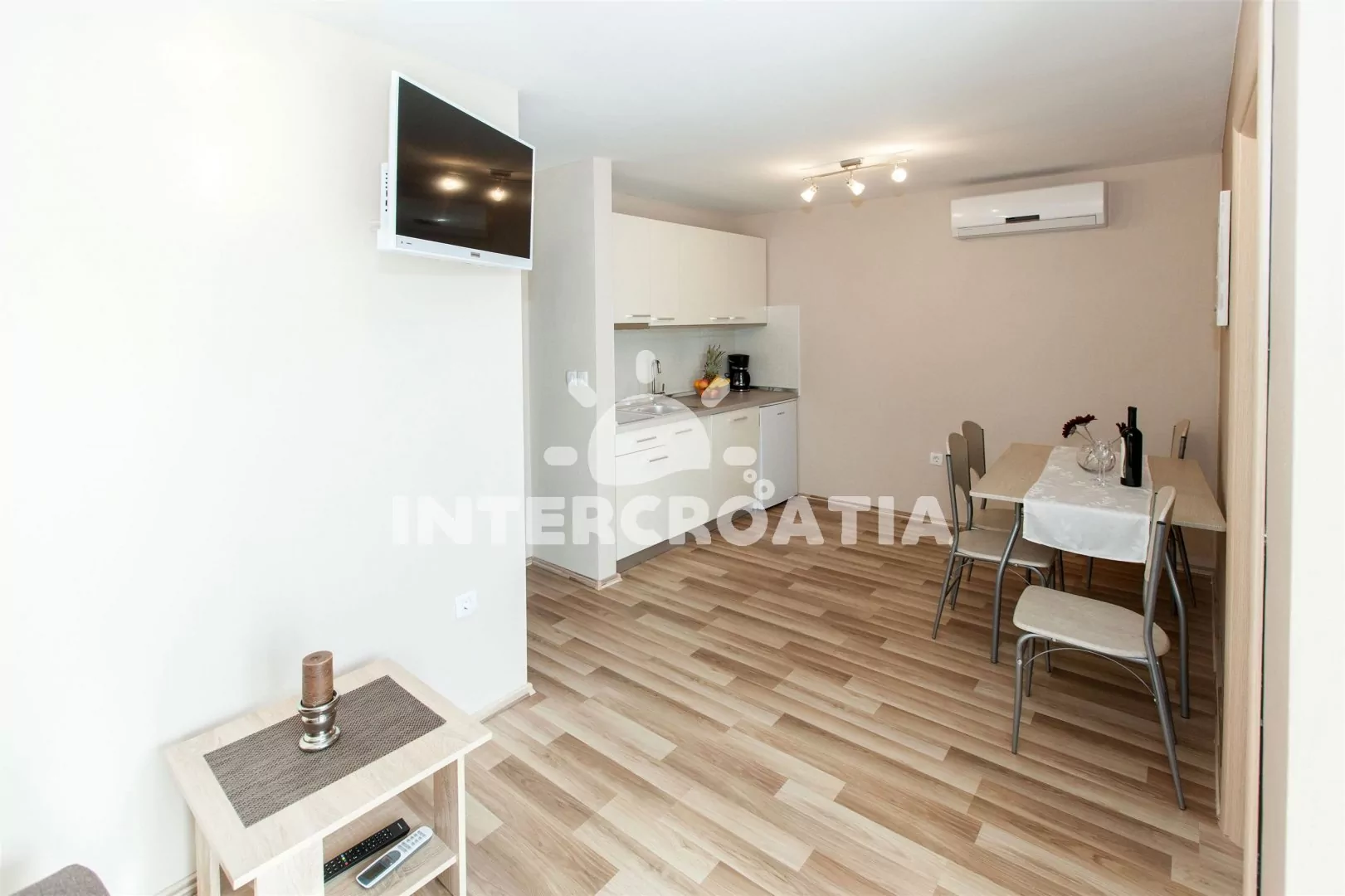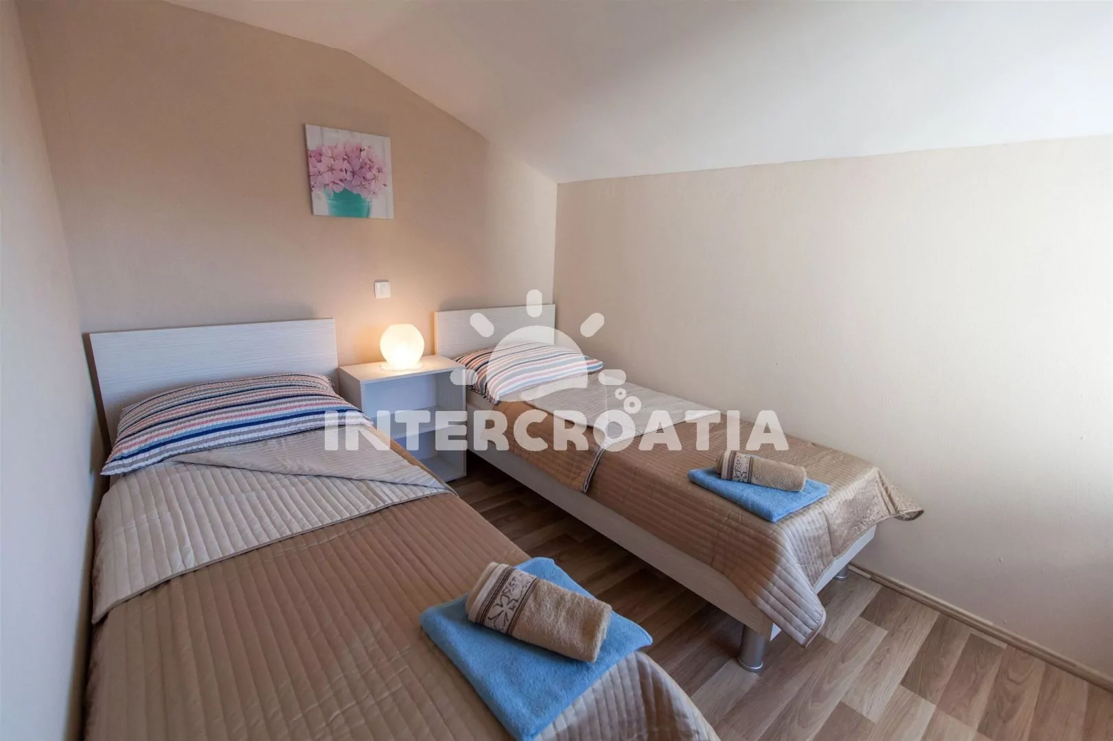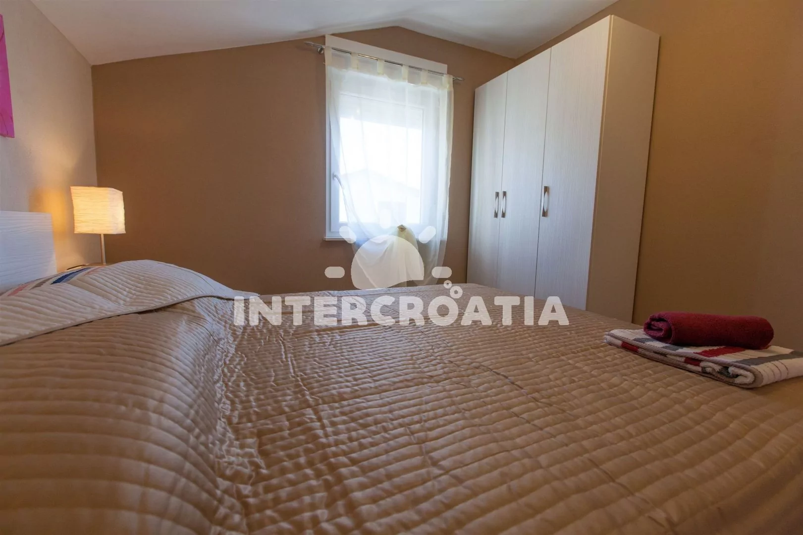 Apartmán (42 m2) s balkonem a výhledem na moře se nachází v 2. patře domu a je vhodný pro 4 osoby. Obývací pokoj je spojený s kuchyní. Kuchyňská linka je vybavena sklokeramickou varnou deskou, digestoří, mikrovlnnou troubou, myčkou na nádobí, rychlovarnou konvicí, kávovarem, nádobím a lednicí s mrazákem. Obývací pokoj s jídelním stolem pro 4 osoby, pohovkou, televizí se satelitním programem, klimatizací a vstupem na balkon. První ložnice s dvoulůžkem. Druhá ložnice s dvěma jednolůžky. Koupelna se sprchovým koutem, umyvadlem a wc. Hostům je k dispozici parkování u objektu zdarma.