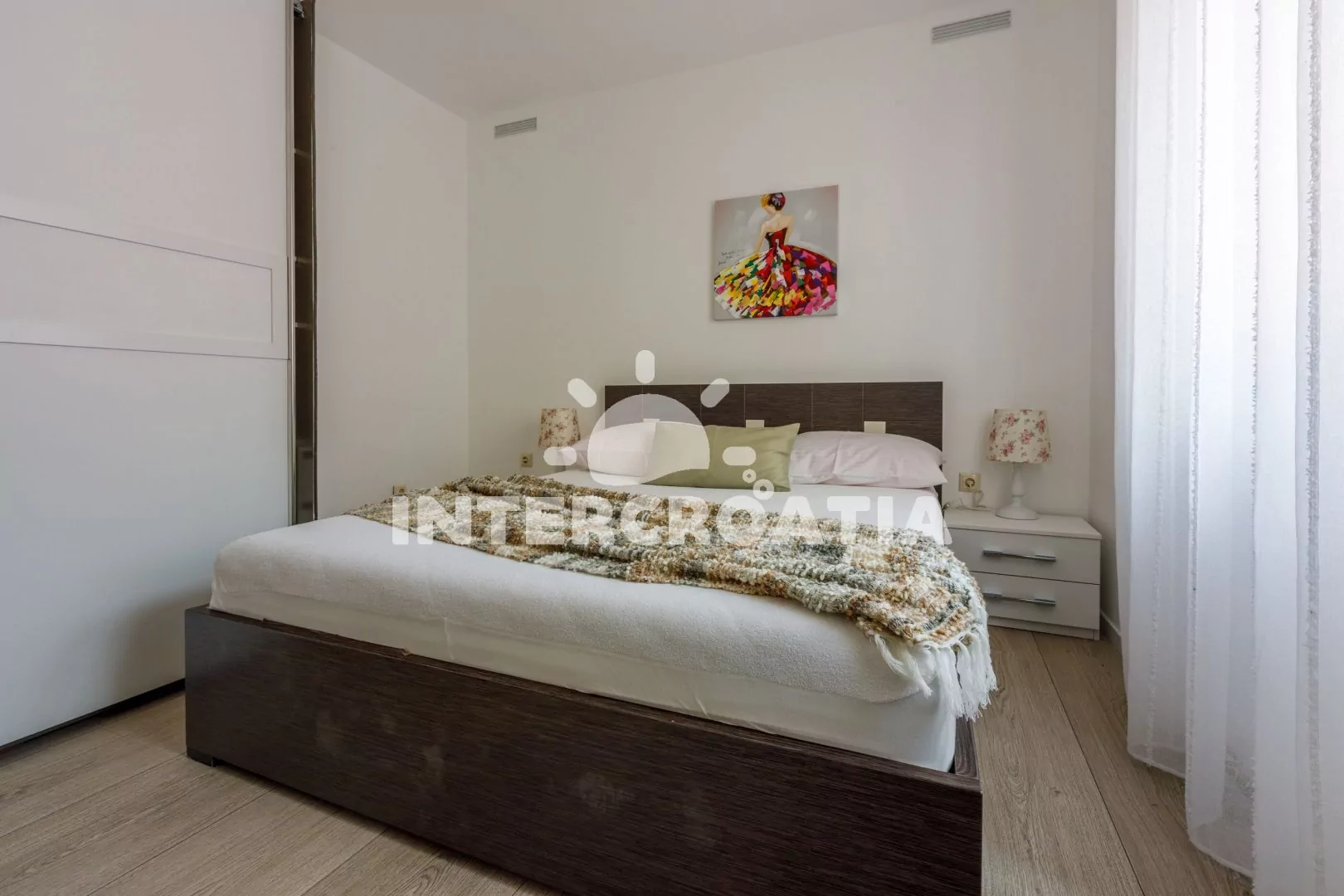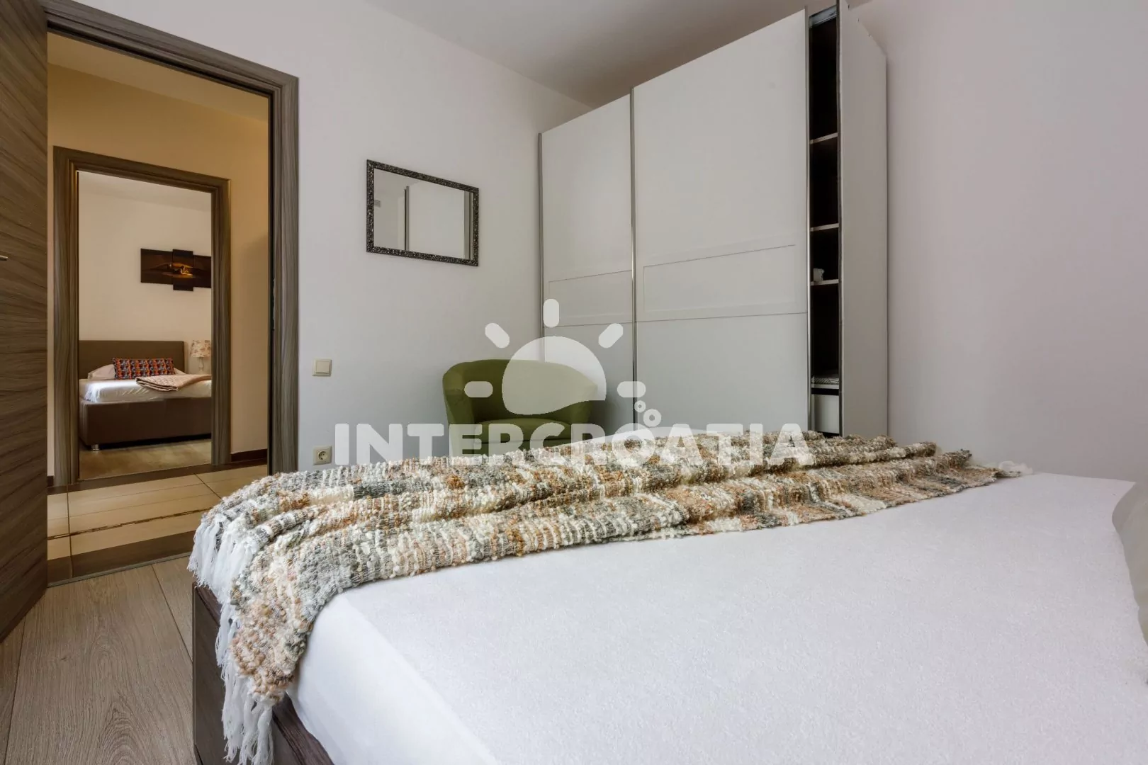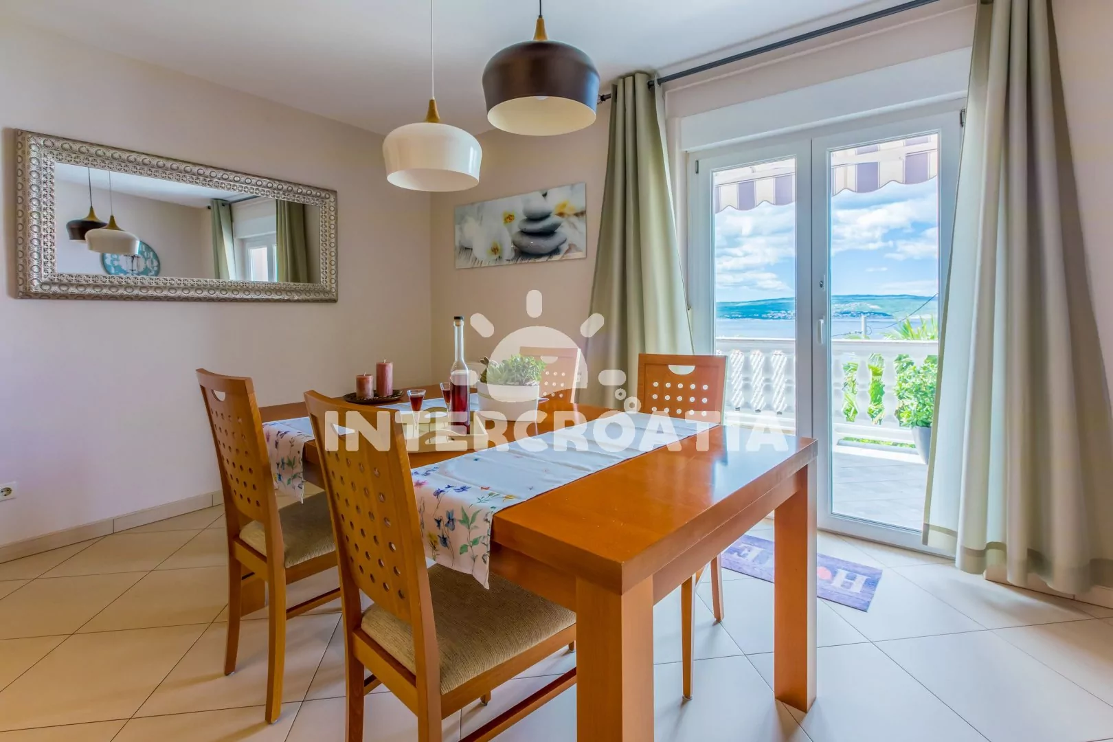 Prostorný a vkusně zařízený apartmán (98 m2) s vlastní terasou a výhledem na moře se nachází ve zvýšeném přízemí vily. Apartmán je vhodný pro 4 osoby. Kuchyň s jídelním stolem pro 4 osoby, moderní kuchyňskou linkou a vstupem na terasu. Kuchyňská linka je vybavena sklokeramickou varnou deskou, digestoří, vestavěnou troubou, myčkou na nádobí, rychlovarnou konvicí, kávovarem, toustovačem, nádobím a lednicí s mrazákem. Obývací pokoj se sedací soupravou, rohovou pohovkou, televizí se satelitním programem, radiem a vstupem na terasu. Chodba s klimatizací a vstupy do ložnic. První ložnice s dvoulůžkem. Druhá ložnice s dvěma jednolůžky. Koupelna se sprchovým koutem, umyvadlem, fénem, bidetem a wc. Hostům je k dispozici parkování u objektu zdarma.