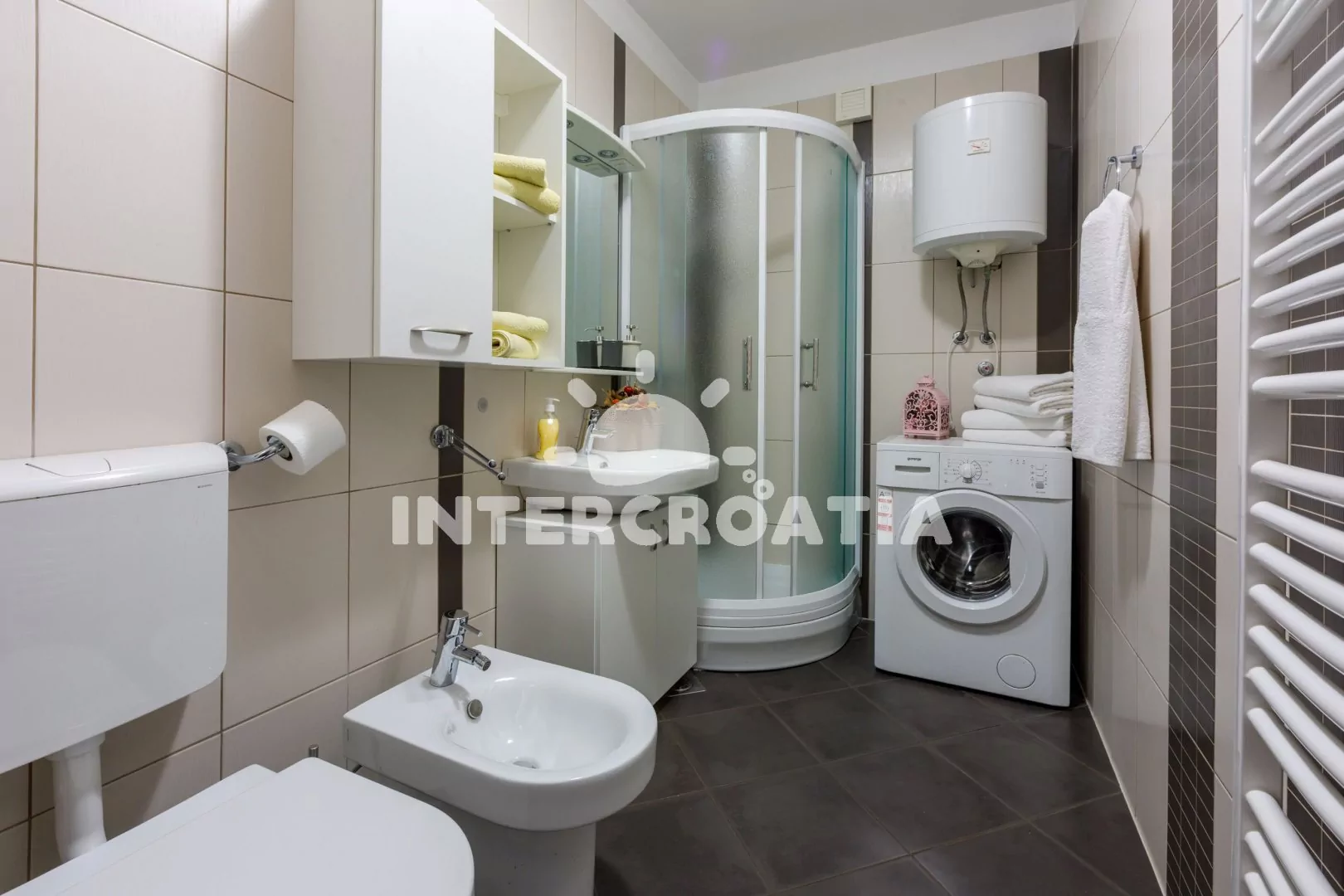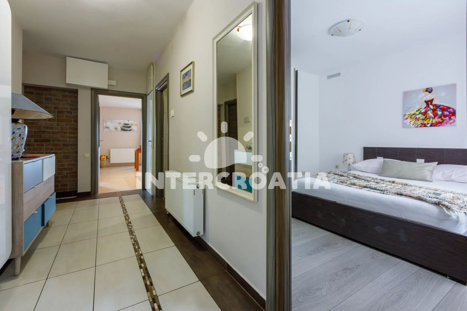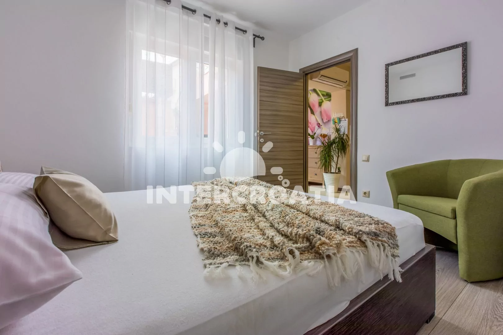 Prostorný a vkusně zařízený apartmán (98 m2) s vlastní terasou a výhledem na moře se nachází ve zvýšeném přízemí vily. Apartmán je vhodný pro 4 osoby. Kuchyň s jídelním stolem pro 4 osoby, moderní kuchyňskou linkou a vstupem na terasu. Kuchyňská linka je vybavena sklokeramickou varnou deskou, digestoří, vestavěnou troubou, myčkou na nádobí, rychlovarnou konvicí, kávovarem, toustovačem, nádobím a lednicí s mrazákem. Obývací pokoj se sedací soupravou, rohovou pohovkou, televizí se satelitním programem, radiem a vstupem na terasu. Chodba s klimatizací a vstupy do ložnic. První ložnice s dvoulůžkem. Druhá ložnice s dvěma jednolůžky. Koupelna se sprchovým koutem, umyvadlem, fénem, bidetem a wc. Hostům je k dispozici parkování u objektu zdarma.