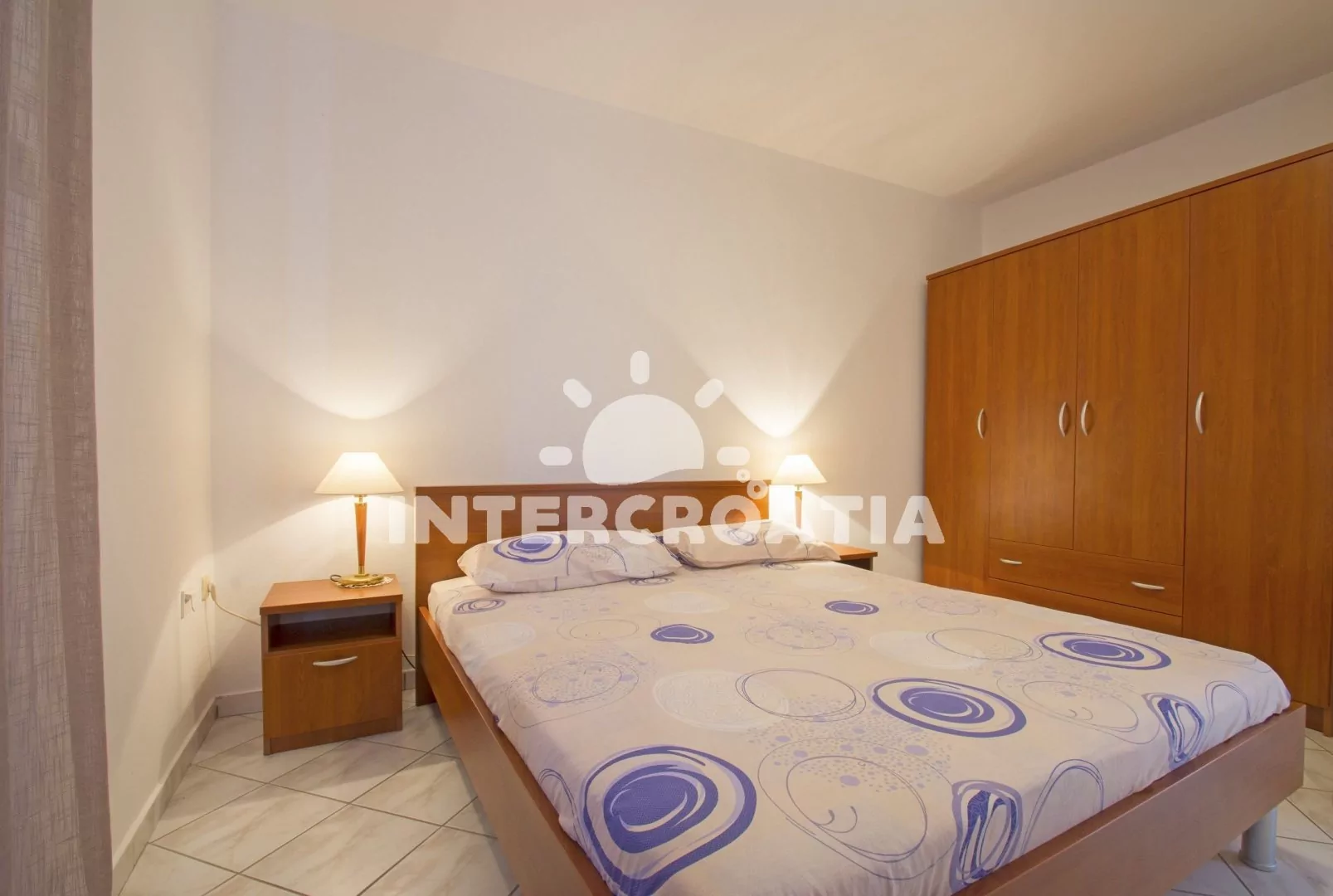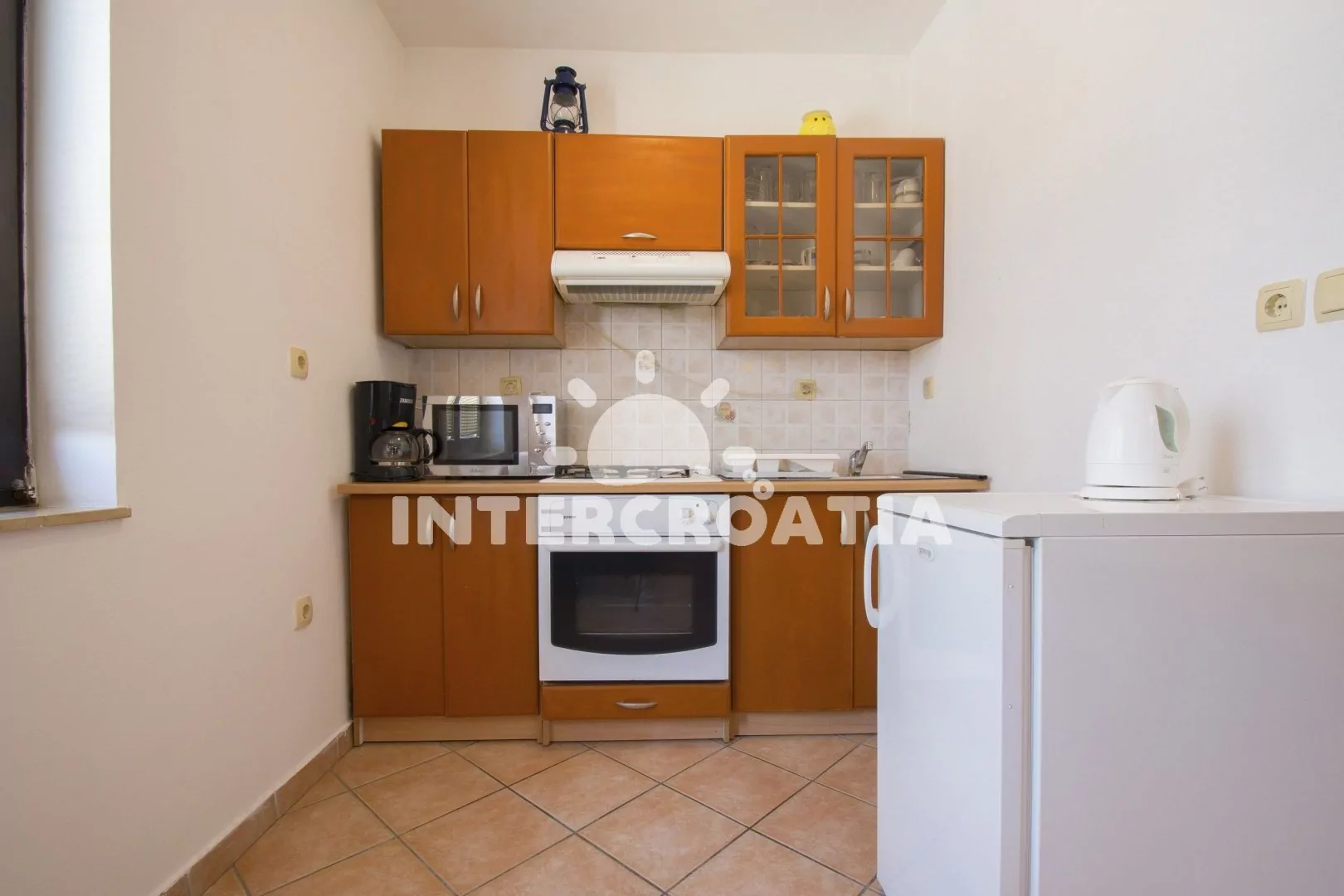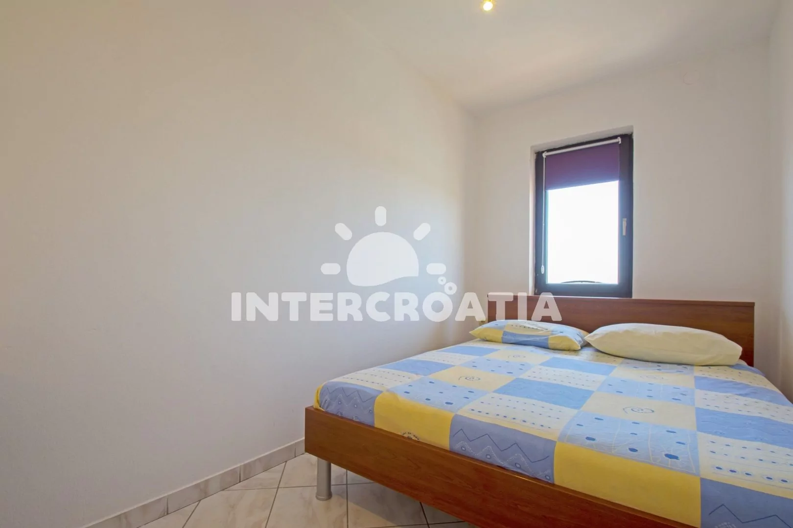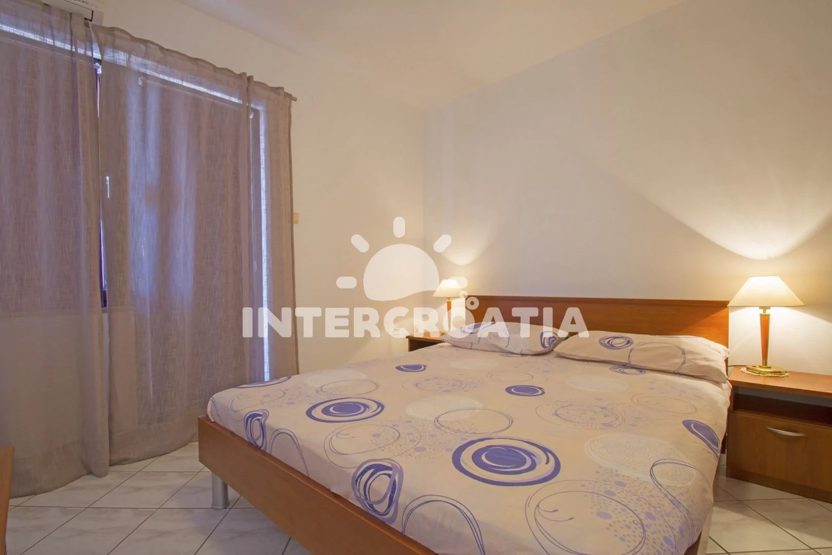 Apartmán (65 m2) s balkonem a výhledem na moře se nachází v 1. patře domu a je vhodný pro 4 osoby. Obývací pokoj je spojený s kuchyní. Kuchyňská linka je vybavena varnou deskou, digestoří, troubou, rychlovarnou konvicí, kávovarem, nádobím a lednicí s mrazákem. Obývací pokoj s jídelním stolem pro 4 osoby, pohovkou, konferenčním stolem, televizí se satelitním programem a klimatizací. První ložnice s dvoulůžkem a vstupem na balkon. Druhá ložnice s dvoulůžkem. Koupelna se sprchovým koutem, umyvadlem a wc. Hostům je k dispozici parkování u objektu zdarma.