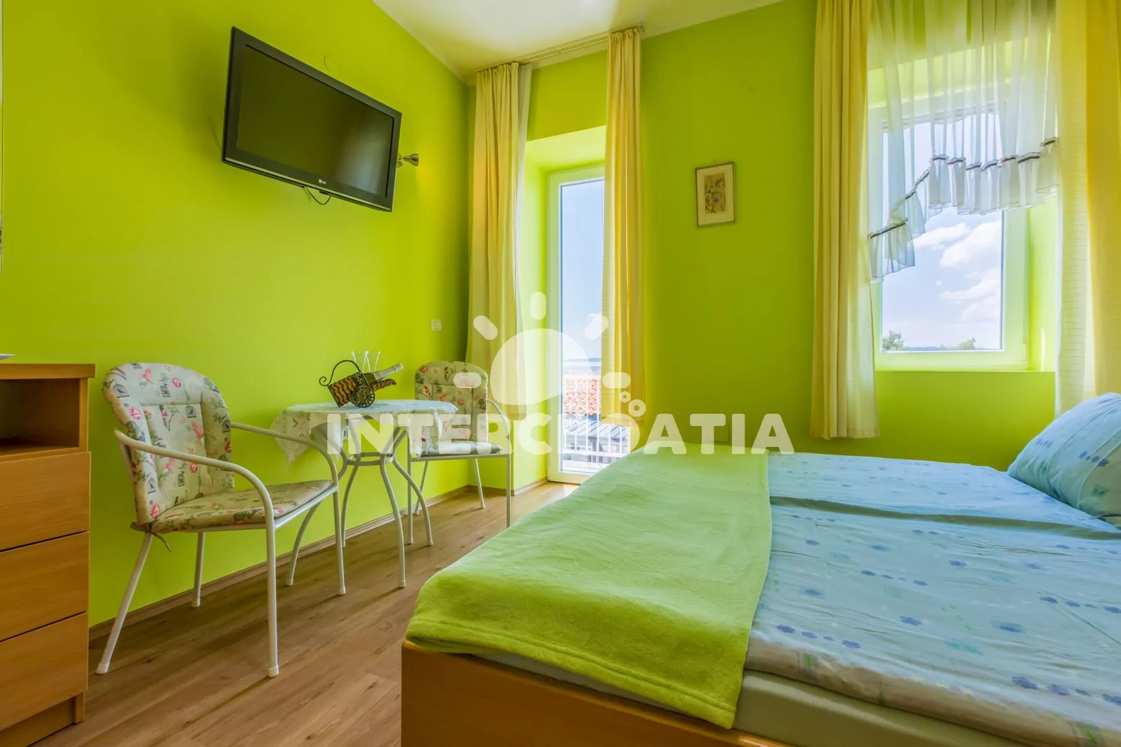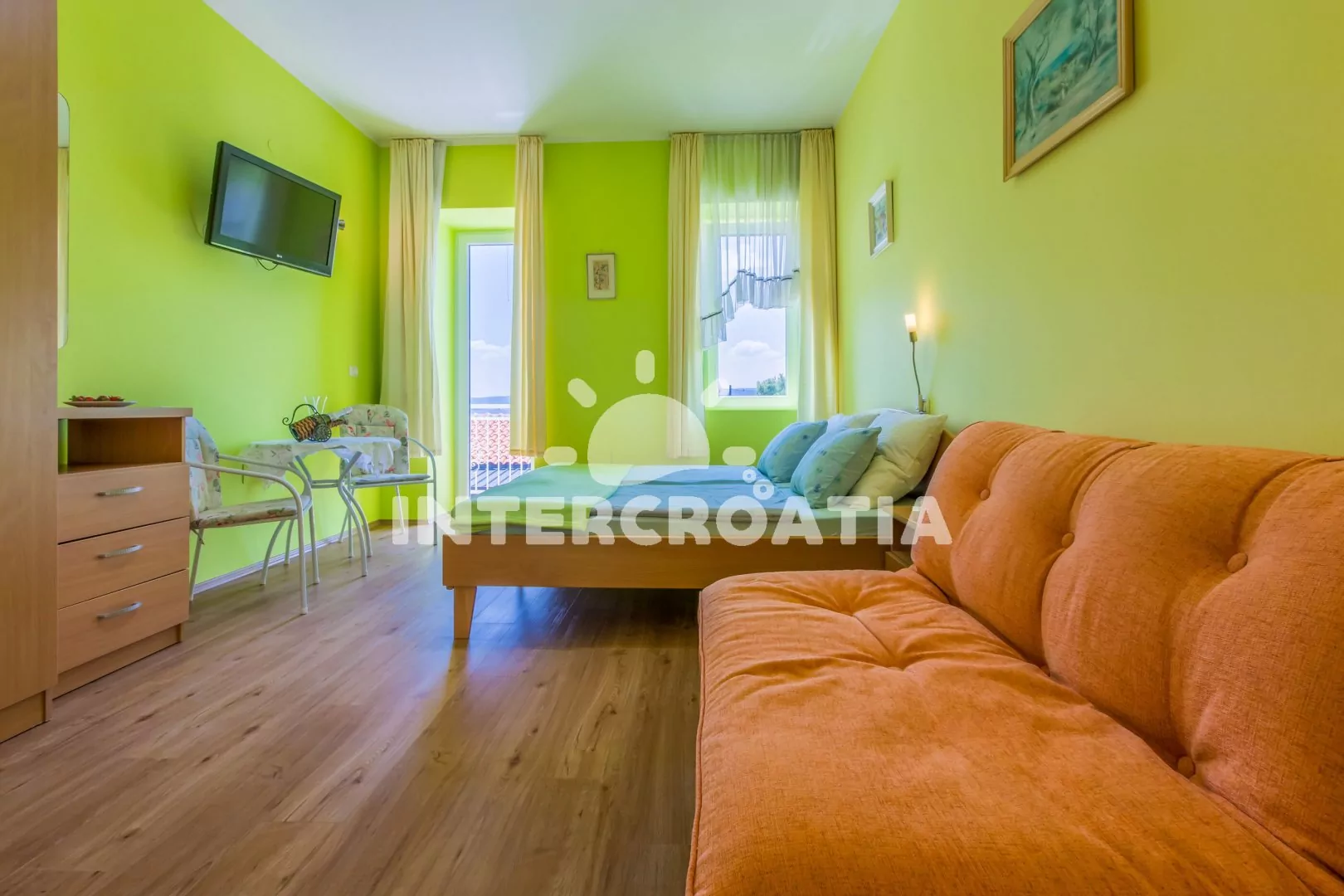 Apartmán (28 m2) s balkonem a výhledem na moře se nachází v 1. patře domu. Apartmán je vhodný pro 2 osoby. Obývací místnost je spojena s kuchyní. Kuchyňská linka je vybavena dvouplotýnkovým vařičem, mikrovlnnou troubou, rychlovarnou konvicí, kávovarem, nádobím a lednicí s mrazákem. Obývací místnost s jídelním stolem pro 2 osoby, pohovkou, televizí se satelitním programem, dvoulůžkem, klimatizací a vstupem na balkon. Koupelna se sprchovým koutem, umyvadlem a wc. Pračka je k dispozici u pronajímatele.