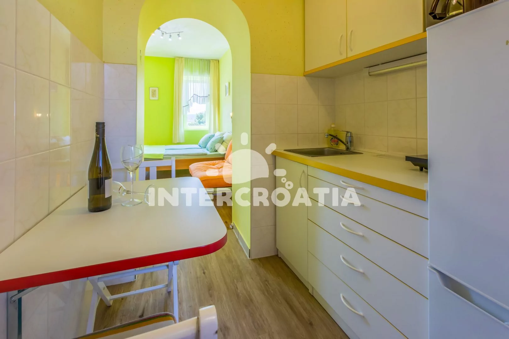 Apartmán (28 m2) s balkonem a výhledem na moře se nachází v 1. patře domu. Apartmán je vhodný pro 2 osoby. Obývací místnost je spojena s kuchyní. Kuchyňská linka je vybavena dvouplotýnkovým vařičem,…