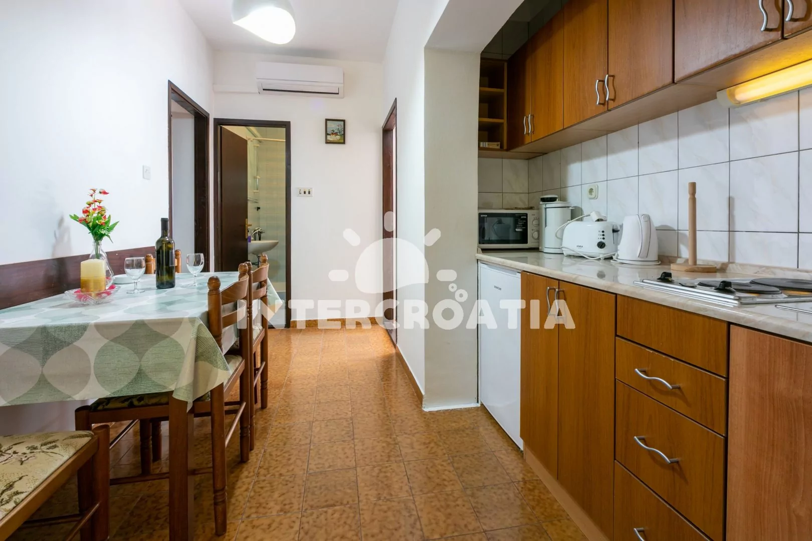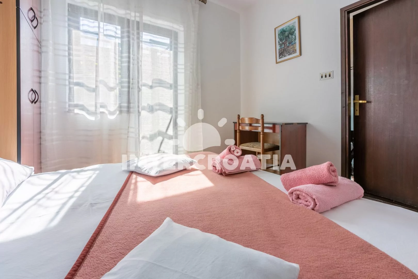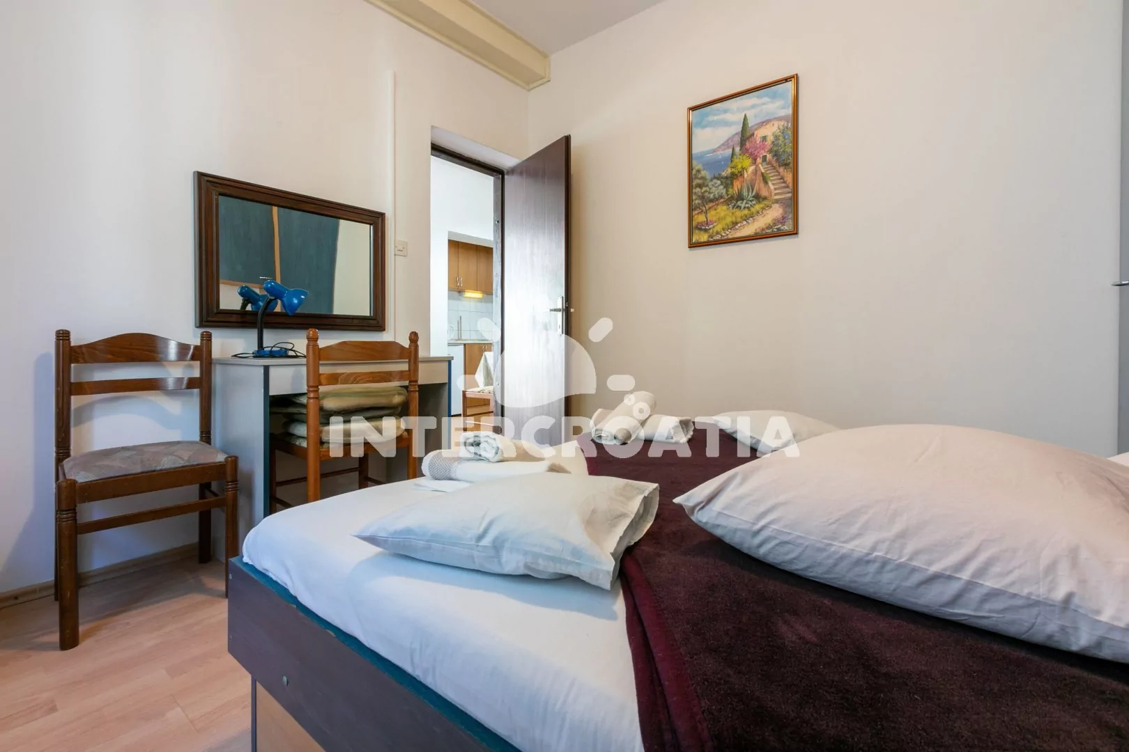 Apartmán (52 m2) ve zvýšeném přízemí se dvěma ložnicemi pro celkem 4 osoby. Kuchyně s varnou deskou (2 plotýnky), lednicí s mrazicí přihrádkou, rychlovarnou konvicí, mikrovlnnou troubou, toustovačem, kávovarem, TV se satelitem, klimatizací a nádobím. Ložnice s dvoulůžkem, úložným prostorem a psacím stolem se zrcadlem. Druhá ložnice s dvoulůžkem, psacím stolem a úložným prostorem. Koupelna se sprchou, umyvadlem a WC. Druhá koupelna se sprchovým koutem, umyvadlem, pračkou a WC. Balkon s částečným výhledem na moře. Sdílená terasa s posezením. Parkování před objektem.