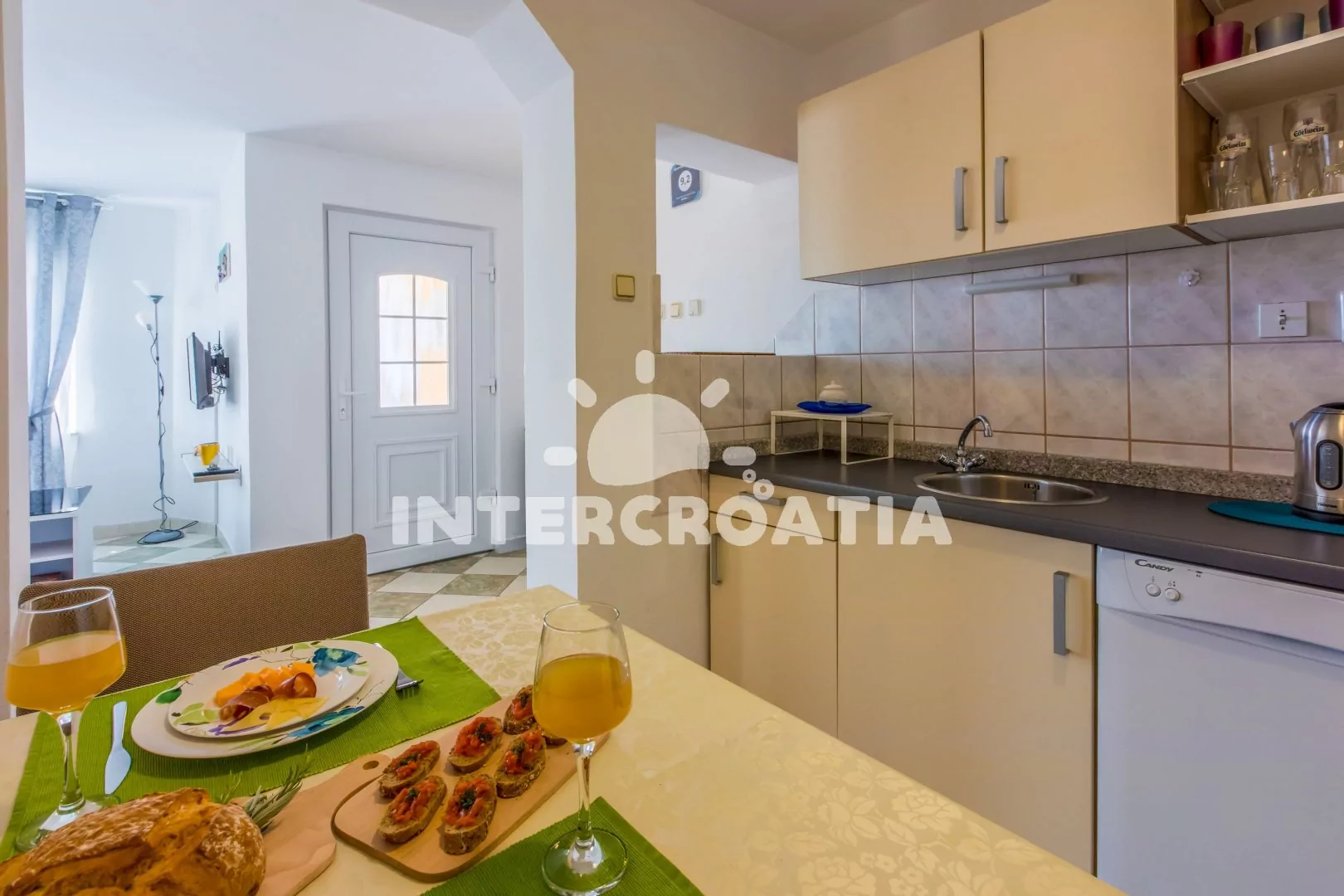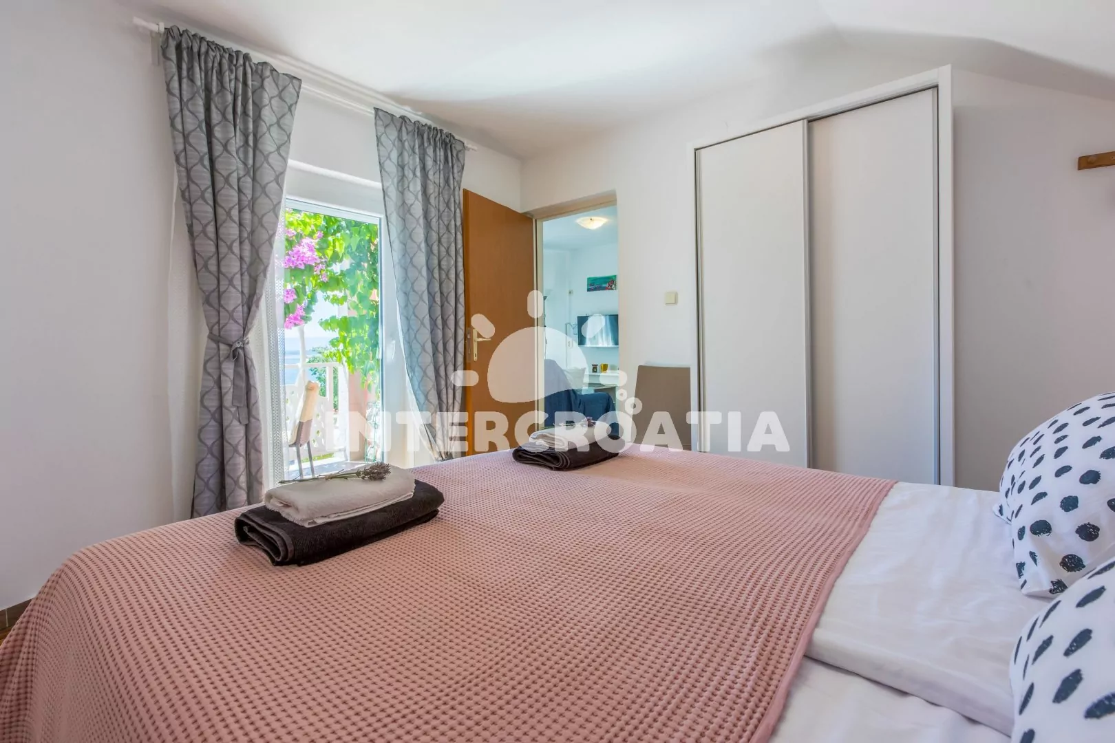 Moderně zařízený apartmán (60 m2) s terasou a výhledem na moře se nachází ve zvýšeném přízemí. Apartmán je vhodný pro 2 až 4 osoby. Obývací pokoj je spojený s kuchyní. Kuchyňská linka je vybavena sklokeramickou varnou deskou, digestoří, vestavěnou troubou, myčkou na nádobí, kávovarem, mikrovlnnou troubou, rychlovarnou konvicí, toustovačem, nádobím a lednicí s mrazákem. Obývací pokoj s jídelním stolem, pohovkou (rozložitelná na extra lůžko pro 2 osoby), televizí se satelitním programem a klimatizací. Ložnice s dvoulůžkem a vstupem na terasu. Koupelna se sprchovým koutem, umyvadlem, fénem a wc. Dále je apartmán vybavený žehličkou a sejfem. Hostům je k dispozici parkování u objektu zdarma.