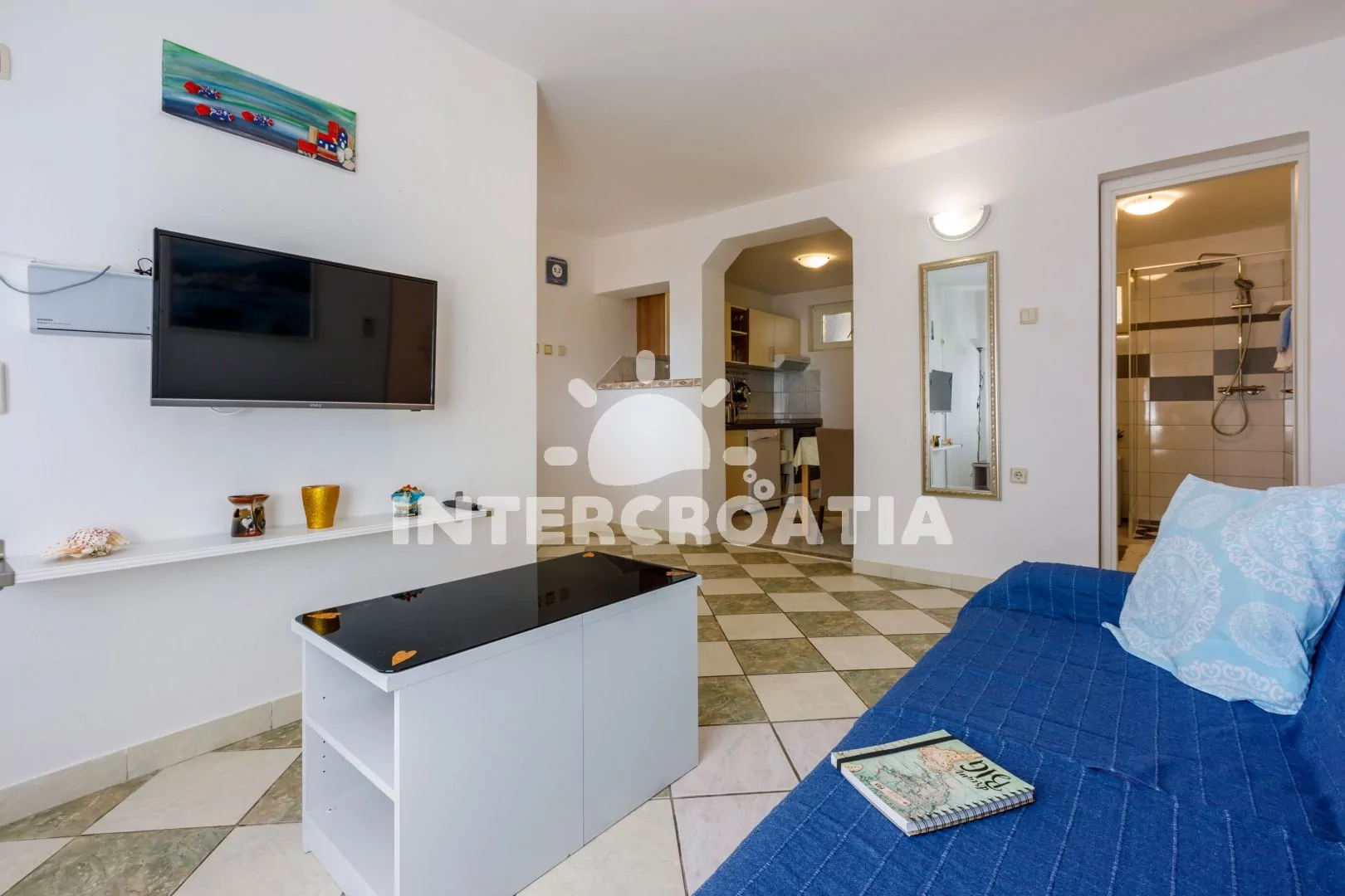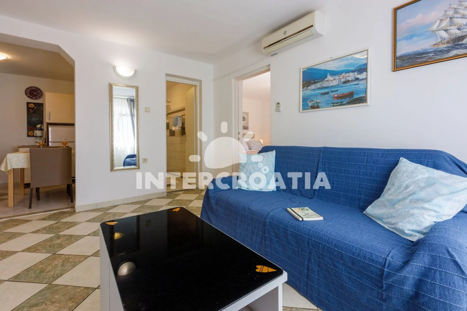 Moderně zařízený apartmán (60 m2) s terasou a výhledem na moře se nachází ve zvýšeném přízemí. Apartmán je vhodný pro 2 až 4 osoby. Obývací pokoj je spojený s kuchyní. Kuchyňská linka je vybavena…