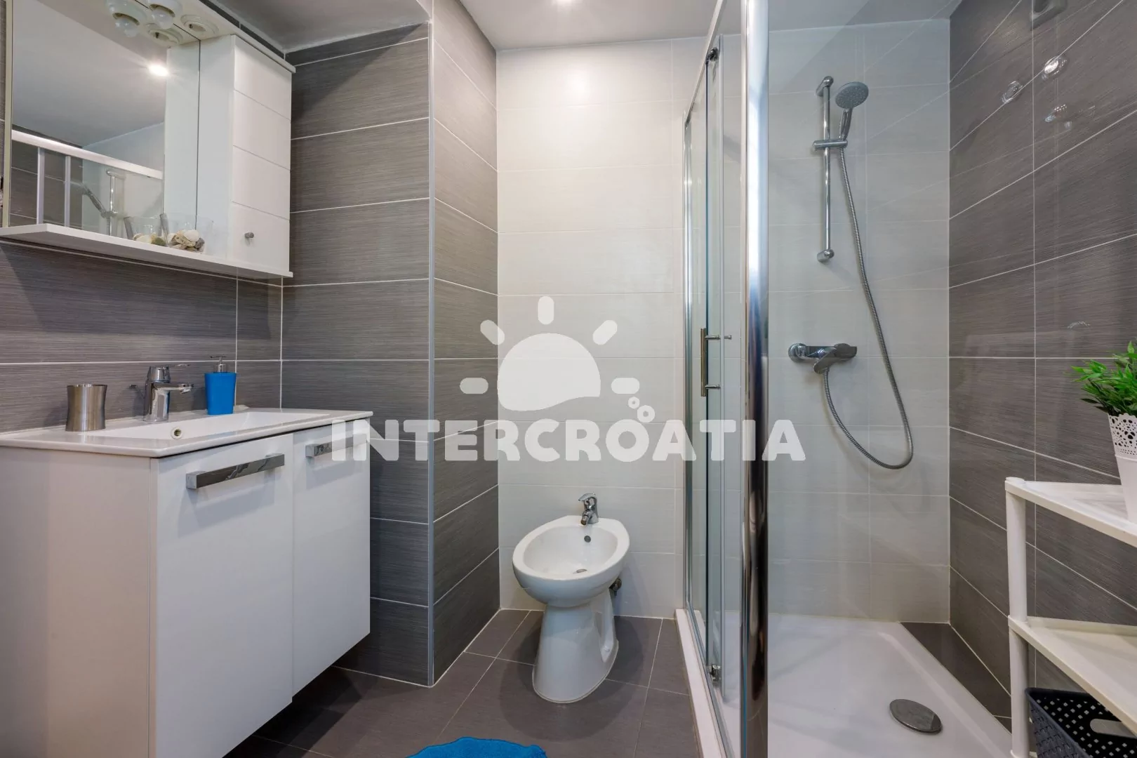 Apartmán (40 m2) s terasou a venkovním posezením se nachází v přízemí domu a je vhodný pro 2 až 4 osoby. Obývací pokoj je spojený s kuchyní. Kuchyňská linka je vybavena sporákem s troubou, rychlovarnou konvicí, kávovarem, mikrovlnnou troubou, toustovačem, nádobím a lednicí s mrazákem. Obývací pokoj s jídelním stolem pro 4 osoby, pohovkou (rozložitelná na extra lůžko pro 2 osoby), televizí se satelitním programem, radiem, klimatizací a vstupem na terasu. Ložnice s jedním dvoulůžkem. Koupelna se sprchovým koutem, umyvadlem, fénem, bidetem a wc. Hostům je k dispozici parkování u objektu zdarma.