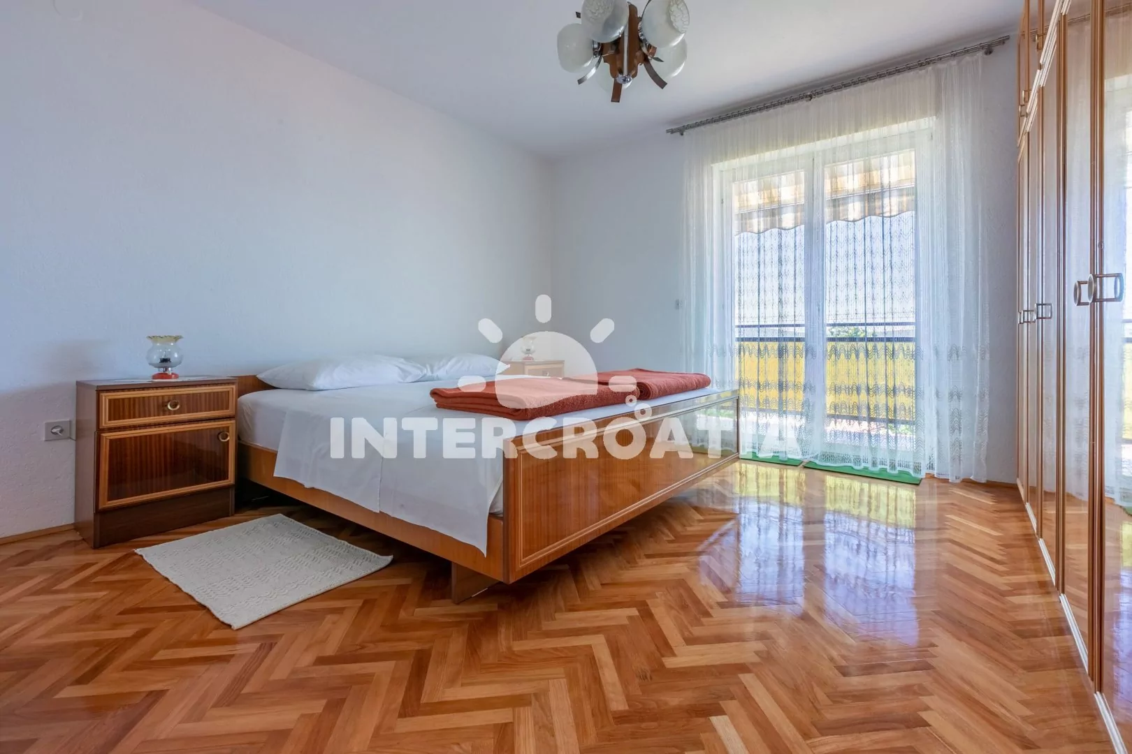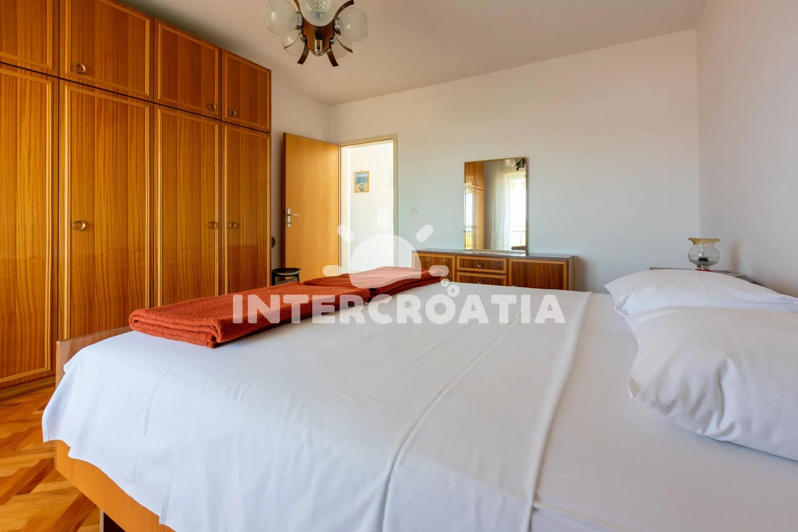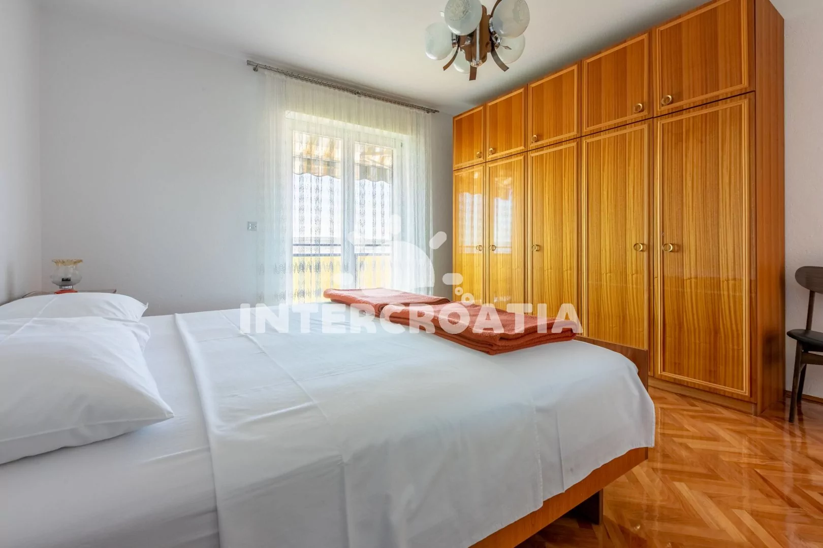 Apartmán (72 m2) s balkonem, venkovním posezením a výhledem na moře se nachází ve 2. patře domu. Apartmán má 2 ložnice a je vhodný pro 4 až 5 osob. Obývací pokoj je spojený s kuchyní. Kuchyňská linka je vybavena sporákem s troubou, digestoří, rychlovarnou konvicí, kávovarem, toustovačem, nádobím a lednicí s mrazákem. Obývací pokoj s jídelním stolem, pohovkou, televizí se satelitním programem a klimatizací. První ložnice s dvoulůžkem a vstupem na balkon. Druhá ložnice s dvoulůžkem, jednolůžkem a vstupem na balkon. Koupelna s vanou, sprchovou zástěnou, umyvadlem, fénem, pračkou, bidetem a wc. Dále samostatné wc s umyvadlem. Hostům je k dispozici parkování u objektu zdarma.