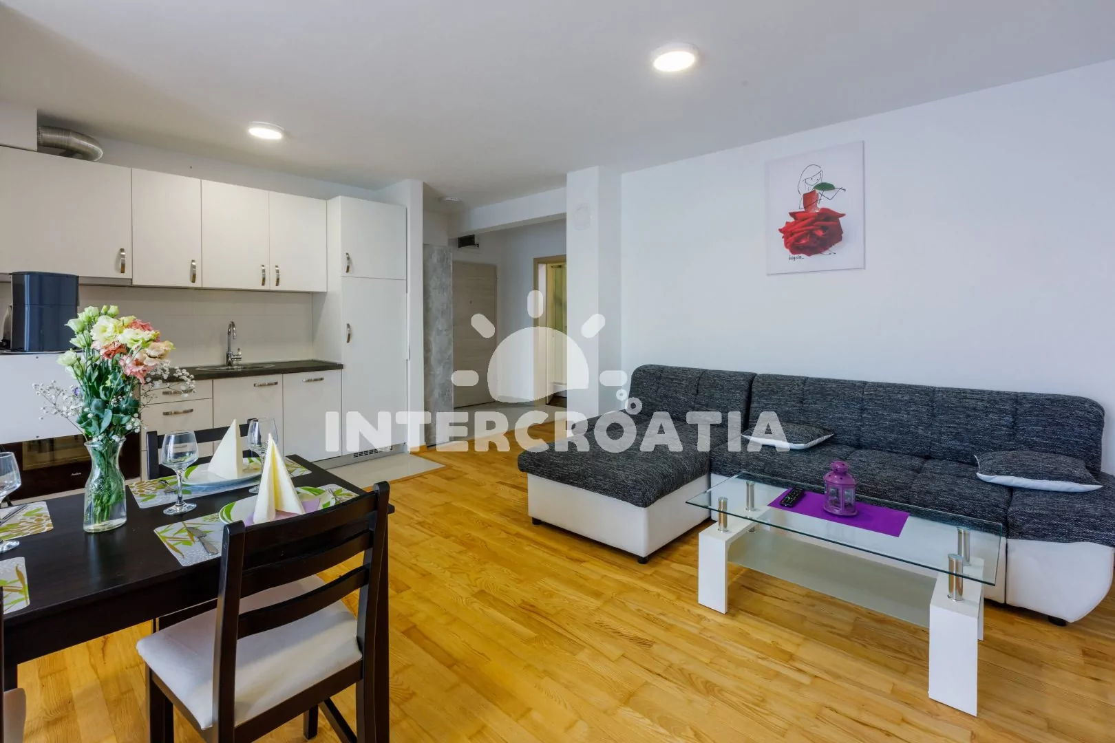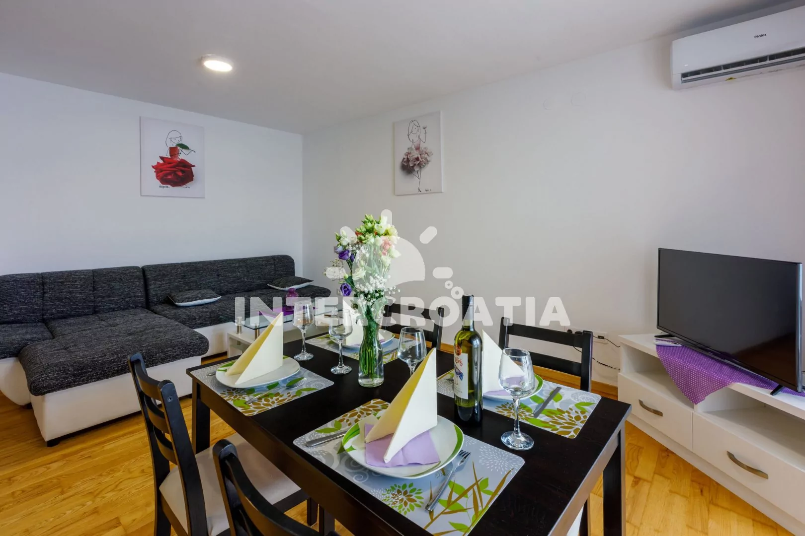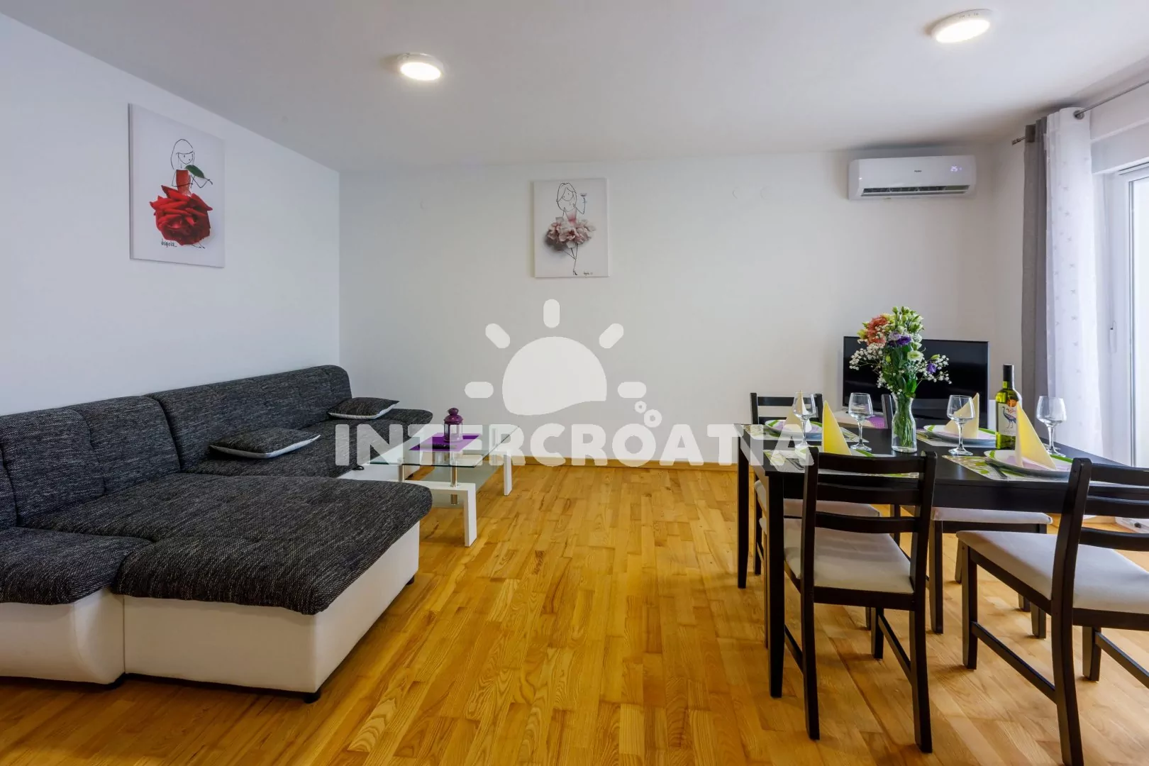 Apartmán (50 m2) s balkonem, posezením a výhledem na moře se nachází v 1. patře domu. Apartmán má 1 ložnici a je vhodný pro 2 až 3 osoby. Obývací pokoj je spojený s kuchyní. Kuchyňská linka je vybavena sklokeramickou varnou deskou, digestoří, vestavěnou troubou, myčkou na nádobí, mikrovlnnou troubou, rychlovarnou konvicí, kávovarem, toustovačem, nádobím a lednicí s mrazákem. Obývací pokoj s jídelním stolem pro 4 osoby, pohovkou (rozložitelná na extra lůžko pro 1 osobu), televizí se satelitním programem, klimatizací a vstupem na balkon. Ložnice s jedním dvoulůžkem. Koupelna se sprchovým koutem, umyvadlem, fénem, bidetem a wc. Hostům je k dispozici parkování u objektu zdarma.