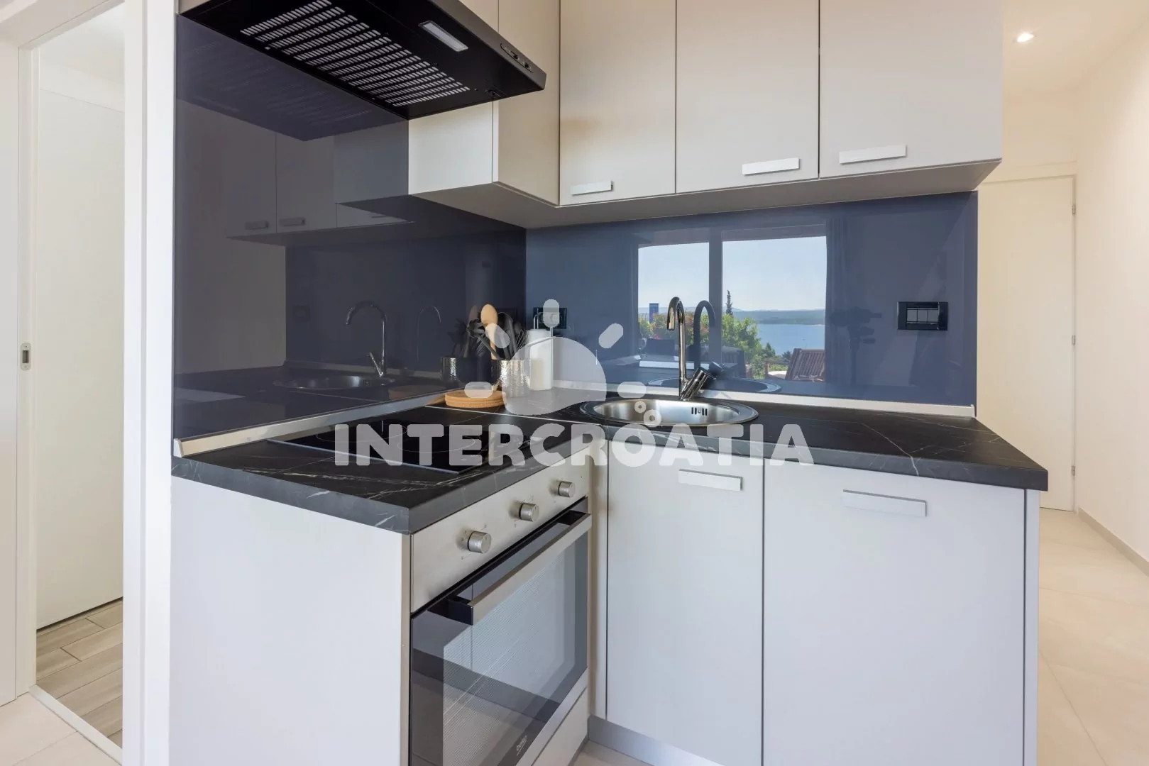 Apartmán (29 m2) s terasou, venkovním posezením a výhledem na moře se nachází v přízemí domu. Apartmán má 1 ložnici a je vhodný pro 2 až 3 osoby. Obývací pokoj je spojený s kuchyní. Kuchyňská linka je vybavena dvouplotýnkovou varnou deskou, digestoří, vestavěnou troubou, myčkou na nádobí, rychlovarnou konvicí, kávovarem, toustovačem, nádobím a lednicí s mrazákem. Obývací pokoj s jídelním stolem pro 4 osoby, pohovkou (rozložitelná na extra lůžko pro 2 osoby), televizí se satelitním programem, klimatizací a vstupem na terasu. Ložnice s jedním dvoulůžkem. Koupelna se sprchovým koutem, umyvadlem, fénem a wc. Hostům je k dispozici parkování u objektu zdarma.