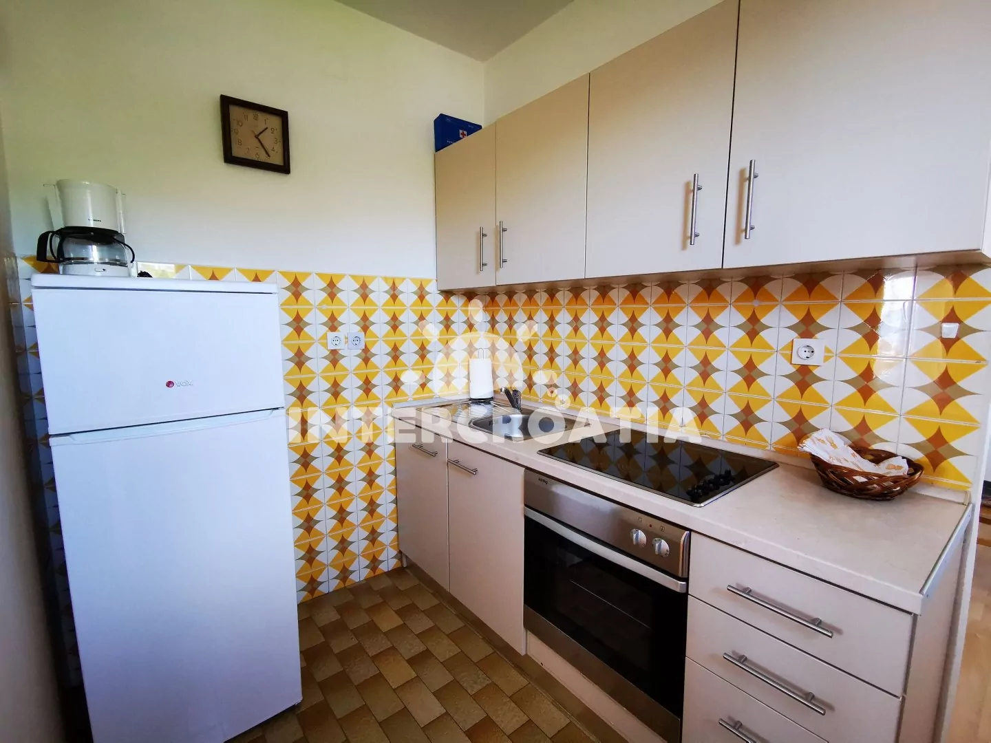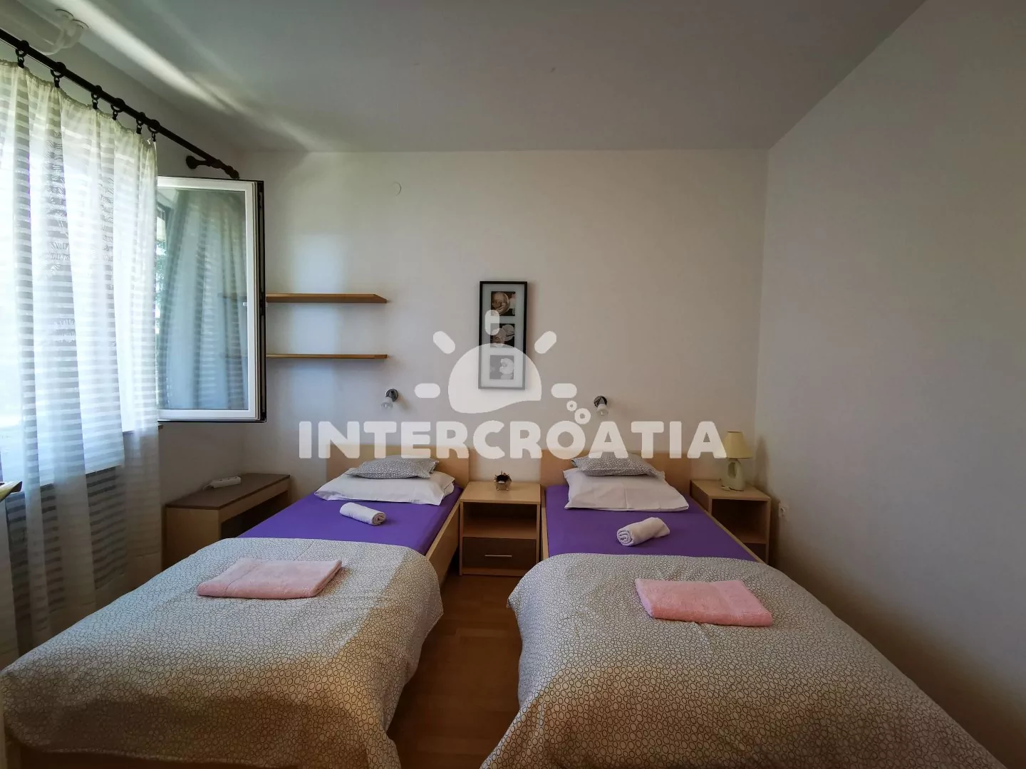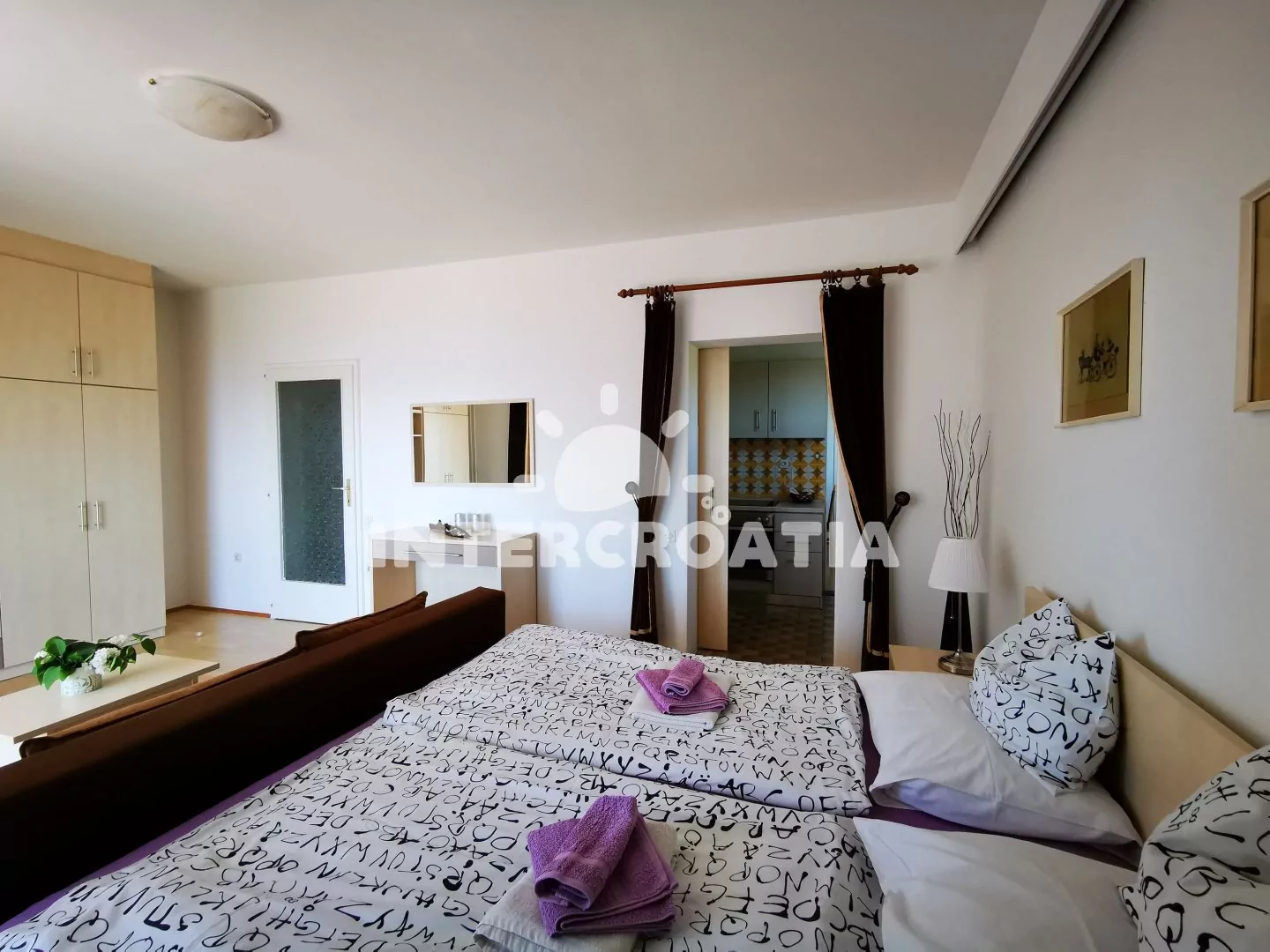 Apartmán (85 m2) s terasou a výhledem na moře se nachází v 1. patře domu. Apartmán má 3 pokoje a je vhodný pro až 6 osob. Kuchyň s jídelním stolem pro 6 osob, kuchyňskou linkou se sklokeramickou varnou deskou, vestavěnou troubou, rychlovarnou konvicí, toustovačem, kávovarem, nádobím a lednicí s mrazákem. První ložnice je spojena s obývacím pokojem a je vybavena jedním dvoulůžkem, pohovkou, televizí se satelitním programem a vstupem na terasu. Dále chodba s klimatizací a vstupem do dalších ložnic. Druhá ložnice s dvoulůžkem. Třetí ložnice s dvěma jednolůžky. Koupelna s vanou, sprchovou zástěnou, umyvadlem, fénem a wc. Dále samostatné wc. Hostům je k dispozici parkování u objektu zdarma.