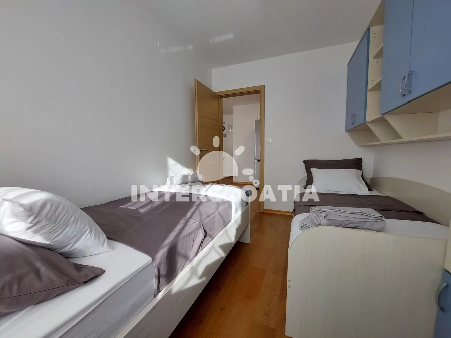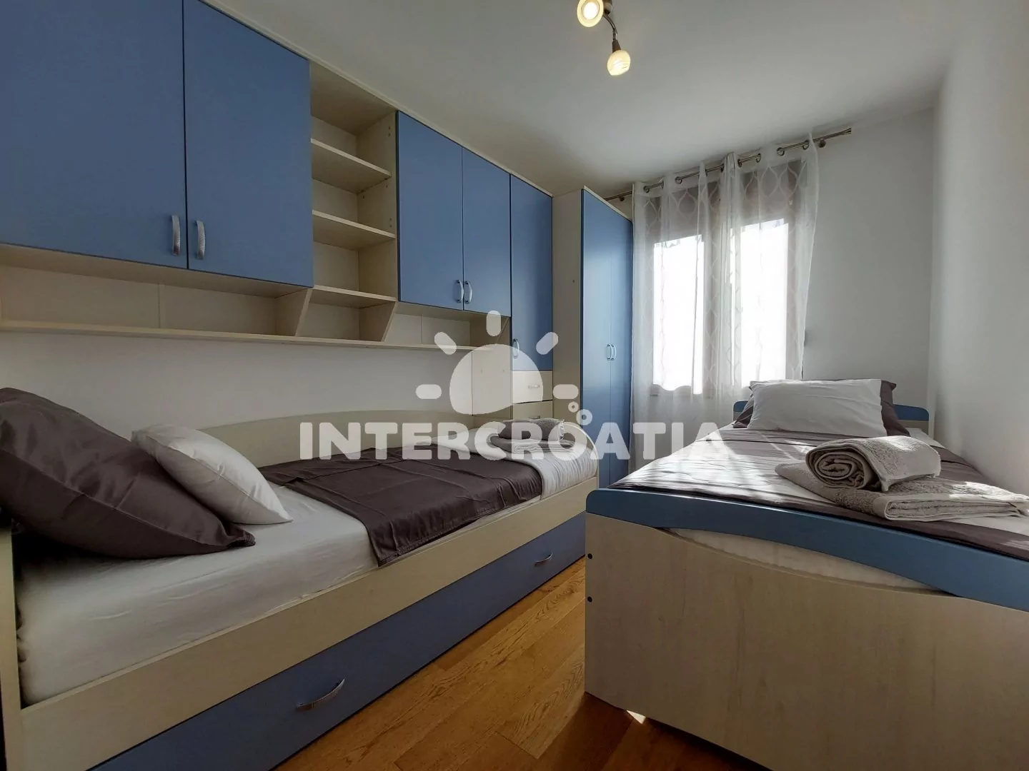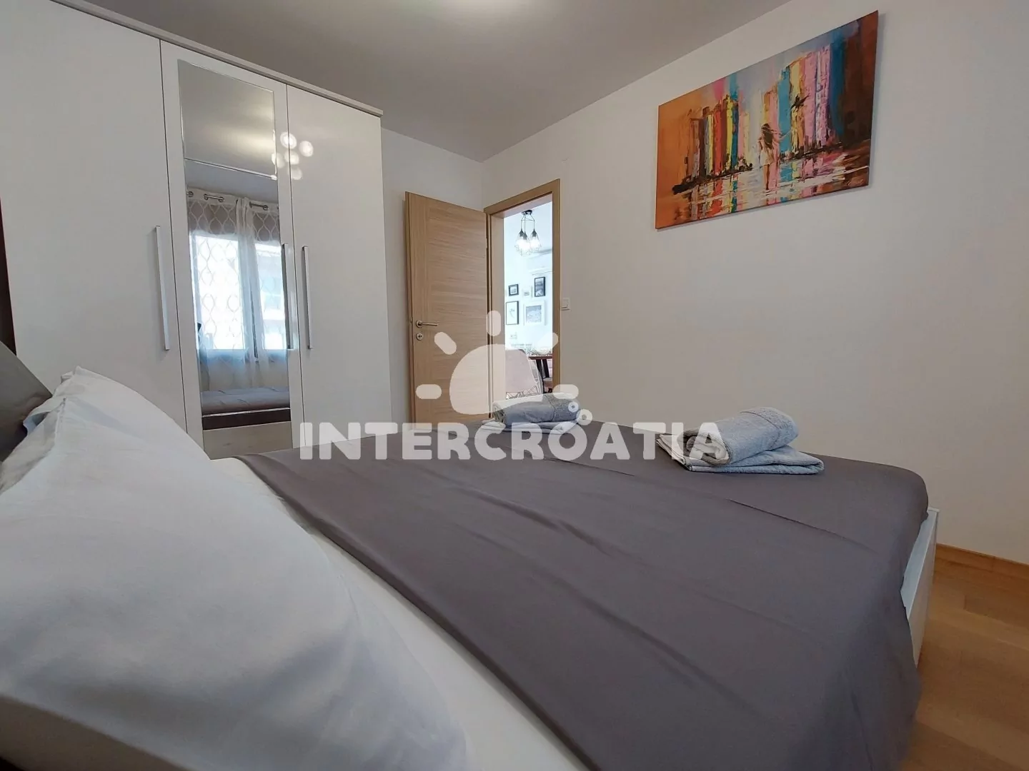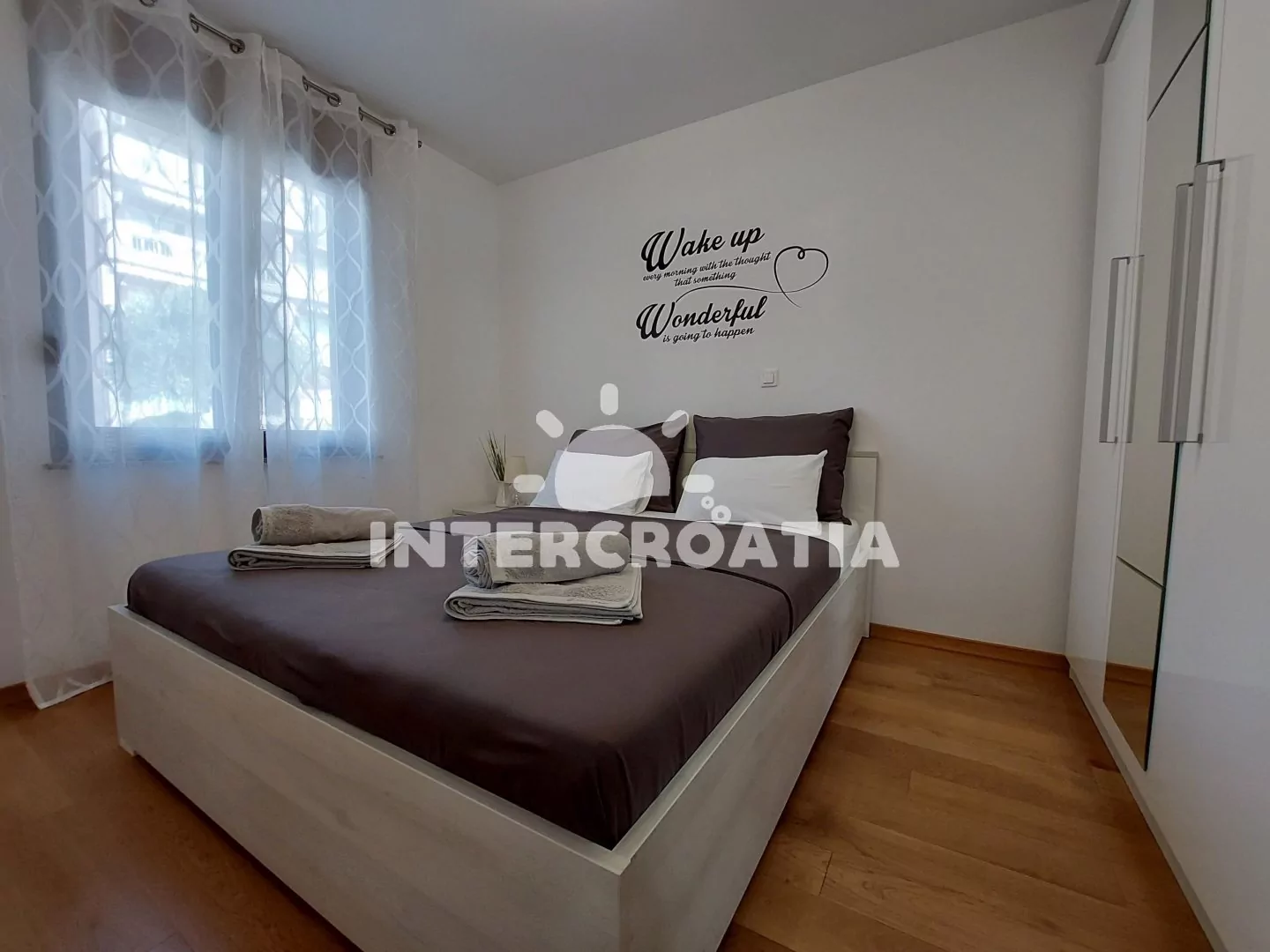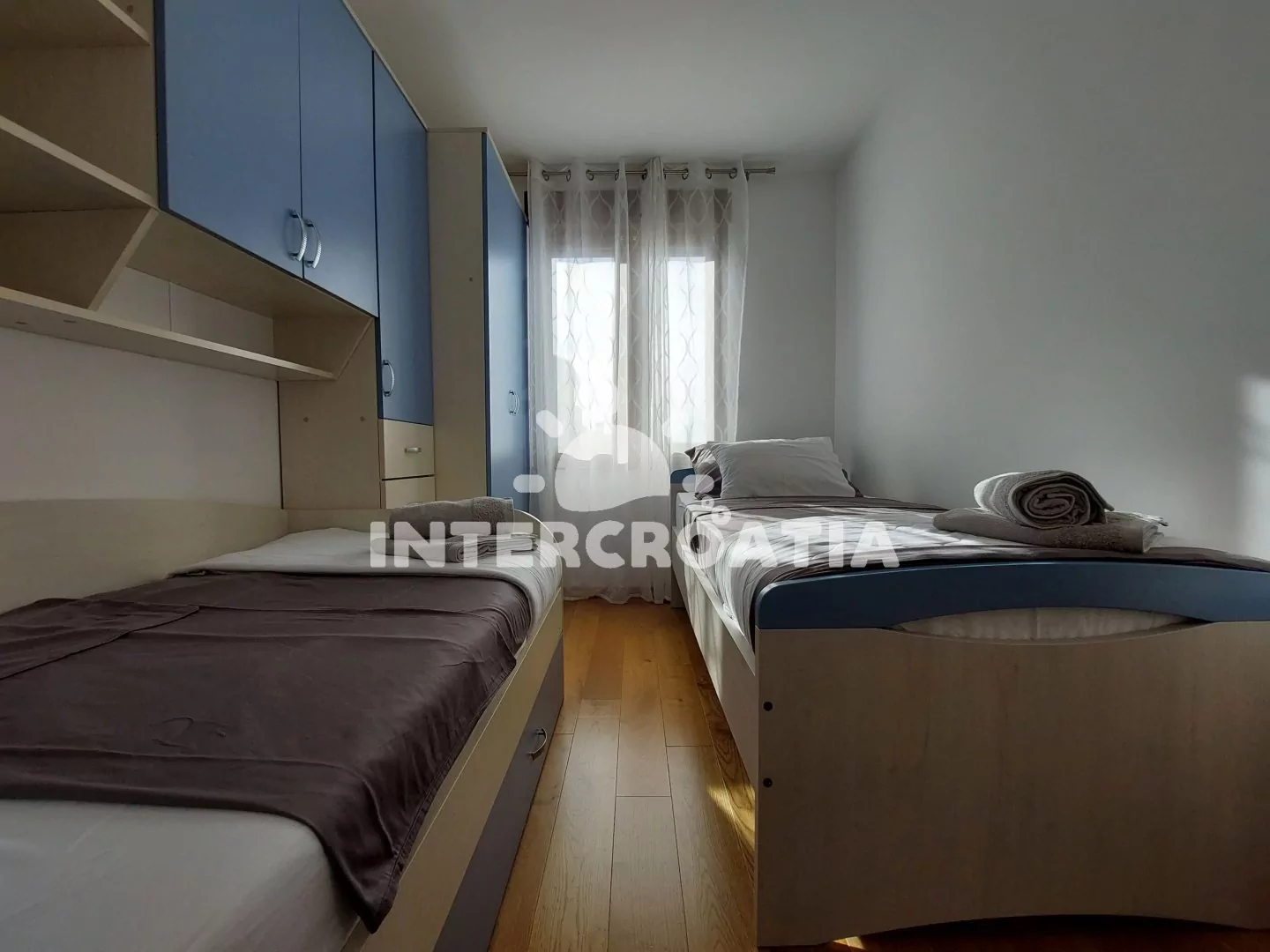 Apartmán (53 m2) s balkonem, posezením, výhledem na moře a do klidné ulice. Apartmán se nachází ve 2. patře domu, má 2 ložnice a je vhodný pro 4 osoby. Obývací pokoj je spojený s kuchyní. Kuchyňská linka je vybavena sklokeramickou varnou deskou, digestoří, vestavěnou troubou, myčkou na nádobí, rychlovarnou konvicí, mikrovlnnou troubou, kávovarem, toustovačem, nádobím a lednicí s mrazákem. Obývací pokoj s jídelním stolem pro 4 osoby, pohovkou, televizí, klimatizací a vstupem na balkon. První ložnice s jedním dvoulůžkem. Druhá ložnice s dvěma jednolůžky. Koupelna se sprchovým koutem, umyvadlem, pračkou, fénem a wc. Hostům je k dispozici parkování u domu zdarma.
