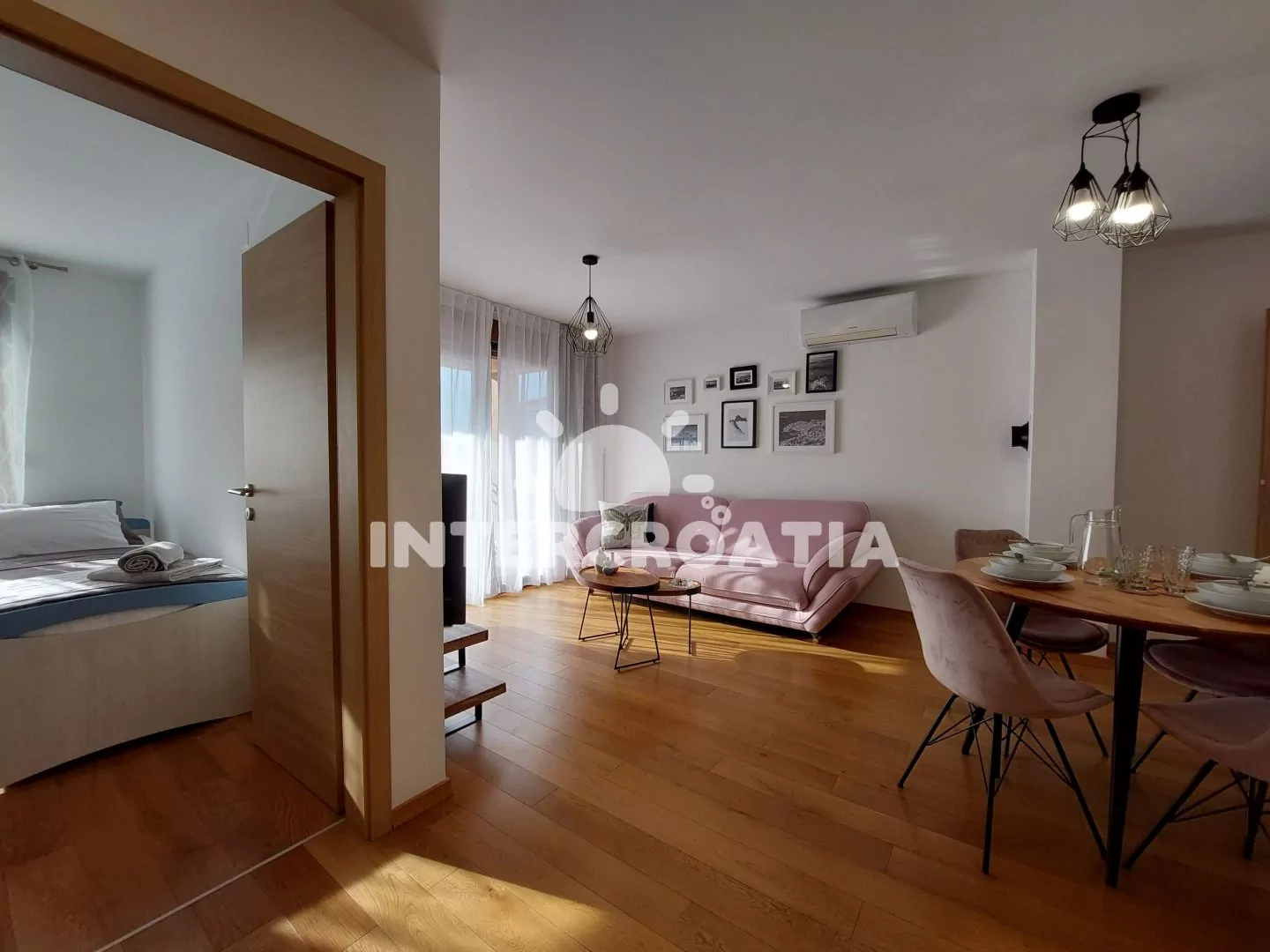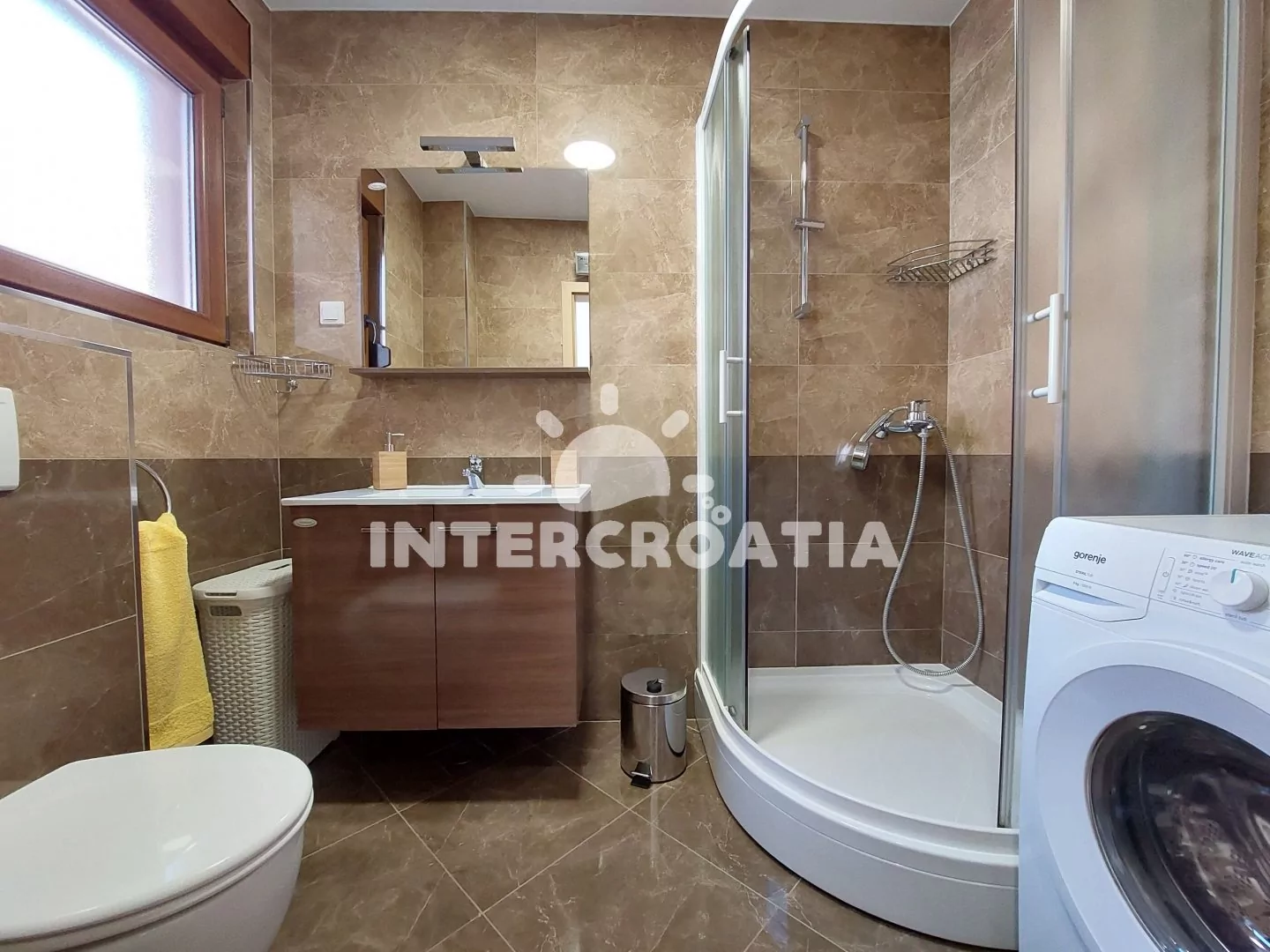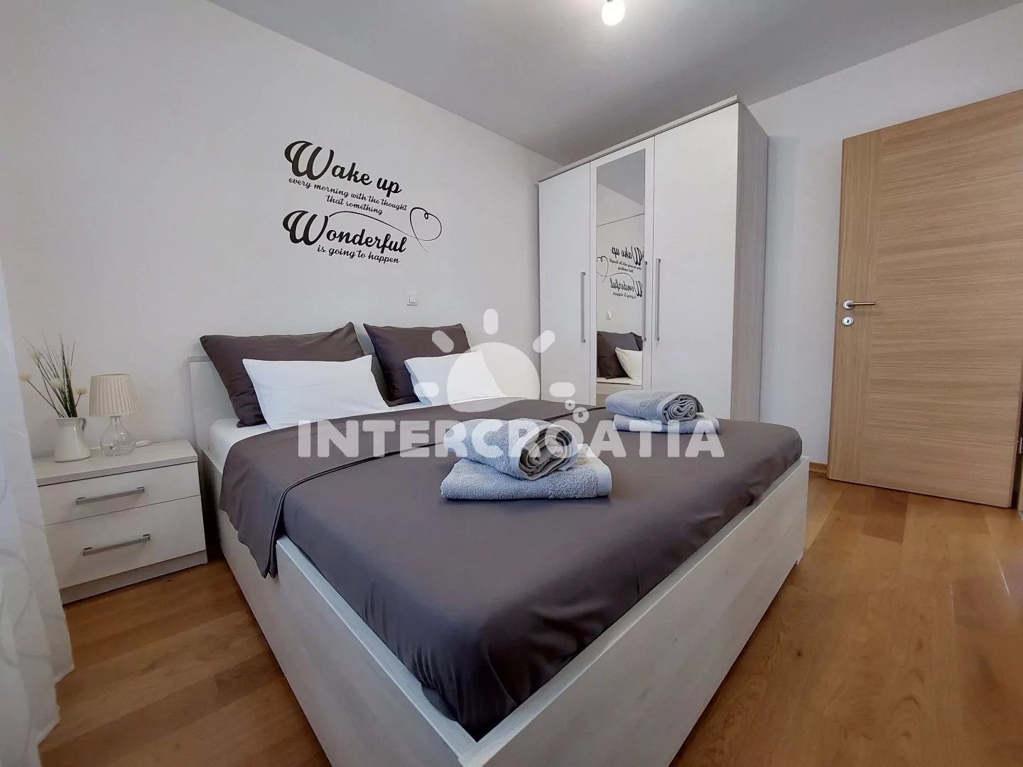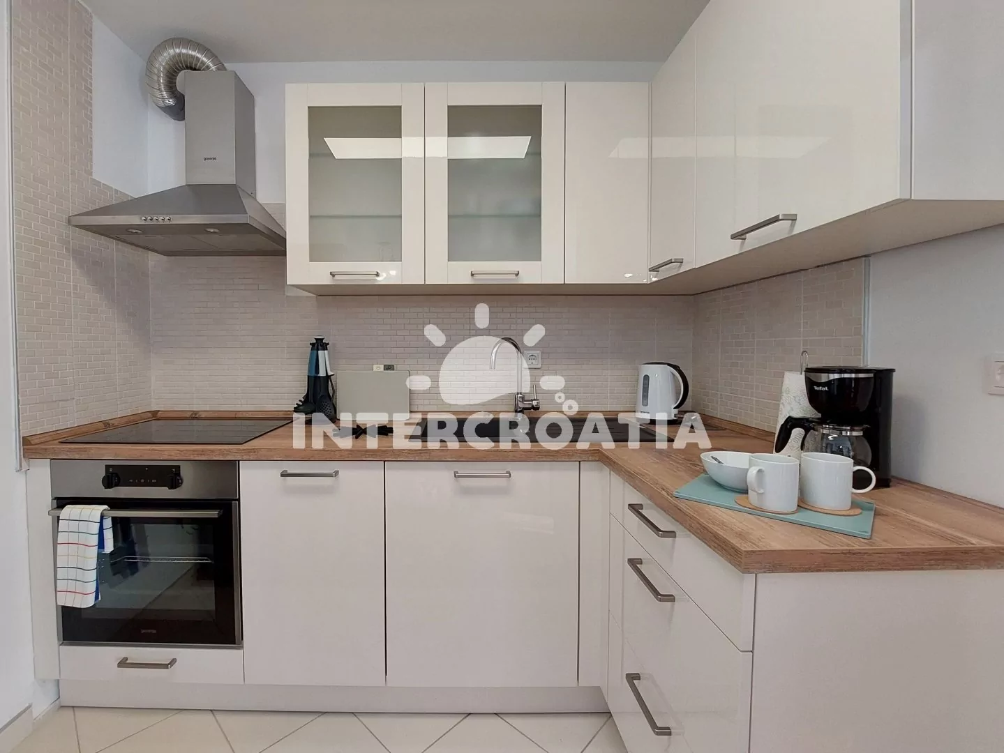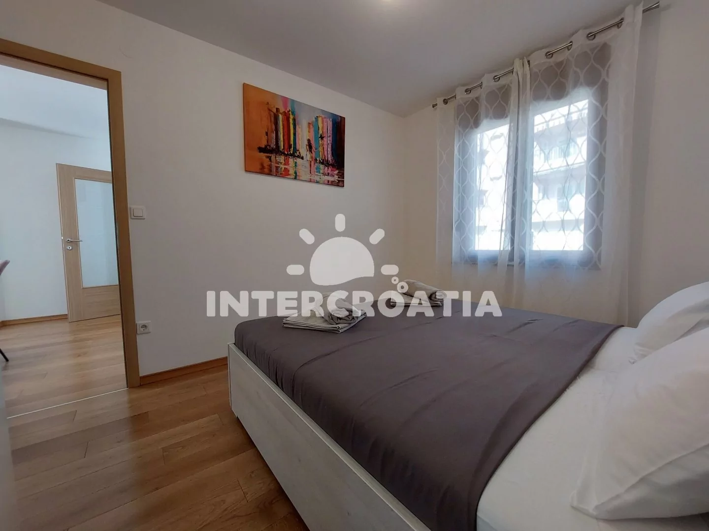 Apartmán (53 m2) s balkonem, posezením, výhledem na moře a do klidné ulice. Apartmán se nachází ve 2. patře domu, má 2 ložnice a je vhodný pro 4 osoby. Obývací pokoj je spojený s kuchyní. Kuchyňská linka je vybavena sklokeramickou varnou deskou, digestoří, vestavěnou troubou, myčkou na nádobí, rychlovarnou konvicí, mikrovlnnou troubou, kávovarem, toustovačem, nádobím a lednicí s mrazákem. Obývací pokoj s jídelním stolem pro 4 osoby, pohovkou, televizí, klimatizací a vstupem na balkon. První ložnice s jedním dvoulůžkem. Druhá ložnice s dvěma jednolůžky. Koupelna se sprchovým koutem, umyvadlem, pračkou, fénem a wc. Hostům je k dispozici parkování u domu zdarma.
