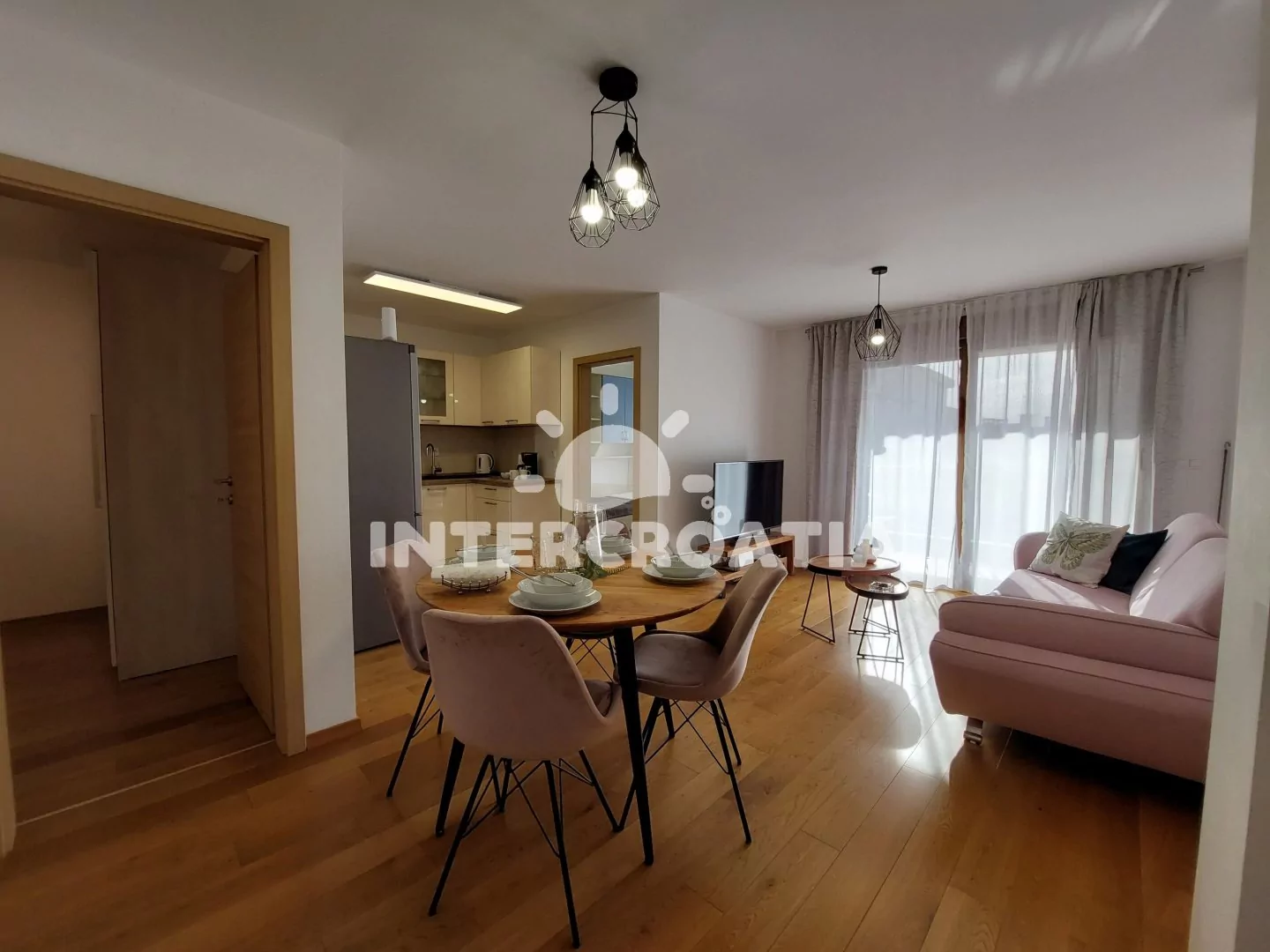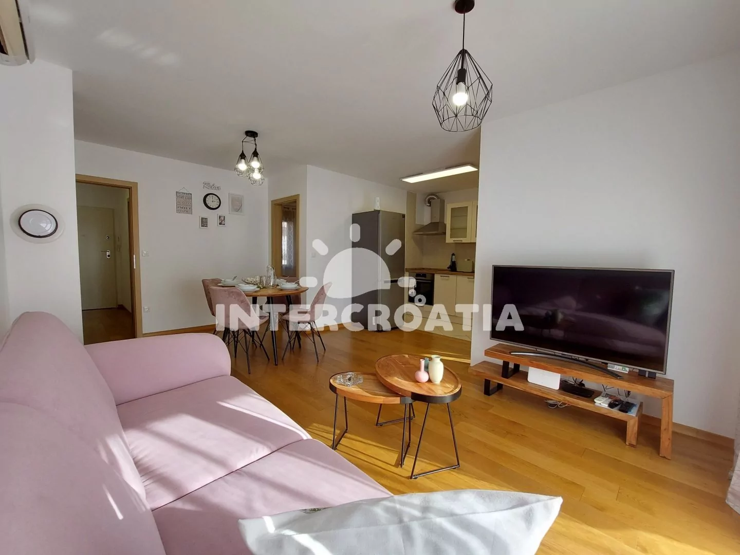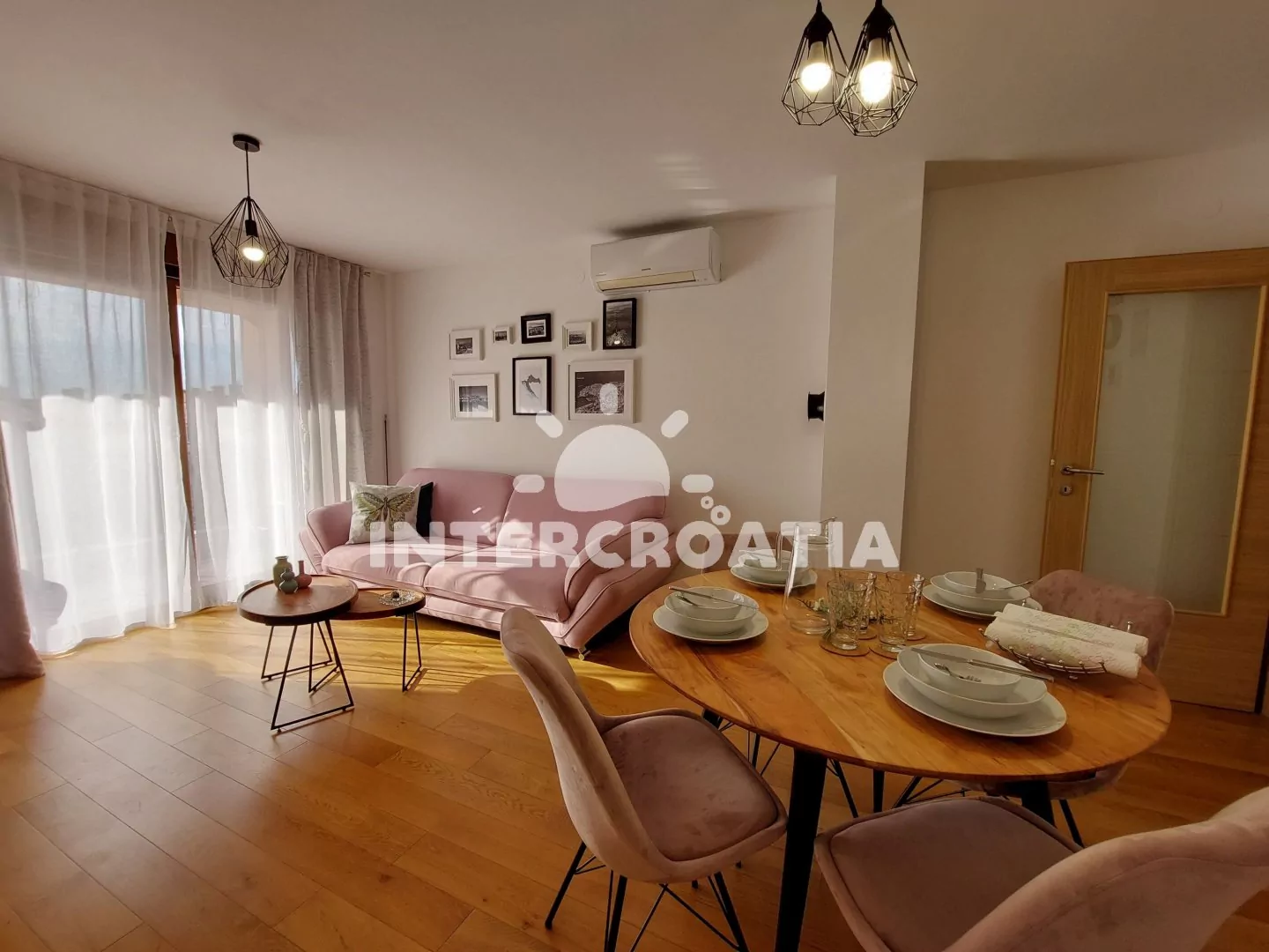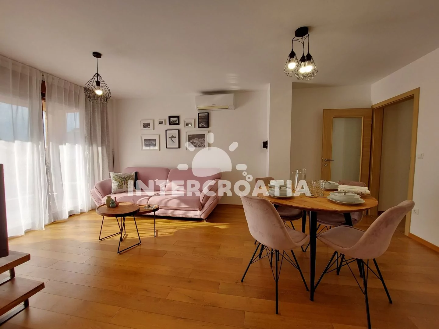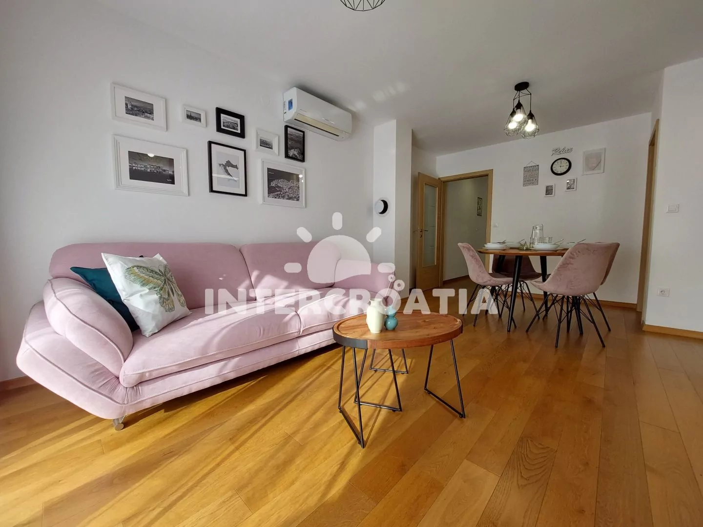Apartmán (53 m2) s balkonem, posezením, výhledem na moře a do klidné ulice. Apartmán se nachází ve 2. patře domu, má 2 ložnice a je vhodný pro 4 osoby. Obývací pokoj je spojený s kuchyní. Kuchyňská linka je vybavena sklokeramickou varnou deskou, digestoří, vestavěnou troubou, myčkou na nádobí, rychlovarnou konvicí, mikrovlnnou troubou, kávovarem, toustovačem, nádobím a lednicí s mrazákem. Obývací pokoj s jídelním stolem pro 4 osoby, pohovkou, televizí, klimatizací a vstupem na balkon. První ložnice s jedním dvoulůžkem. Druhá ložnice s dvěma jednolůžky. Koupelna se sprchovým koutem, umyvadlem, pračkou, fénem a wc. Hostům je k dispozici parkování u domu zdarma.