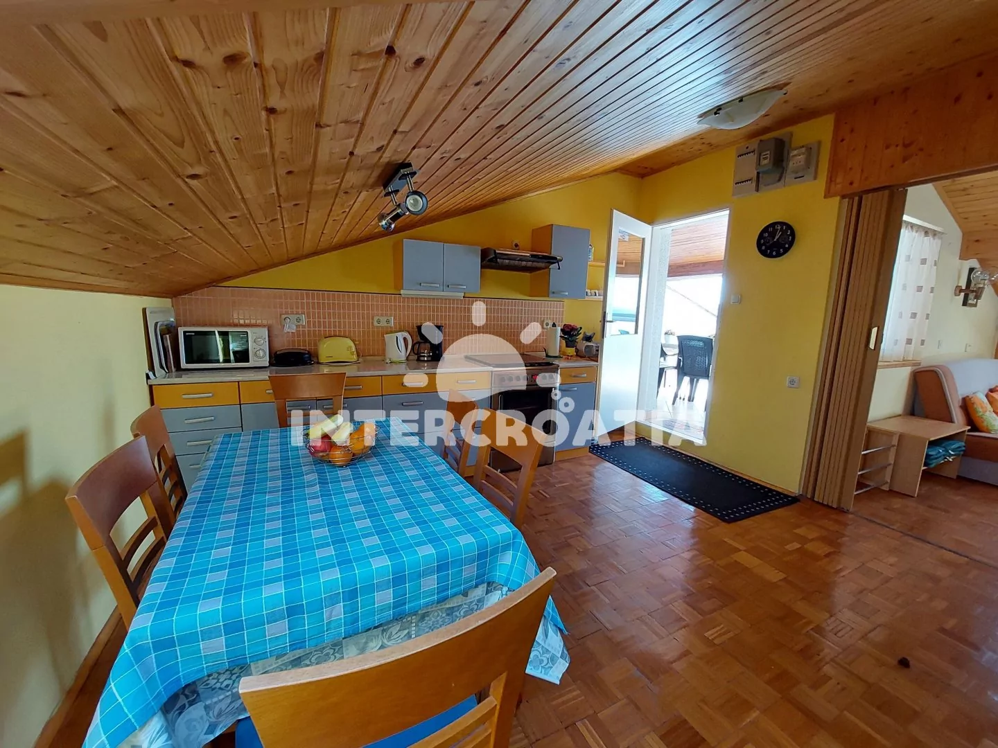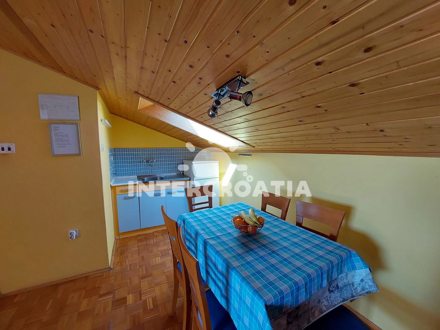 Podkrovní apartmán (50 m2) s terasou, posezením a výhledem na moře. Apartmán má 2 ložnice a je vhodný pro 4 až 5 osob. Kuchyň s jídelním stolem pro 6 osob, vstupem na terasu a kuchyňskou linkou.…