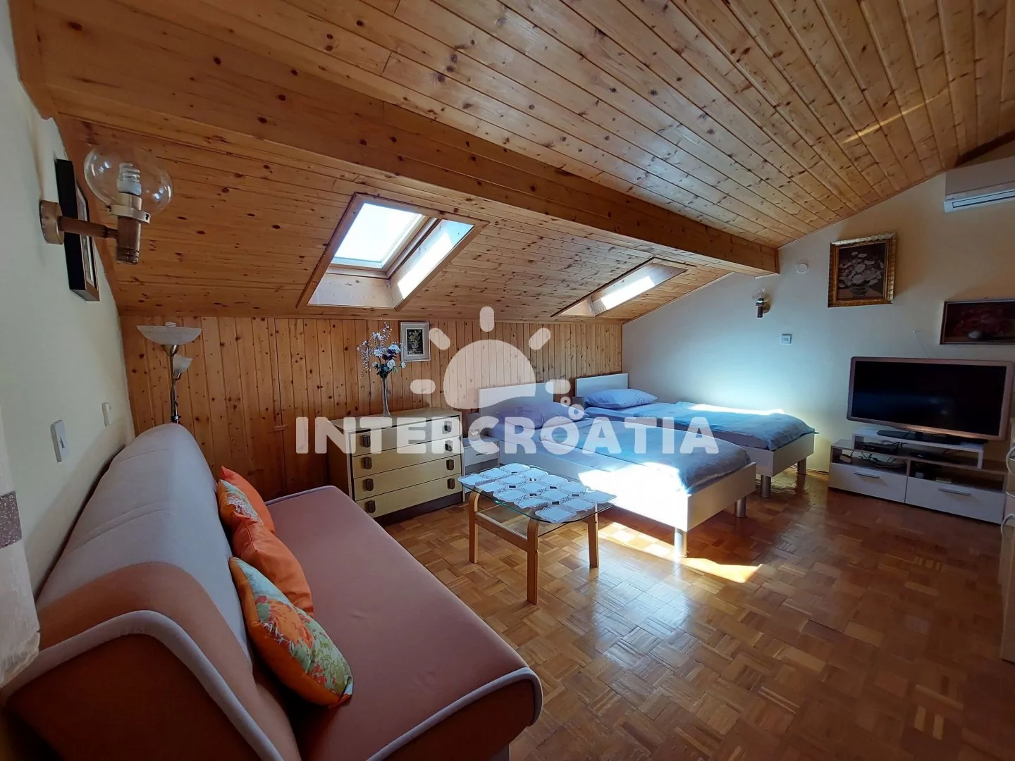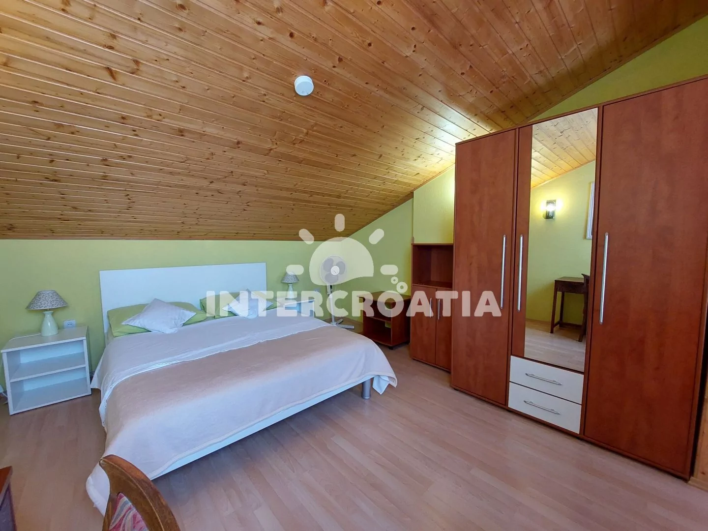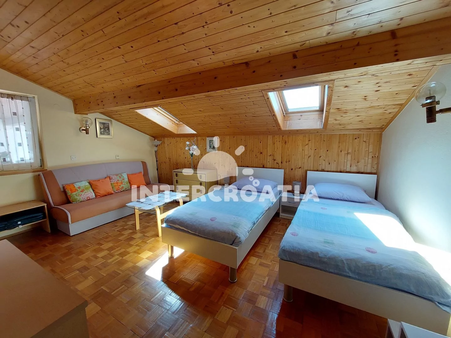 Podkrovní apartmán (50 m2) s terasou, posezením a výhledem na moře. Apartmán má 2 ložnice a je vhodný pro 4 až 5 osob. Kuchyň s jídelním stolem pro 6 osob, vstupem na terasu a kuchyňskou linkou. Kuchyňská linka je vybavena sporákem s troubou, digestoří, mikrovlnnou troubou, rychlovarnou konvicí, kávovarem, nádobím a lednicí s mrazákem. První ložnice s dvěma jednolůžky, pohovkou (rozložitelná na extra lůžko pro 1 osobu), televizí se satelitním programem, klimatizací a vstupem do druhé ložnice. Druhá ložnice je vybavena jedním dvoulůžkem. Koupelna se sprchovým koutem, umyvadlem a wc. Hostům je k dispozici parkování u objektu zdarma.