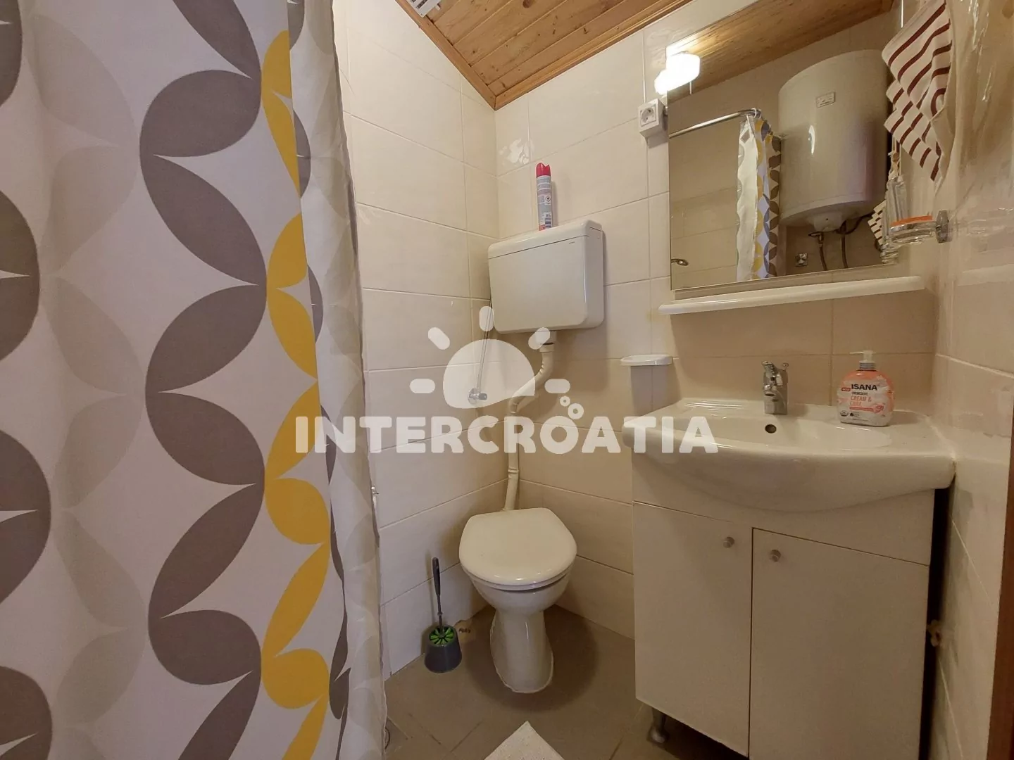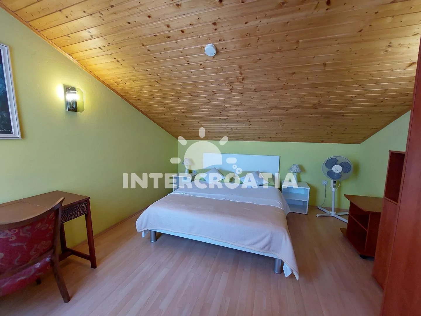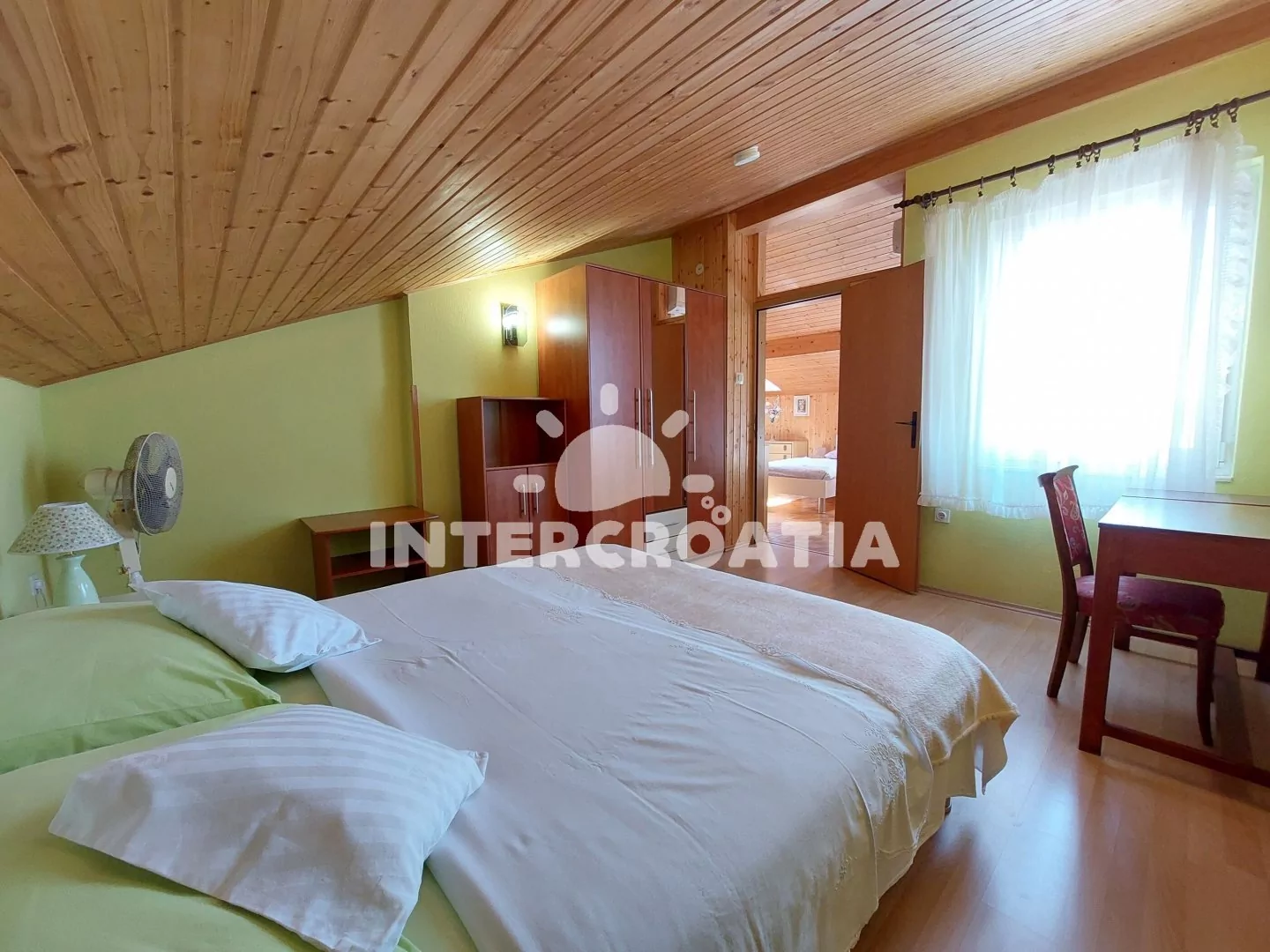Podkrovní apartmán (50 m2) s terasou, posezením a výhledem na moře. Apartmán má 2 ložnice a je vhodný pro 4 až 5 osob. Kuchyň s jídelním stolem pro 6 osob, vstupem na terasu a kuchyňskou linkou. Kuchyňská linka je vybavena sporákem s troubou, digestoří, mikrovlnnou troubou, rychlovarnou konvicí, kávovarem, nádobím a lednicí s mrazákem. První ložnice s dvěma jednolůžky, pohovkou (rozložitelná na extra lůžko pro 1 osobu), televizí se satelitním programem, klimatizací a vstupem do druhé ložnice. Druhá ložnice je vybavena jedním dvoulůžkem. Koupelna se sprchovým koutem, umyvadlem a wc. Hostům je k dispozici parkování u objektu zdarma.