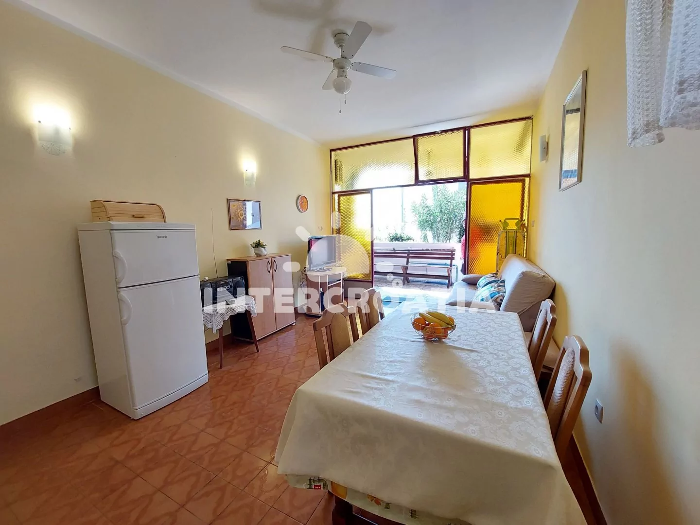 Apartmán (42 m2) s terasou, posezením, částečným výhledem na moře a do dvora se nachází v přízemí domu. Apartmán má 1 ložnici a je vhodný pro 3 až 4 osoby. Obývací pokoj je spojený s kuchyní. Kuchyňská linka je vybavena sporákem s troubou, digestoří, mikrovlnnou troubou, rychlovarnou konvicí, kávovarem, nádobím a lednicí s mrazákem. Obývací pokoj s jídelním stolem, pohovkou (rozložitelná na extra lůžko pro 1 osobu), televizí se satelitním programem a vstupem na terasu. Ložnice s dvoulůžkem, jedním jednolůžkem, pohovkou, televizí se satelitním programem, klimatizací a vstupem na terasu. Z ložnice vstup do koupelny, která je vybavena sprchovým koutem, umyvadlem a wc. Do místností se vchází z terasy apartmánu. Hostům je k dispozici parkování u objektu zdarma.