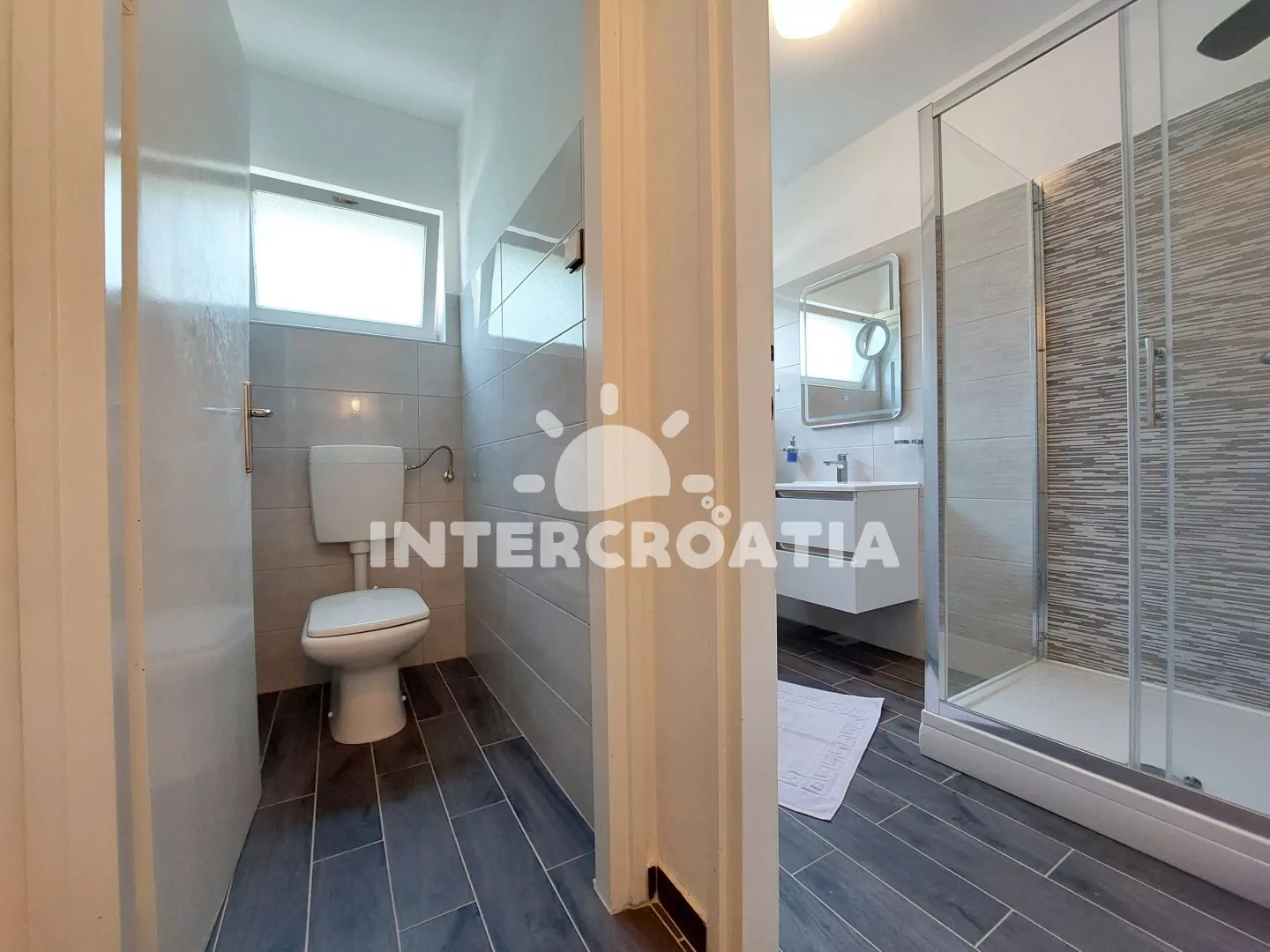 Apartmán (50 m2) s balkonem, venkovním posezením a výhledem na moře se nachází ve 2. patře domu. Apartmán má 2 ložnice a je vhodný pro až 4 osoby. Obývací místnost je spojena s kuchyní. kuchyňská linka je vybavena varnou deskou, digestoří, vestavěnou troubou, rychlovarnou konvicí, kávovarem, nádobím a lednicí s mrazákem. Obývací místnost s jídelním stolem a televizí se satelitním programem. Dále chodba s klimatizací a vstupy do ložnic. První i druhá ložnice je vybavena vždy s jedním dvoulůžkem a vstupem na balkon. Koupelna se sprchovým koutem, umyvadlem, fénem a odděleným wc. Hostům je k dispozici parkování u objektu zdarma.