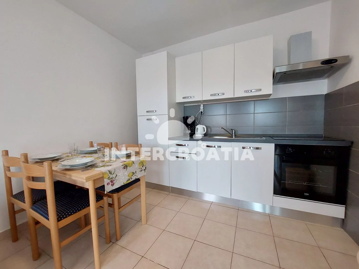 Apartmán (35 m2) s terasou, venkovním posezením a částečným výhledem na moře se nachází v přízemí domu. Apartmán má 1 ložnici a je vhodný pro 2 až 3 osoby. Obývací pokoj je spojený s kuchyní. kuchyňská linka je vybavena varnou deskou, digestoří, vestavěnou troubou, rychlovarnou konvicí, kávovarem, nádobím a lednicí s mrazákem. Obývací pokoj s jídelním stolem, pohovkou (rozložitelná na extra lůžko pro 1 osobu), televizí se satelitním programem a vstupem na terasu. Ložnice dvoulůžkem, klimatizací a vstupem na terasu. Koupelna se sprchovým koutem, umyvadlem a wc. Hostům je k dispozici parkování u objektu zdarma.