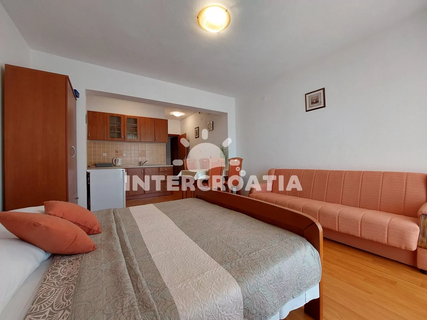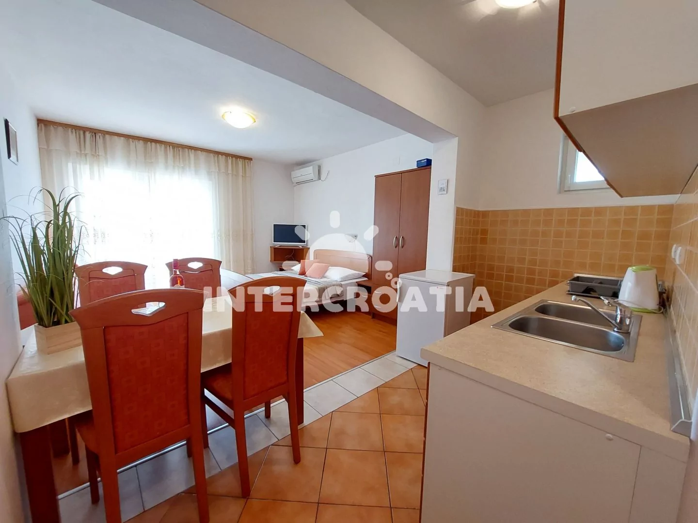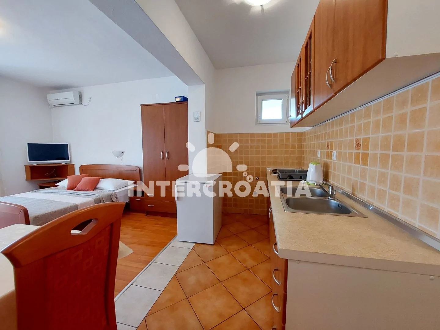 Apartmán (35 m2) typu studio s balkonem, posezením a částečným výhledem na moře se nachází v 1. patře domu. Obývací místnost je spojena s kuchyní. Kuchyňská linka je vybavena varnou deskou, rychlovarnou konvicí, toustovačem, nádobím a lednicí s mrazákem. Obývací místnost s jídelním stolem, pohovkou, televizí se satelitním programem, dvoulůžkem, klimatizací a vstupem na balkon. Koupelna se sprchovým koutem, umyvadlem, fénem a wc. Hostům je k dispozici parkování u objektu zdarma.