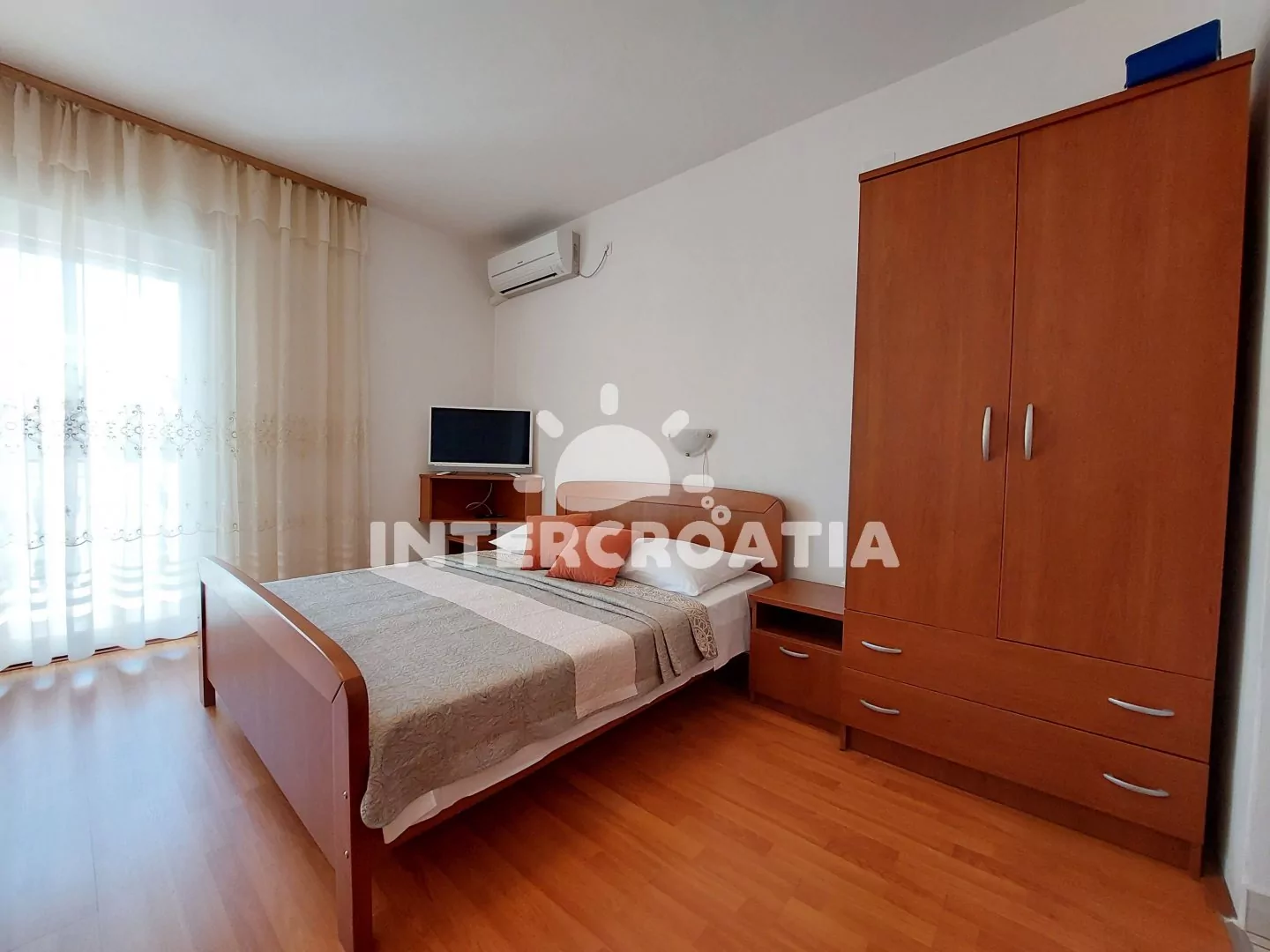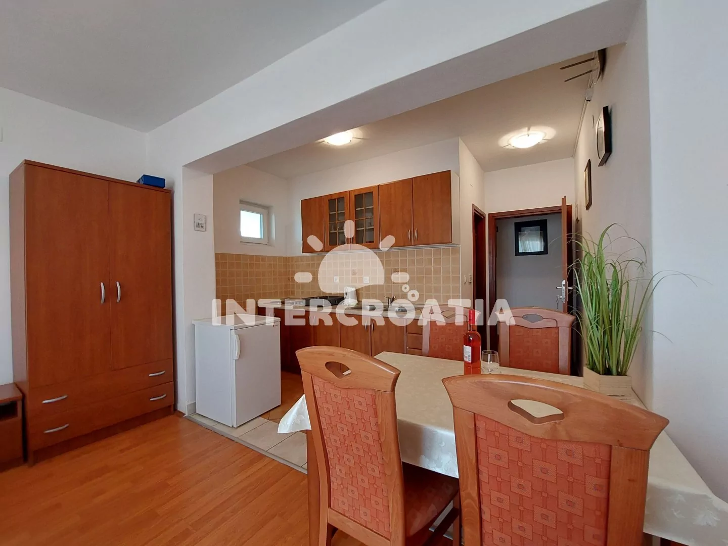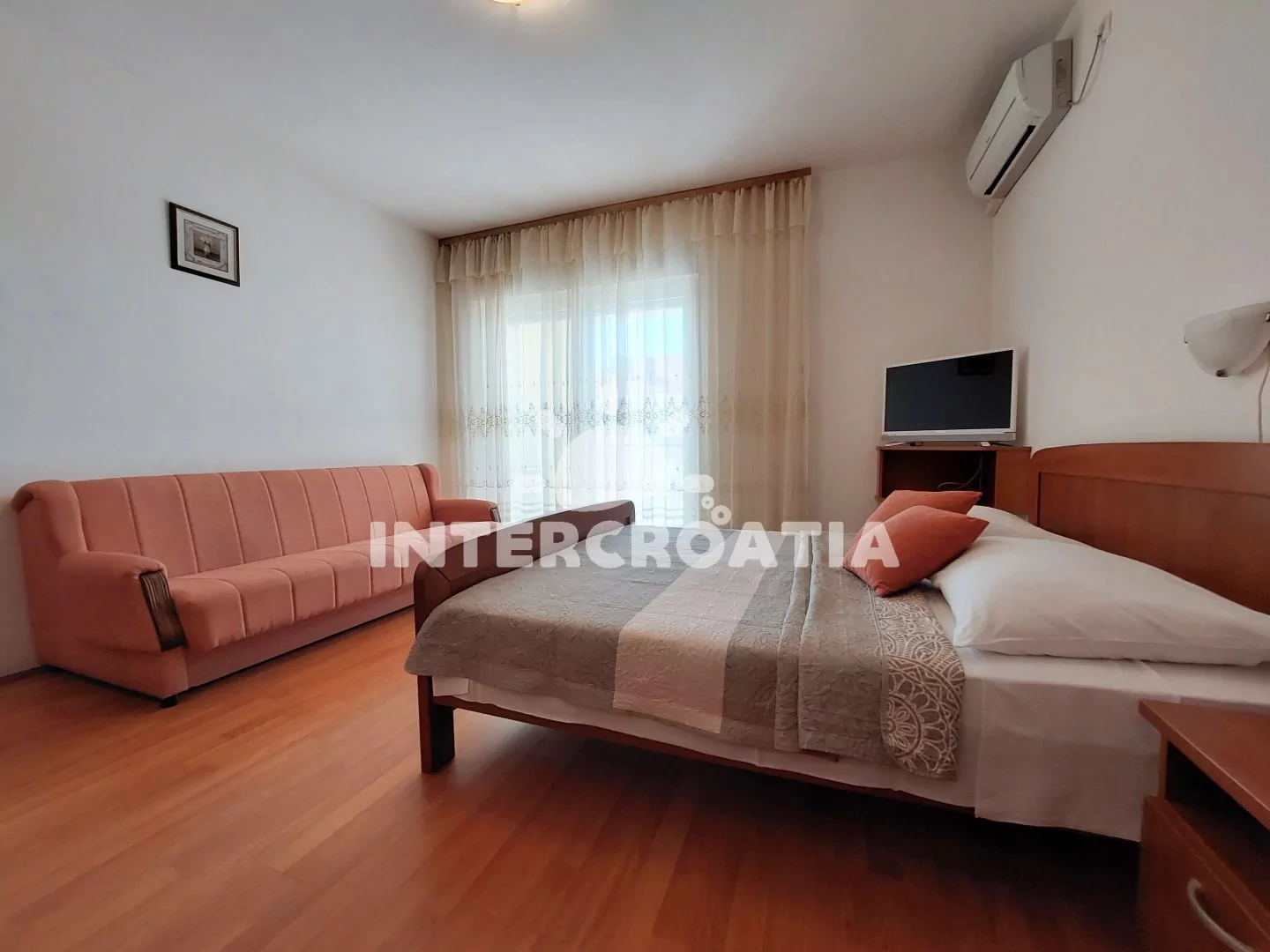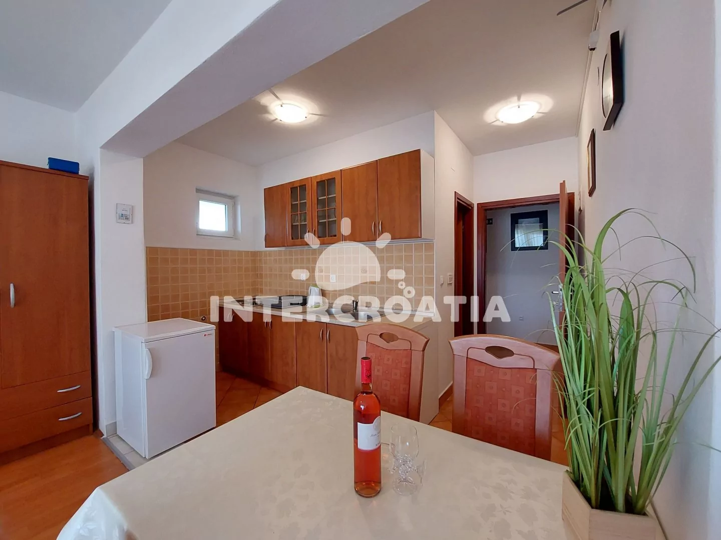 Apartmán (35 m2) typu studio s balkonem, posezením a částečným výhledem na moře se nachází v 1. patře domu. Obývací místnost je spojena s kuchyní. Kuchyňská linka je vybavena varnou deskou, rychlovarnou konvicí, toustovačem, nádobím a lednicí s mrazákem. Obývací místnost s jídelním stolem, pohovkou, televizí se satelitním programem, dvoulůžkem, klimatizací a vstupem na balkon. Koupelna se sprchovým koutem, umyvadlem, fénem a wc. Hostům je k dispozici parkování u objektu zdarma.